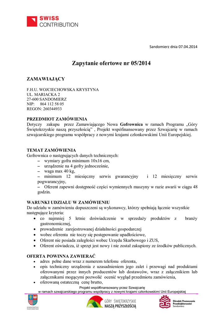 Sandomierz dnia 07.04.2014 Zapytanie ofertowe nr 05/2014 ZAMAWIAJĄCY F.H.U. WOJCIECHOWSKA KRYSTYNA UL. MARIACKA 2 27-600 SANDOMIERZ NIP: 864 112 58 05 REGON: 260344933 PRZEDMIOT ZAMÓWIENIA Dotyczy zakupu przez Zamawiającego Nowa Gofrownica w ramach Programu „Góry Świętokrzyskie naszą przyszłością” , Projekt wspófinansowany przez Szwajcarię w ramach szwajcarskiego programu współpracy z nowymi krajami członkowskimi Unii Europejskiej. TEMAT ZAMÓWIENIA Gofrownica o następujących danych technicznych: wymiary gofra minimum 10x16 cm, urządzenie na 4 gofry jednocześnie, waga max 40 kg, minimum 12 miesięczny serwis gwarancyjny i 12 miesięczny serwis pogwarancyjny, Oferent zapewni dostępność części wymiennych maszyny w razie awarii w ciągu 48 godzin. WARUNKI UDZIAŁU W ZAMÓWIENIU Do udziału w zamówieniu dopuszczeni są wykonawcy, którzy spełniają łącznie wszystkie następujące kryteria: co najmniej 5 letnie doświadczenie w sprzedaży produktów z branży gastronomicznej, prowadzenie zarejestrowanej działalności gospodarczej wobec oferenta nie toczy się postępowanie upadłościowe, Oferent nie posiada zaległości wobec Urzędu Skarbowego i ZUS, Oferent oświadcza, iż sprzęt jest nowy i nie został zakupiony ze środków publicznych. OFERTA POWINNA ZAWIERAĆ adres pełne dane wraz z numerem telefonu oferenta, opis techniczny urządzenia z uzasadnieniem jego zalet i przewagi nad produktami oferowanymi przez innych producentów lub dostawców, wraz z załącznikiem lub załącznikami mogącymi pozwolić ocenić wygląd przedmiotu zamówienia, oferowaną ostateczną cenę brutto, Projekt współfinansowany przez Szwajcarię w ramach szwajcarskiego programu współpracy z nowymi krajami członkowskimi Unii Europejskiej kopie dokumentów o wpisie do CEIDG. KRYTERIA OCENY OFERT Zamówienie powinno spełniać kryteria przedstawione w pkt. Temat zamówienia. Kryterium wyboru oferty będzie najkorzystniejsza cena brutto oferowanej przez dostawcę z uwzględnieniem kryteriów technicznych przedstawionych w zapytaniu ofertowym. Zamawiający poinformuje oferentów o wynikach postępowania dotyczącego zamówienia ofertowego nr 05/2014 za pośrednictwem strony internetowej znajdującej się pod adresem www.noclegi-sandomierz.pl , w formie papierowej. CZAS TRWANIA ZAMÓWIENIA/TERMIN WYKONANIA Oferty należy składać od dnia 09.04.2014 do dnia 19.04.2014 Termin dostawy przedmiotu zamówienia na miejsce do siedziby zamawiającego, ustala się ostatecznie na dzień maksymalnie 10.05.2014. MIEJSCE ZAMIESZCZENIA OFERTY strona internetowa www.noclegi-sandomierz.pl wysłanie drogą elektroniczną zapytanie do minimum trzech potencjalnych oferentów zamówienia. OSOBA DO KONTAKTU Wojciechowska Krystyna [email protected] F.H.U Krystyna Wojciechowska ul. Mariacka 2 27-600 Sandomierz MIEJSCE I TRYB SKŁADANIA OFERT na adres e-mail: [email protected] pocztą w formie papierowej na adres: F.H.U Krystyna Wojciechowska ul. Mariacka 2 27-600 Sandomierz z dopiskiem zapytanie ofertowe nr 05/2014 wszystkie powyższe dokumenty oferty powinny być trwale spięte. zamawiający dopuszcza składania ofert w formie elektronicznej jako szybszą komunikację z zamawiającym, jednak nie stanowi ona oferty w pełnym słowa tego znaczeniu. Złożenie oferty traktowane jest jako otrzymanie przez zamawiającego papierowej wersji odpowiedzi na zapytanie ofertowe. TERMIN SKŁADANIA OFERT Oferty należy składać do dnia 19.04.2014 (wiążące jest dostarczenie do biura siedziby zamawiającego oferty pocztą tradycyjną). Projekt współfinansowany przez Szwajcarię w ramach szwajcarskiego programu współpracy z nowymi krajami członkowskimi Unii Europejskiej INFORMACJE DODATKOWE Zamawiający, oświadcza i informuje, że niniejsze zapytanie ofertowe ma wyłącznie charakter sondażu rynku pod kątem wyboru najkorzystniejszej oferty. Złożenie ewentualnej oferty nie stwarza po stronie Oferenta roszczenia względem zamawiającego o zawarcie umowy i zastrzegamy sobie prawo wyboru oferty i zawarcia umowy z wybranym Oferentem. Projekt współfinansowany przez Szwajcarię w ramach szwajcarskiego programu współpracy z nowymi krajami członkowskimi Unii Europejskiej