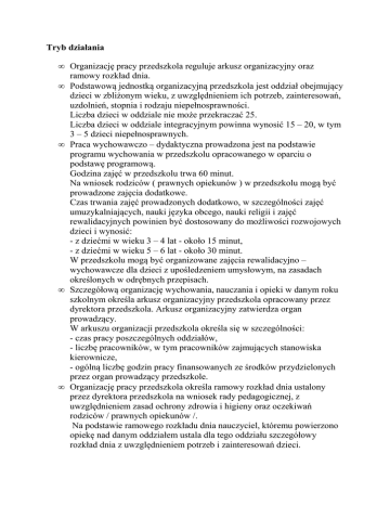 Tryb działania • Organizację pracy przedszkola reguluje arkusz organizacyjny oraz ramowy rozkład dnia. • Podstawową jednostką organizacyjną przedszkola jest oddział obejmujący dzieci w zbliżonym wieku, z uwzględnieniem ich potrzeb, zainteresowań, uzdolnień, stopnia i rodzaju niepełnosprawności. Liczba dzieci w oddziale nie może przekraczać 25. Liczba dzieci w oddziale integracyjnym powinna wynosić 15 – 20, w tym 3 – 5 dzieci niepełnosprawnych. • Praca wychowawczo – dydaktyczna prowadzona jest na podstawie programu wychowania w przedszkolu opracowanego w oparciu o podstawę programową. Godzina zajęć w przedszkolu trwa 60 minut. Na wniosek rodziców ( prawnych opiekunów ) w przedszkolu mogą być prowadzone zajęcia dodatkowe. Czas trwania zajęć prowadzonych dodatkowo, w szczególności zajęć umuzykalniających, nauki języka obcego, nauki religii i zajęć rewalidacyjnych powinien być dostosowany do możliwości rozwojowych dzieci i wynosić: - z dziećmi w wieku 3 – 4 lat - około 15 minut, - z dziećmi w wieku 5 – 6 lat - około 30 minut. W przedszkolu mogą być organizowane zajęcia rewalidacyjno – wychowawcze dla dzieci z upośledzeniem umysłowym, na zasadach określonych w odrębnych przepisach. • Szczegółową organizację wychowania, nauczania i opieki w danym roku szkolnym określa arkusz organizacyjny przedszkola opracowany przez dyrektora przedszkola. Arkusz organizacyjny zatwierdza organ prowadzący. W arkuszu organizacji przedszkola określa się w szczególności: - czas pracy poszczególnych oddziałów, - liczbę pracowników, w tym pracowników zajmujących stanowiska kierownicze, - ogólną liczbę godzin pracy finansowanych ze środków przydzielonych przez organ prowadzący przedszkole. • Organizację pracy przedszkola określa ramowy rozkład dnia ustalony przez dyrektora przedszkola na wniosek rady pedagogicznej, z uwzględnieniem zasad ochrony zdrowia i higieny oraz oczekiwań rodziców / prawnych opiekunów /. Na podstawie ramowego rozkładu dnia nauczyciel, któremu powierzono opiekę nad danym oddziałem ustala dla tego oddziału szczegółowy rozkład dnia z uwzględnieniem potrzeb i zainteresowań dzieci. • Przedszkole funkcjonuje przez cały rok szkolny, z wyjątkiem przerw ustalonych przez organ prowadzący zgodnie z ust.2 pkt.2. 1/ Dzienny czas pracy przedszkola, określa arkusz organizacyjny i jest on ustalony na wniosek dyrektora przedszkola przez organ prowadzący W ustalonym czasie, czas na realizacje podstawy programowej wychowania przedszkolnego jest nie krótszy niż 5 godzin dziennie. 2/ Terminy przerw pracy przedszkola ustala organ prowadzący na wniosek dyrektora przedszkola. Dodatkowe informacje o organizacji pracy przedszkola: - przerwy w pracy przedszkola wykorzystywane są na przeprowadzenie prac modernizacyjnych, remontowych oraz porządkowo – gospodarczych, - w organizacji pracy opiekuńczo – wychowawczej nauczyciela wspiera woźna oddziałowa poprzez pomoc w przygotowaniu zajęć, pomoc dzieciom w czynnościach samoobsługowych i higienicznych oraz udział w sprawowaniu opieki nad dziećmi podczas zajęć poza terenem przedszkola. - do realizacji zadań statutowych przedszkole posiada 4 sale zajęć, kuchnię, pomieszczenia administracyjno-gospodarcze, 3 szatnie, oraz ogród przedszkolny , z odpowiednio dobranymi urządzeniami, dostosowanymi do wieku dzieci. Zasady odpłatności za pobyt dzieci w przedszkolu i odpłatności za korzystanie z wyżywienia przez dzieci i pracowników przedszkola ustala organ prowadzący przedszkole. 1/ W przedszkolu istnieje możliwość korzystania z 1, 2 lub 3 posiłków. / śniadanie, obiad, podwieczorek /. 2/ Koszty wyżywienia dziecka w pełni pokrywane są przez rodziców bądź opiekunów. 3/ Opłaty stałe i za wyżywienie przyjmowane są w dni wyznaczone przez dyrektora nie później niż do 15-go dnia każdego miesiąca. 4/ Dzienna stawka żywieniowa ustalona jest przez dyrektora i intendenta w porozumieniu z radą rodziców. 5/ W przypadku nieobecności dziecka w przedszkolu rodzicom przysługuje zwrot wpłaty za wyżywienie. 6/ Z wyżywienia mogą również korzystać pracownicy przedszkola wnosząc opłatę w wysokości ustalonej stawki. 7/ Wysokość opłaty stałej za przedszkole oraz tryb i kryteria zwolnień z tej opłaty ustala organ prowadzący przedszkole.