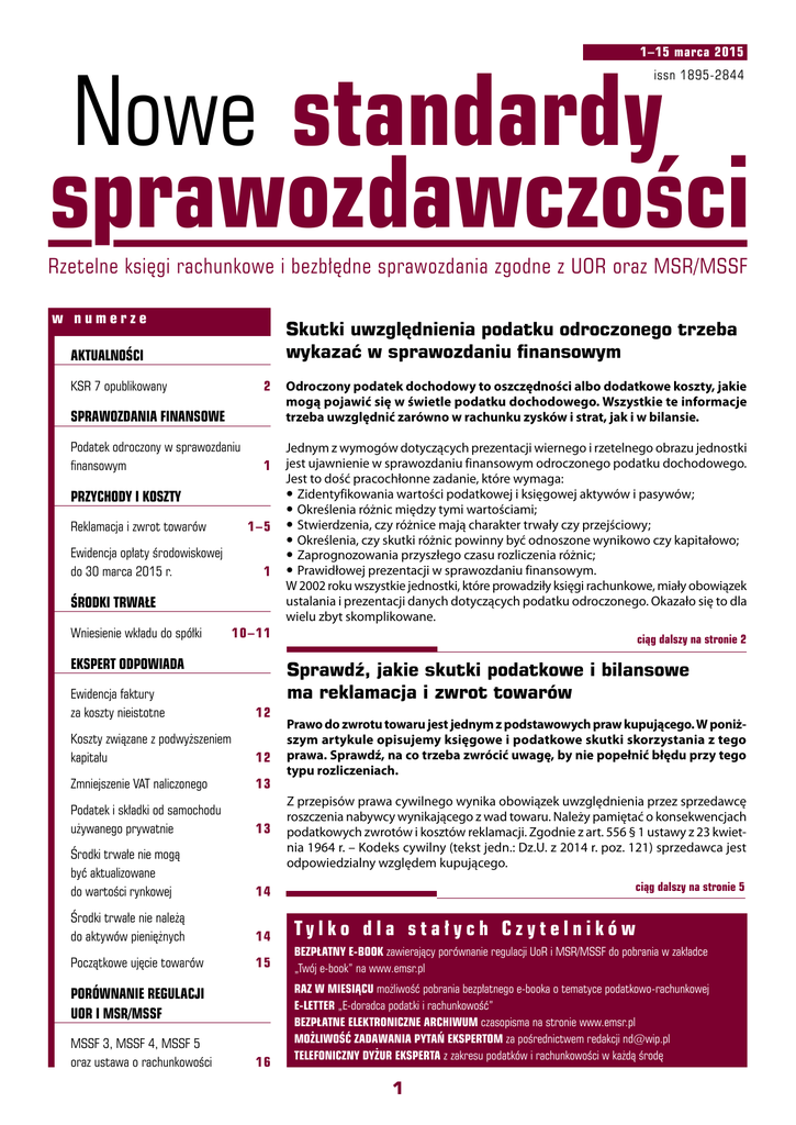 1–15 marca 2015 Nowe standardy sprawozdawczości issn 1895-2844 Rzetelne księgi rachunkowe i bezbłędne sprawozdania zgodne z UOR oraz MSR/MSSF w numerze Skutki uwzględnienia podatku odroczonego trzeba wykazać w sprawozdaniu finansowym AKTUALNOŚCI 2 KSR 7 opublikowany SPRAWOZDANIA FINANSOWE Podatek odroczony w sprawozdaniu finansowym 1 PRZYCHODY I KOSZTY Reklamacja i zwrot towarów Ewidencja opłaty środowiskowej do 30 marca 2015 r. 1–5 1 ŚRODKI TRWAŁE Wniesienie wkładu do spółki 10–11 EKSPERT ODPOWIADA Ewidencja faktury za koszty nieistotne 12 Koszty związane z podwyższeniem kapitału 12 Zmniejszenie VAT naliczonego 13 Odroczony podatek dochodowy to oszczędności albo dodatkowe koszty, jakie mogą pojawić się w świetle podatku dochodowego. Wszystkie te informacje trzeba uwzględnić zarówno w rachunku zysków i strat, jak i w bilansie. Jednym z wymogów dotyczących prezentacji wiernego i rzetelnego obrazu jednostki jest ujawnienie w sprawozdaniu finansowym odroczonego podatku dochodowego. Jest to dość pracochłonne zadanie, które wymaga: yy Zidentyfikowania wartości podatkowej i księgowej aktywów i pasywów; yy Określenia różnic między tymi wartościami; yy Stwierdzenia, czy różnice mają charakter trwały czy przejściowy; yy Określenia, czy skutki różnic powinny być odnoszone wynikowo czy kapitałowo; yy Zaprognozowania przyszłego czasu rozliczenia różnic; yy Prawidłowej prezentacji w sprawozdaniu finansowym. W 2002 roku wszystkie jednostki, które prowadziły księgi rachunkowe, miały obowiązek ustalania i prezentacji danych dotyczących podatku odroczonego. Okazało się to dla wielu zbyt skomplikowane. ciąg dalszy na stronie 2 Sprawdź, jakie skutki podatkowe i bilansowe ma reklamacja i zwrot towarów Prawo do zwrotu towaru jest jednym z podstawowych praw kupującego. W poniższym artykule opisujemy księgowe i podatkowe skutki skorzystania z tego prawa. Sprawdź, na co trzeba zwrócić uwagę, by nie popełnić błędu przy tego typu rozliczeniach. Podatek i składki od samochodu używanego prywatnie 13 Środki trwałe nie mogą być aktualizowane do wartości rynkowej Z przepisów prawa cywilnego wynika obowiązek uwzględnienia przez sprzedawcę roszczenia nabywcy wynikającego z wad towaru. Należy pamiętać o konsekwencjach podatkowych zwrotów i kosztów reklamacji. Zgodnie z art. 556 § 1 ustawy z 23 kwietnia 1964 r. – Kodeks cywilny (tekst jedn.: Dz.U. z 2014 r. poz. 121) sprzedawca jest odpowiedzialny względem kupującego. 14 ciąg dalszy na stronie 5 Środki trwałe nie należą do aktywów pieniężnych 14 Początkowe ujęcie towarów 15 PORÓWNANIE REGULACJI UOR I MSR/MSSF MSSF 3, MSSF 4, MSSF 5 oraz ustawa o rachunkowości 16 Tylko dla stałych Czytelników BEZPŁATNY E-BOOK zawierający porównanie regulacji UoR i MSR/MSSF do pobrania w zakładce „Twój e-book” na www.emsr.pl RAZ W MIESIĄCU możliwość pobrania bezpłatnego e-booka o tematyce podatkowo-rachunkowej E-LETTER „E-doradca podatki i rachunkowość” BEZPŁATNE ELEKTRONICZNE ARCHIWUM czasopisma na stronie www.emsr.pl MOŻLIWOŚĆ ZADAWANIA PYTAŃ EKSPERTOM za pośrednictwem redakcji [email protected] TELEFONICZNY DYŻUR EKSPERTA z zakresu podatków i rachunkowości w każdą środę 1 Sprawozdania finansowe W skrócie KSR 7 opublikowany W wyniku nowelizacji standardu po ustępie 3.2 dodano punkty dotyczące stosowania Krajowych Standardów Rachunkowości i MSR w związku z interpretacją art. 10 ust. 3 ustawy z 29 września 1994 r. o rachunkowości. Krajowy Standard Rachunkowości nr 7 „Zmiany zasad (polityki) rachunkowości, wartości szacunkowych, poprawianie błędów, zdarzenia następujące po dacie bilansu – ujęcie i prezentacja” został opublikowany w Dzienniku Urzędowym ministra finansów z 22 stycznia 2015 r. poz. 6. Znowelizowany KSR Nr 7 stosuje się po raz pierwszy do sprawozdań finansowych sporządzonych za rok obrotowy kończący się po dniu ogłoszenia nowelizacji, z możliwością wcześniejszego zastosowania. Komitet Standardów Rachunkowości na posiedzeniu 25 listopada 2014 r. podjął uchwałę w sprawie przyjęcia znowelizowanego Krajowego Standardu Rachunkowości Nr 7 „Zmiany zasad (polityki) rachunkowości, wartości szacunkowych, poprawianie błędów, zdarzenia następujące po dacie bilansu – ujęcie i prezentacja”. Przepis ten stanowi, że w sprawach nieuregulowanych przepisami ustawy, przyjmując zasady (politykę) rachunkowości, jednostki mogą stosować krajowe standardy rachunkowości wydane przez Komitet Standardów Rachunkowości. W przypadku braku odpowiedniego standardu krajowego jednostki, inne niż wymienione w art. 2 ust. 3, mogą stosować MSR. Standard został opublikowany w Dzienniku Urzędowym ministra finansów z 22 stycznia 2015 r. poz. 6. Znowelizowany KSR Nr 7 stosuje się po raz pierwszy do sprawozdań finansowych sporządzonych za rok obrotowy kończący się po dniu ogłoszenia nowelizacji, z możliwością wcześniejszego zastosowania. Szanowny Czytelniku Do końca marca 2015 roku trzeba uiścić opłatę za korzystanie ze środowiska za 2014 rok. Wyliczając należną opłatę, podatnik powinien wziąć pod uwagę stawki za ten okres, w któ- Skutki uwzględnienia podatku odroczonego trzeba wykazać w sprawozdaniu finansowym ciąg dalszy ze strony 1 Zezwolono więc na odstąpienie od ustalania odroczonego podatku dochodowego tym jednostkom, których roczne sprawozdanie finansowe nie podlega obowiązkowi badania i ogłaszania w myśl art. 64 ust. 1 uor ustawy, pod warunkiem że nie zniekształci to obrazu ich sytuacji majątkowej i finansowej. Zatem muszą o tym pamiętać podmioty kontynuujące działalność: 1) banki oraz zakłady ubezpieczeń, 2) jednostki działające na podstawie przepisów o obrocie papierami wartościowymi oraz przepisów o funduszach inwestycyjnych, 3) jednostki działające na podstawie przepisów o organizacji i funkcjonowaniu funduszy emerytalnych, 4) sp