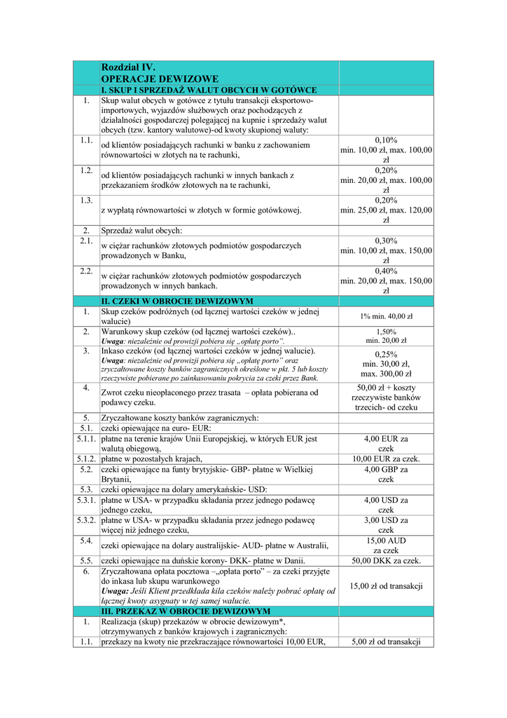 Rozdział IV. OPERACJE DEWIZOWE 1. 1.1. 1.2. I. SKUP I SPRZEDAŻ WALUT OBCYCH W GOTÓWCE Skup walut obcych w gotówce z tytułu transakcji eksportowoimportowych, wyjazdów służbowych oraz pochodzących z działalności gospodarczej polegającej na kupnie i sprzedaży walut obcych (tzw. kantory walutowe)-od kwoty skupionej waluty: od klientów posiadających rachunki w banku z zachowaniem równowartości w złotych na te rachunki, od klientów posiadających rachunki w innych bankach z przekazaniem środków złotowych na te rachunki, 1.3. z wypłatą równowartości w złotych w formie gotówkowej. 2. Sprzedaż walut obcych: 2.1. w ciężar rachunków złotowych podmiotów gospodarczych prowadzonych w Banku, 2.2. 1. 2. w ciężar rachunków złotowych podmiotów gospodarczych prowadzonych w innych bankach. II. CZEKI W OBROCIE DEWIZOWYM Skup czeków podróżnych (od łącznej wartości czeków w jednej walucie) Warunkowy skup czeków (od łącznej wartości czeków).. Uwaga: niezależnie od prowizji pobiera się „opłatę porto”. 3. Inkaso czeków (od łącznej wartości czeków w jednej walucie). Uwaga: niezależnie od prowizji pobiera się „opłatę porto” oraz zryczałtowane koszty banków zagranicznych określone w pkt. 5 lub koszty rzeczywiste pobierane po zainkasowaniu pokrycia za czeki przez Bank. 4. Zwrot czeku nieopłaconego przez trasata – opłata pobierana od podawcy czeku. 5. Zryczałtowane koszty banków zagranicznych: 5.1. czeki opiewające na euro- EUR: 5.1.1. płatne na terenie krajów Unii Europejskiej, w których EUR jest walutą obiegową, 5.1.2. płatne w pozostałych krajach, 5.2. czeki opiewające na funty brytyjskie- GBP- płatne w Wielkiej Brytanii, 5.3. czeki opiewające na dolary amerykańskie- USD: 5.3.1. płatne w USA- w przypadku składania przez jednego podawcę jednego czeku, 5.3.2. płatne w USA- w przypadku składania przez jednego podawcę więcej niż jednego czeku, 5.4. czeki opiewające na dolary australijskie- AUD- płatne w Australii, 5.5. czeki opiewające na duńskie korony- DKK- płatne w Danii. 6. Zryczałtowana opłata pocztowa –„opłata porto” – za czeki przyjęte do inkasa lub skupu warunkowego Uwaga: Jeśli Klient przedkłada kila czeków należy pobrać opłatę od łącznej kwoty asygnaty w tej samej walucie. III. PRZEKAZ W OBROCIE DEWIZOWYM 1. Realizacja (skup) przekazów w obrocie dewizowym*, otrzymywanych z banków krajowych i zagranicznych: 1.1. przekazy na kwoty nie przekraczające równowartości 10,00 EUR, 0,10% min. 10,00 zł, max. 100,00 zł 0,20% min. 20,00 zł, max. 100,00 zł 0,20% min. 25,00 zł, max. 120,00 zł 0,30% min. 10,00 zł, max. 150,00 zł 0,40% min. 20,00 zł, max. 150,00 zł 1% min. 40,00 zł 1,50% min. 20,00 zł 0,25% min. 30,00 zł, max. 300,00 zł 50,00 zł + koszty rzeczywiste banków trzecich- od czeku 4,00 EUR za czek 10,00 EUR za czek. 4,00 GBP za czek 4,00 USD za czek 3,00 USD za czek 15,00 AUD za czek 50,00 DKK za czek. 15,00 zł od transakcji 5,00 zł od transakcji 1.2. przelewy SEPA**** 1.3. przelewy regulowane***, 1.4. polecenia wypłaty** z dyspozycją kosztów „BEN” lub „SHA” 2. Zwrot nie podjętej kwoty przekazu. Uwaga: w przypadku poleceń wypłaty, dodatkowo pobiera się opłatę SWIFT- ową. 3. Zlecenie poszukiwania przekazu/ postępowanie wyjaśniające wykonane na zlecenie klienta. Uwaga: opłaty nie pobiera się, jeśli przyczyną postępowania wyjaśniającego był błąd Banku. 4. Realizacja (sprzedaż) przekazów w obrocie dewizowym: 4.1. przekazy pomiędzy rachunkami walutowymi prowadzonymi w Grupie BPS 4.2. przelewy SEPA****, 4.3. przelewy regulowane***, 4.4. polecenia wypłaty** Uwaga :niezależnie od prowizji pobiera się opłatę SWIFT- ową oraz zryczałtowane koszty banków pośredniczących określone w pkt 7, w przypadku opcji kosztowej „OUR”. 5. 15,00 zł od transakcji 20,00 zł od transakcji 0,10% min.20,00 zł, max. 100,00 zł 0,15% min. 20,00 zł, max. 100,00 zł 75,00 zł + koszty banków trzecich- za zlecenie 10,00 zł 15,00 zł od transakcji 40,00 zł od transakcji 0,30% min. 30,00 zł, max. 300,00 zł Realizacja (sprzedaż) przekazów w obrocie dewizowym w niestandardowym trybie: Uwaga: opłatę pobiera się niezależnie od prowizji pobieranej zgodnie z pkt. 4.3. i 4.4. 5.1. w EUR, USD i GBP w trybie „pilnym” 5.2. w USD, GBP i PLN w trybie „przyspieszonym” 6. Zmiany/korekty/odwołania zrealizowanego przekazu, wykonane na zlecenie Klienta. Zryczałtowane koszty banków pośredniczących pobierane „z góry” od poleceń wypłaty*****: 7.1. przy kwotach nie przekraczających EUR 5.000,00 lub jej równowartości w innej walucie wymienialnej, 7.2. przy kwotach przekraczających EUR 5.000,00lub ich równowartości w innej walucie wymienialnej, 8. Wydanie na prośbę Klienta zaświadczenia potwierdzającego wykonanie przekazu. 9. Opłata „Non-STP” Uwaga: Opłatę pobiera się niezależnie od prowizji pobieranej zgodnie z pkt. 1.4. i 4.4. Opłata pobierana jest w sytuacji, gdy zleceniodawca nie określi w zleceniu wykonania polecenia wypłaty: kodu BIC banku beneficjenta lub numeru rachunku bankowego beneficjenta w strukturze IBAN, gdy polecenie wypłaty jest kierowane do kraju, w którym ten standard obowiązuje. 100,00 zł od transakcji 80,00 zł od transakcji 75,00 zł + koszty banków trzecich- od transakcji 7. 50,00 zł od transakcji 80,00 zł od transakcji 10,00 zł 30,00 zł od transakcji *Przekaz w obrocie dewizowym: 1. Przekaz w obrocie dewizowym jest to polecenie wypłaty, przelew regulowany i przelew SEPA. **Polecenie wypłaty: 2. Skierowana do lub otrzymana z innego banku krajowego lub zagranicznego, za pośrednictwem systemu S.W.I.F.T, SORBNET - EURO lub EuroELIXIR instrukcja płatnicza polecająca dokonanie wypłaty lub przelewu określonej kwoty pieniężnej na rzecz wskazanego odbiorcy (beneficjenta). ***Przelew regulowany: 3. Przelew regulowany- polecenie przelewu dokonywana przez Klienta polskiego banku na rachunek bene