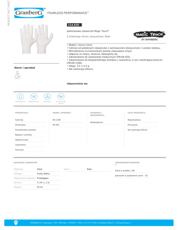PRODUCT FACT SHEET 114.620 Jednorazowe rękawiczki Magic Touch® Z miękkiego nitrylu, bezpudrowe. Białe • Miękki i mocny nitryl. • Cieńsze od podobnych rekawiczek z zachowaniem elastyczności i czułości lateksu. • Mikrotekstura na koniuszkach palców ulepszajaca chwyt. • Odporne na smary, tłuszcze, detergenty itp. • Zatwierdzone do zastosowań medycznych (PN-EN 455). • Zatwierdzone do bezpośredniego kontaktu z żywnością, w tym zawierającą tłuszcze (PN-EN 1186). • Waga: 3,5 ± 0,5 g • Nie zawierają silikonu. Norm i aprobat EN 1186 Odpowiednie do: Wodoodporne Bezproszkowe Precyzyjne Nie zawierają silikonu PRZEMYSŁU: NORM I APROBAT: Catering EN 1186 OCHRONY I ODPORNOŚCI: CECH PRODUKTU: Bezproszkowe Wodoodporne Dentystyka EN 455 Precyzyjne Przetwórstwo żywności Nie zawierają silikonu Badania i kontrola Więziennictwo Laboratoria Farmacja SZCZEGÓŁY JEDNOSTKI Materiału : Nitryl Uchwytu : Suchy, Mokry PAKOWANIE/TRANSPOR T Kolor : Biały Sztuk w pudełku: 100 Jednostek w opakowaniu zewn. : 10 Dopasowanie rękawicy : Przylegające Rozmiar : S | M | L | XL Długość : 25 cm GRANBERG AS • Bjoavegen 1442 • 5584 Bjoa • NORWAY • Office: +47 53 77 53 00 • [email protected] • www.granberg.no