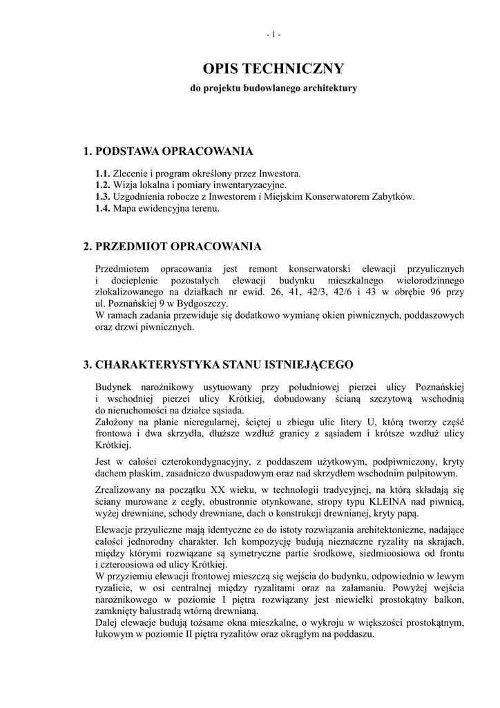 -1- OPIS TECHNICZNY do projektu budowlanego architektury 1. PODSTAWA OPRACOWANIA 1.1. Zlecenie i program określony przez Inwestora. 1.2. Wizja lokalna i pomiary inwentaryzacyjne. 1.3. Uzgodnienia robocze z Inwestorem i Miejskim Konserwatorem Zabytków. 1.4. Mapa ewidencyjna terenu. 2. PRZEDMIOT OPRACOWANIA Przedmiotem opracowania jest remont konserwatorski elewacji przyulicznych i docieplenie pozostałych elewacji budynku mieszkalnego wielorodzinnego zlokalizowanego na działkach nr ewid. 26, 41, 42/3, 42/6 i 43 w obrębie 96 przy ul. Poznańskiej 9 w Bydgoszczy. W ramach zadania przewiduje się dodatkowo wymianę okien piwnicznych, poddaszowych oraz drzwi piwnicznych. 3. CHARAKTERYSTYKA STANU ISTNIEJĄCEGO Budynek narożnikowy usytuowany przy południowej pierzei ulicy Poznańskiej i wschodniej pierzei ulicy Krótkiej, dobudowany ścianą szczytową wschodnią do nieruchomości na działce sąsiada. Założony na planie nieregularnej, ściętej u zbiegu ulic litery U, którą tworzy część frontowa i dwa skrzydła, dłuższe wzdłuż granicy z sąsiadem i krótsze wzdłuż ulicy Krótkiej. Jest w całości czterokondygnacyjny, z poddaszem użytkowym, podpiwniczony, kryty dachem płaskim, zasadniczo dwuspadowym oraz nad skrzydłem wschodnim pulpitowym. Zrealizowany na początku XX wieku, w technologii tradycyjnej, na którą składają się ściany murowane z cegły, obustronnie otynkowane, stropy typu KLEINA nad piwnicą, wyżej drewniane, schody drewniane, dach o konstrukcji drewnianej, kryty papą. Elewacje przyuliczne mają identyczne co do istoty rozwiązania architektoniczne, nadające całości jednorodny charakter. Ich kompozycję budują nieznaczne ryzality na skrajach, między którymi rozwiązane są symetryczne partie środkowe, siedmioosiowa od frontu i czteroosiowa od ulicy Krótkiej. W przyziemiu elewacji frontowej mieszczą się wejścia do budynku, odpowiednio w lewym ryzalicie, w osi centralnej między ryzalitami oraz na załamaniu. Powyżej wejścia narożnikowego w poziomie I piętra rozwiązany jest niewielki prostokątny balkon, zamknięty balustradą wtórną drewnianą. Dalej elewacje budują tożsame okna mieszkalne, o wykroju w większości prostokątnym, łukowym w poziomie II piętra ryzalitów oraz okrągłym na poddaszu. -2- Na parterze, po obu stronach ryzalitu narożnikowego okna są częściowo przetworzone, łączone po dwa. Całości dopełniają elementy detalu, na które składają się: − wysunięty cokół, − pola wnękowe obejmujące otwory okienne i drzwiowe w ryzalitach, w tym w poziomie I piętra wzbogacone pilastrami i półkolumnami, − opaski wnękowe wokół otworów okiennych w poziomie parteru, między ryzalitami oraz wokół okien łukowych w poziomie II piętra ryzalitów, − gzyms okapowy. Elewacje szczytowe skrzydeł oraz podwórzowe są oszczędne w formie. Charakterystycznymi elementami są tu zagłębienia na planie połowy sześciokąta na połączeniu skrzydeł z budynkiem głównym, zabudowane w przyziemiu kioskami zejściowymi do piwnicy, wysunięty, ścięty na narożnikach pion klatki schodowej, kryty niezależnym dachem wielospadowym, ponadto długi prostokątny balkon, zamknięty w poziomie I piętra w szczycie skrzydła zachodniego balustradą ażurową stalową. Z detali powtórzony jest tu gzyms cokołowy i attykowy. Budynek był poddawany interwencyjnym robotom remontowym, w ramach których m.in. naprawiono dach i kominy, wymieniono obróbki przydachowe i rynny, wymieniono stolarkę okienną w klatkach schodowych i większość stolarki okiennej mieszkalnej, wymieniono drzwi, z wyjątkiem piwnicznych i szczytowych. Aktualny stan techniczny zasadniczych elementów konstrukcji nośnej jest średni. W takcie oględzin nie stwierdzono ugięć, ani pęknięć, które wskazywałyby na nierównomierne osiadanie. Stwierdzono natomiast zniszczenia wypraw i wykończeń elewacyjnych wynikające z wieku budynku i jego naturalnego zużycia. Budynek charakteryzuje się ponadto wysokim zapotrzebowaniem na ciepło, gdyż jego elewacje oraz niewymieniona stolarka nie spełniają aktualnych wymogów w zakresie izolacyjności termicznej. Niezależnie od stwierdzonych wad, stan techniczny elewacji pozwala na przeprowadzenie projektowanego zakresu robót remontowych i dociepleniowych. 4. STAN PRAWNY Budynek stanowi własność Wspólnoty Mieszkaniowej POZNAŃSKA 9. 5. ZAKRES OGÓLNY PRAC • remont i wyłożenie płytami kamiennymi cokołu elewacji przyulicznych, • remont konserwatorski ścian nadziemia elewacji przyulicznych z naprawą detali, • remont i docieplenie cokołu i nadziemia pozostałych ścian budynku, tj. elewacji szczytowych i podwórzowych oraz na granicy zachodniej powyżej dachów nieruchomości sąsiada, • wymiana okien piwnicznych z częściową przebudową i uporządkowaniem wielkości otworów oraz likwidacją fosy i studzienki, • wymiana okien poddaszowych, • wymiana drzwi w kioskach wejściowych do piwnicy, -3- • remont balkonów, • wszelkie prace uzupełniające wynikające z zadania, jak przełożenie rozprowadzeń instalacyjnych na elewacjach, wymiana blacharki, konserwacja elementów drewnianych i stalowych, naprawa i uzupełnienie nawierzchni przyściennych, wymiana akcesoriów elewacyjnych, itp. 6. WARUNKI OCHRONY PRZECIWPOŻAROWEJ Obiekt kwalifikuje się do kategorii ZLIV zagrożenia ludzi oraz z uwagi na wysokość nieprzekraczającą z poddaszem czterech kondygnacji, do budynków niskich (N). Zaproponowane w projekcie systemy ociepleniowe CERETHERM PREMIUM (na styropianie) i CERETHERM WOOL PREMIUM (na wełnie mineralnej) firmy Ceresit posiadające Aprobaty Instytutu Techniki Budowlanej odpowiednio numer AT-156986/2008 i AT-15-7099/2008. System CERETHERM PREMIUM przy grubości styropianu nie większej niż 20,0 cm, sklasyfikowany jest jako nierozprzestrzeniający ognia (NRO). Stosowany jest do wysokości 25,0 m nad poziomem terenu. System CERETHERM WOOL PREMIUM sklasyfikowany jest jako n