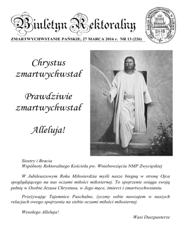 Biuletyn Rektoralny ZMARTWYCHWSTANIE PAŃSKIE, 27 MARCA 2016 r. NR 13 (226) Chrystus zmartwychwstał Prawdziwie zmartwychwstał Alleluja! Siostry i Bracia Wspólnoty Rektoralnego Kościoła pw. Wniebowzięcia NMP Zwycięskiej W Jubileuszowym Roku Miłosierdzia myśli nasze biegną w stronę Ojca spoglądającego na nas oczami miłości miłosiernej. To spojrzenie osiąga swoją pełnię w Osobie Jezusa Chrystusa, w Jego męce, śmierci i zmartwychwstaniu. Przeżywając Tajemnice Paschalne, życzmy sobie nawzajem w naszych relacjach owego spojrzenia na siebie oczami miłości miłosiernej. Wesołego Alleluja! Wasi Duszpasterze INTENCJE MSZALNE Poniedziałek Wielkanocny, 28 marca 7.00 +Zbigniew–gregorianka 27 8.00 +Henryka – gregorianka 27 9.30 +Leszek Błaziak-gregorianka 7 11.00 +Zbigniew, Marianna, Adam, Tadeusz, Bronisława 12.00 +Jan-Mieczysław Sosnówka (2 r.) 13.15 +Bronisława, Stanisław, Zbigniew z rodziny Lipińskich, Weronika i Władysław z rodziny Kaczmarków, Natalia i Bolesław z rodziny Olejnik 16.00 Zmarłych z rodziny Janczaków, Kuczyńskich i Krasów 18.00 +Krzysztof, Ewa i Józef Grochowicz, Aniela i Stanisław Kniaź Wtorek Wielkanocny, 29 marca 7.00 +Zbigniew – gregorianka 28 7.30 +Leszek Błaziak – gregorianka 8 7.30 +Henryka – gregorianka 28 11.00 +Tadeusz Gajak 30 dzień po śmierci 18.00 +Ryszard 18.00 +Krzysztof Rusinek (14 r.), Czesława i Jan Boreczek Środa Wielkanocna, 30 marca 7.00 +Zbigniew - gregorianka 29 7.30 +Leszek Błaziak – gregorianka 9 7.30 +Henryka – gregorianka 29 11.00 +Maria i Stanisław 18.00 +Józef Woliński 18.00 O zdrowie, Boże błogosławieństwo i opiekę Matki Bożej dla Stanisława Siczka w 80 rocznicę urodzin Czwartek Wielkanocny, 31 marca 7.00 +Halina (48 r.) 7.30 +Henryka – gregorianka 30 7.30 +Leszek Błaziak – gregorianka 10 8.00 ZBIOROWA DO ŚW. JUDY TADEUSZA 11.00 +Zbigniew – gregorianka 30 18.00 +Janusz Mulawa (7 r.) 18.00 +Klementyna Drop 8 miesiąc po śmierci, Jan i Janusz Drop, zmarłych dziadków 18.00 O zdrowie, Boże błogosławieństwo, opiekę Matki Bożej i udaną operację dla Kamili Piątek Wielkanocny, 1 kwietnia 7.00 Przebłagalna za grzech zabójstwa dzieci nienarodzonych 7.00 +Stefan Kondracki – gregorianka 1 7.30 O miłosierdzie Boże dla dusz czyśćcowych 7.30 +Leszek Błaziak – gregorianka 11 11.00 ZBIOROWA DO ŚW. BRYGIDY 18.00 +Stanisław (34 r.), Marianna, Andrzej 18.00 +Józef, Elżbieta, Stanisław, Józefa, zmarli z rodziny Dziubińskich Sobota Wielkanocna, 2 kwietnia 7.00 +Stefan Kondracki – gregorianka 2 7.30 +Leszek Błaziak – gregorianka 12 11.00 Wynagradzająca Niepokalanemu Sercu Maryi 11.00 +Antoni Jabłoński (3 r.) 18.00 +Władysław 18.00 +Jerzy Polak (7 r.) II NIEDZIELA WIELKANOCY, 3 kwietnia 7.00 +Józef 7.00 O zdrowie, Boże błogosławieństwo, opiekę Matki Bożej i szczęśliwą operację dla Tomka 8.00 +Stefan Kondracki – gregorianka 3 8.00+Piotr, Teresa Fryda, Alina, Kazimierz oraz o zdrowie i wszelkie łaski dla ks. Jęczenia 9.30 +Dominik 9.30 +Leszek Błaziak – gregorianka 13 11.00 +Anna, Wacław, Marta Bąbolewscy, zmarli z rodziny 11.00 +Barbara Nalepa (2 r.), Józefa, Antoni, Jan, zmarli z rodziny Nalepów 12.00 O Miłosierdzie Boże, błogosławieństwo Boże w wypełnianiu woli Bożej dla Romana, Stanisława i Czesława 12.00 +Patrycja Pidek, Ludomira i Antoni Jezierscy, Irena i Mieczysław Stylscy, zmarli z rodziny 13.15 +Jan, Leokadia, Jan 13.15 O Miłosierdzie Boże, błogosławieństwo Boże, potrzebne łaski, dary Ducha Świętego, zdrowie, opiekę Marki Bożej dla Aleksandry, Małgorzaty, Bożeny, Sławomira, i Marii 16.00 +Józef, Jan, Stanisława, Jan, Stanisław, Marianna, zmarłych z rodziny Bogutów 18.00 Dziękczynna za udaną operację i powrót do zdrowia dla Barbary 18.00 +Adam Wawrzyszak (20 r.) SŁOWO NA NIEDZIELĘ „Któż zdoła utrwalić me słowa, potrafi je w księdze umieścić? Żelaznym rylcem, diamentem, Na skale je wyryć na wieki? Lecz ja wiem: Wybawca mój żyje” Te słowa nadziei doświadczonego życiem i umęczonego Hioba, jakże wymowne i bliskie stają się nam w tę Noc, jak mówimy Wielką Noc, Błogosławioną Noc, którą odkrywamy pierwszego dnia, po szabacie, wczesnym rankiem, jak Maria Magdalena w dzisiejszym opisie ewangelicznym. To jest ta noc, w której, jak śpiewaliśmy w radosnej pieśni Exultet, łączy się niebo z ziemią, sprawy boskie ze sprawami ludzkimi. To jest ta noc, która daje nadzieję wszystkim doświadczonym, umęczonym życiem, pogrążonym w smutku czy żałobie po stracie najbliższych. To jest ta noc, która daje odpowiedź wszystkim szukającym sensu życia, pytającym czym jest śmierć, czy nie kończy ona wszystkiego, czy warto żyć po to tylko, aby umrzeć? To jest ta noc, która woła o sens życia, od chwili jego poczęcia po naturalną śmierć. Noc, która daje nadzieję wszystkim żyjącym słowami Wielkiego Polaka św. Jana Pawła II z Tryptyku Rzymskiego: „Nie umieram cały, to co niezniszczalne we mnie trwa”. To jest ta noc, która podtrzymuje na duchu tych wszystkich, którzy zło dobrem zwyciężają, którzy wierzą nadziei, czasem wbrew nadziei. Noc, w której przybyło odwagi wobec świata, choroby, bezradności, nędzy, samotności. To jest ta noc, która ukazuje sens i daje radość mężczyznom i kobietom, idących po stacjach drogi krzyżowej współczesnego człowieka, to radość współczesnej Weroniki, przymuszonego Szymona, cierpiących matek, płaczących kobiet zranionych życiem, obnażonych z szat, z dobrego imienia, z ludzkiej godności, z pracy, z mieszkania... To jest ta noc, która daje szansę powrotu wszystkim dziś upadającym, odwracającym się od Boga i od człowieka na swych życiowych drogach. To jest noc Jezusa Chrystusa - Boga, który stał się Człowiekiem, który umarł, aby żyć i który żyje, abyśmy my teraz mieli życie! xjj Słowo Rektora Katolickiego Uniwersytetu Lubelskiego Jana Pawła II z okazji Świąt Wielkan