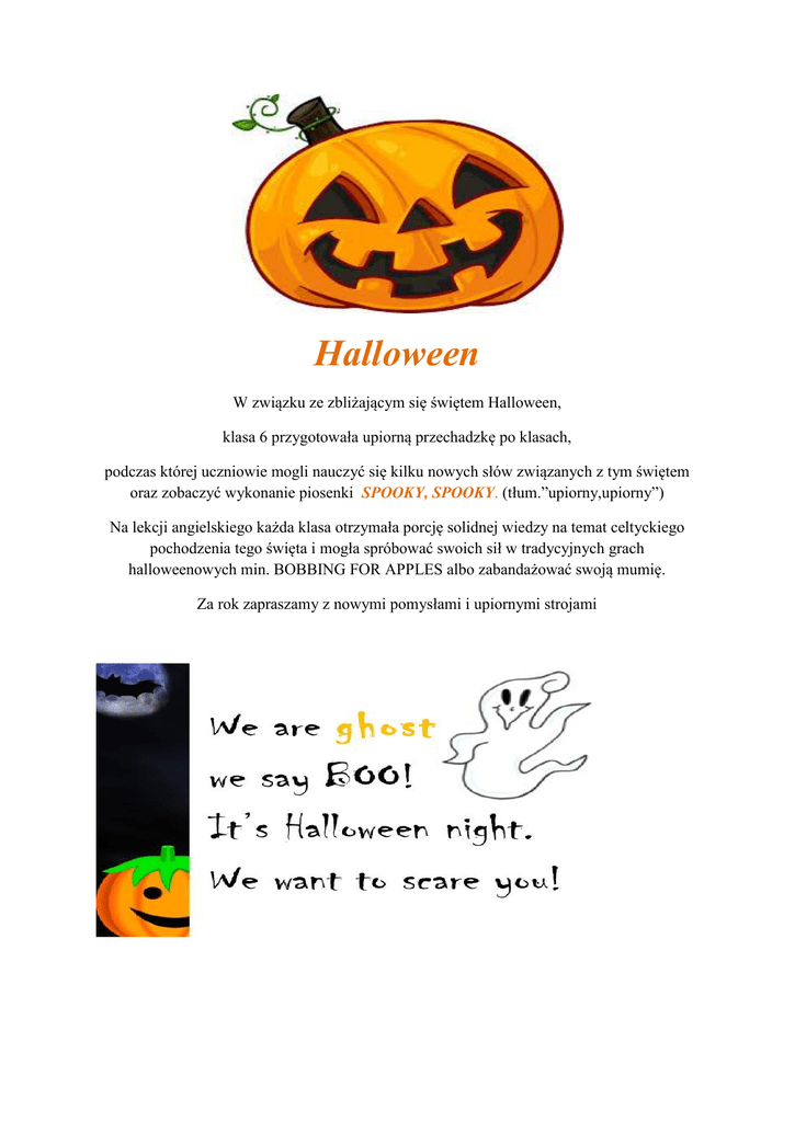 Halloween W związku ze zbliżającym się świętem Halloween, klasa 6 przygotowała upiorną przechadzkę po klasach, podczas której uczniowie mogli nauczyć się kilku nowych słów związanych z tym świętem oraz zobaczyć wykonanie piosenki SPOOKY, SPOOKY. (tłum.”upiorny,upiorny”) Na lekcji angielskiego każda klasa otrzymała porcję solidnej wiedzy na temat celtyckiego pochodzenia tego święta i mogła spróbować swoich sił w tradycyjnych grach halloweenowych min. BOBBING FOR APPLES albo zabandażować swoją mumię. Za rok zapraszamy z nowymi pomysłami i upiornymi strojami