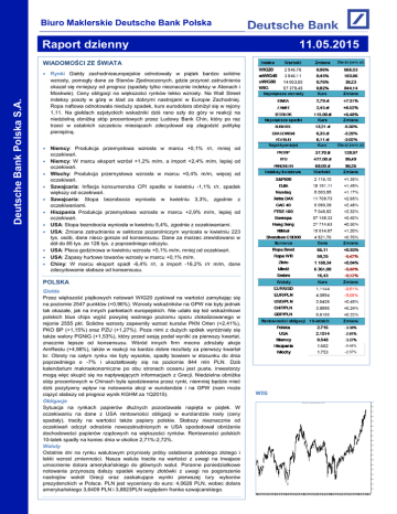 Biuro Maklerskie Deutsche Bank Polska Raport dzienny 11.05.2015 Deutsche Bank Polska S.A. WIADOMOŚCI ZE ŚWIATA Rynki Giełdy zachodnioeuropejskie odnotowały w piątek bardzo solidne wzrosty, pomogły dane ze Stanów Zjednoczonych, gdzie przyrost zatrudnienia okazał się mniejszy od prognoz (spadały tylko nieznacznie indeksy w Atenach i Moskwie). Ceny obligacji na większości rynków lekko wzrosły. Na Wall Street indeksy poszły w górę w ślad za dobrymi nastrojami w Europie Zachodniej. Ropa naftowa odnotowała nieduży spadek, kurs eurodolara obniżył się w rejony 1,11. Na giełdach azjatyckich wskaźniki dziś rano szły do góry w reakcji na niedzielną obniżkę stóp procentowych przez Ludowy Bank Chin, który po raz trzeci w ostatnich szcześciu miesiącach zdecydował się złagodzić politykę pieniężną. Niemcy: Produkcja przemysłowa wzrosła w marcu +0,1% r/r, mniej od oczekiwań. Niemcy: W marcu eksport wzrósł +1,2% m/m, a import +2,4% m/m, lepiej od oczekiwań. Włochy: Produkcja przemysłowa wzrosła w marcu +0,4% m/m, więcej od oczekiwań. Szwajcaria: Inflacja konsumencka CPI spadła w kwietniu -1,1% r/r, spadek większy od oczekiwań. Szwajcaria: Stopa bezrobocia wyniosła w kwietniu 3,3%, zgodnie z oczekiwaniami. Hiszpania Produkcja przemysłowa wzrosła w marcu +2,9% m/m, lepiej od oczekiwań. USA: Stopa bezrobocia wyniosła w kwietniu 5,4%, zgodnie z oczekiwaniami. USA: Zmiana zatrudnienia w sektorze pozarolniczym wyniosła w kwietniu 223 a tys. osób, dane nieco gorsze od konsensusu. Dane za marzec zrewidowano w dół do 85 tys. ze 126 tys. z poprzedniego odczytu. USA: Płaca godzinowa w kwietniu wzrosła +0,1% m/m, mniej od oczekiwań. USA: Zapasy hurtowe towarów wzrosły w marcu +0,1% m/m. Chiny: W marcu eksport spadł -6,4% r/r, a import -16,2% r/r m/m, dane zdecydowanie słabsze od konsensusu. POLSKA Giełda Przez większość piątkowych notowań WIG20 zyskiwał na wartości zamykając się na poziomie 2547 punktów (+0,96%). Wzrosty wskaźników na GPW nie były jednak tak okazałe, jak na innych parkietach europejskich. Nie udało się też wskaźnikowi polskich blue chips wyjść powyżej ważnego poziomu oporu zlokalizowanego w rejonie 2555 pkt. Solidne wzrosty zapewniły wzrost kursów PKN Orlen (+2,41%), PKO BP (+1,15%) oraz PZU (+1,27%). Poza nimi z dużych spółek wyróżniały się także walory PGNiG (+1,53%), który przed sesją podał wyniki za pierwszy kwartał, znacznie lepsze od konsensusu. Wśród innych firm mocno zdrożały akcje AmRestu (+4,98%), także w reakcji na bardzo dobre rezultaty za pierwszy kwartał br. Obroty na całym rynku nie były wysokie, spadły bowiem w stosunku do dnia poprzedniego o -7% i ukształtowały się na poziomie 844 mln PLN. Dziś kalendarium makroekonomiczne po obu stronach oceanu jest puste, inwestorzy mogą więc skupić się na napływających informacjach z Grecji. Niedzielna obniżka stóp procentowych w Chinach była spodziewana przez rynki, niemniej będzie mieć dziś pozytywny wpływ na notowania akcji w eurolandzie i na GPW (nam może ciązyć słabszy od prognoz wynik KGHM za 1Q2015). Obligacje Sytuacja na rynkach papierów dłużnych pozostawała napięta w piątek. W oczekiwaniu na dane z USA rentowności obligacji w eurolandzie rosły (ceny spadały), traciły na wartości także papiery polskie. Słabszy nieznacznie od oczekiwań odczyt odnośnie nowozatrudnionych w USA spododował obniżenie dochodowości papierów rządowych na większości rynków. Rentowności polskich 10-latek spadły na koniec dnia w okolice 2,71%-2,72%. Waluty Ostatnie dni na rynku walutowym przyniosły próby osłabienia polskiego złotego i lekki wzrost zmienności. Nasza waluta traciła na wartości z uwagi na trwajace umocnienie dolara amerykańskiego do głównych walut. Poranne poniedziałkowe notowania przynoszą dalszy spadek wyceny złotówki z uwagi na pogorszenie nastrojów wokół Grecji oraz zaskakujące wyniki pierwszej tury wyborów prezydenckich w Polsce. PLN jest wyceniany do euro: 4,0626 PLN, wobec dolara amerykańskiego 3,6409 PLN i 3,8923PLN względem franka szwajcarskiego. WIG WIG (57,020.73, 57,192.85, 56,866.30, 56,993.20, -67.7695) 57500 57000 56500 56000 55500 55000 54500 54000 53500 53000 52500 52000 51500 51000 50500 50000 49500 49000 28 5 May 12 19 26 2 9 June 16 23 30 7 July 14 21 28 4 11 18 August 25 1 8 15 September 22 29 6 13 October 20 27 3 10 17 November 24 1 8 15 December 22 5 12 2015 19 26 2 9 February 16 23 2 9 March 16 23 30 7 April 13 20 27 4 May 11 INFORMACJE Z POLSKICH SPÓŁEK Getin– zysk netto grupy Getin Holding w I kwartale 2015 wyniósł 45,8 mln zł, Deutsche Bank Polska S.A. wzrost 41,7 proc. r/r; liczy, że spółki wschodnie zaczną być zyskowne Amrest– zysk netto spółki wyniósł 1 243 mln zł, oczekiwano 1 012,6 mln zł; spodziewa się utrzymania lub lekkiej poprawy marż w Rosji w tym roku Netia– ma przedwstępną umowę zakupu 100 % udziałów w TK Telekom za 221,9 mln zł Asseco Poland– społka ma kontrakt z ARiMR za 34,7 mln zł Neuca– wypłaci 4,33 zł dywidendy na akcję z zysku za '14 ATM– PKO BP Bankowy OFE ma ponad 5 proc. ATM SA KGHM– Jednostkowy zysk netto KGHM w I kw. '15 wyniósł 497 mln zł; gorzej od konsensusu; planuje osiągnąć docelowe moce I fazy Sierra Gorda w II połowie 2015 r. Branża bankowa– zysk netto banków w I kw. 2015 wzrósł o 1,6 proc. rdr do 4,04 mld zł – NBP MakoLab– zarząd rekomenduje wypłatę 15 gr dywidendy na akcję za 2014 INFORMACJE ZE ŚWIATA S&P500 SP500 (2,059.94, 2,067.15, 2,045.50, 2,056.15, -4.90015) 31 7 April 14 21 28 5 May 12 19 27 2 9 June 16 23 30 7 July 14 21 28 4 11 August 18 25 2 8 15 September 22 29 6 13 October 20 27 2145 2140 2135 2130 2125 2120 2115 2110 2105 2100 2095 2090 2085 2080 2075 2070 2065 2060 2055 2050 2045 2040 2035 2030 2025 2020 2015 2010 2005 2000 1995 1990 1985 1980 1975 1970 1965 1960 1955 1950 1945 1940 1935 1930 1925 1920 1915 1910 1905 1900 1895 1890 18