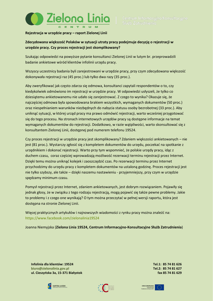 Rejestracja w urzędzie pracy – raport Zielonej Linii Zdecydowana większość Polaków w sytuacji utraty pracy podejmuje decyzję o rejestracji w urzędzie pracy. Czy proces rejestracji jest skomplikowany? Szukając odpowiedzi na powyższe pytanie konsultanci Zielonej Linii w lutym br. przeprowadzili badanie ankietowe wśród klientów infolinii urzędu pracy. Wszyscy uczestnicy badania byli zarejestrowani w urzędzie pracy, przy czym zdecydowana większość dokonywała rejestracji raz (45 proc.) lub tylko dwa razy (35 proc.). Aby zweryfikować jak często zdarza się odmowa, konsultanci zapytali respondentów o to, czy kiedykolwiek odmówiono im rejestracji w urzędzie pracy. W odpowiedzi usłyszeli, że tylko co dziesiątemu ankietowanemu nie udało się zarejestrować. Z czego to wynika? Okazuje się, że najczęściej odmowa była spowodowana brakiem wszystkich, wymaganych dokumentów (50 proc.) oraz niespełnianiem warunków niezbędnych do nabycia statusu osoby bezrobotnej (33 proc.). Aby uniknąć sytuacji, w której urząd pracy ma prawo odmówić rejestracji, warto wcześniej przygotować się do tego procesu. Na stronach internetowych urzędów pracy są dostępne informacje na temat wymaganych dokumentów do rejestracji. Dodatkowo, w razie wątpliwości, warto skonsultować się z konsultantem Zielonej Linii, dostępnej pod numerem telefonu 19524. Czy proces rejestracji w urzędzie pracy jest skomplikowany? Zdaniem większości ankietowanych – nie jest (81 proc.). Wystarczy zgłosić się z kompletem dokumentów do urzędu, poczekać na spotkanie z urzędnikiem i dokonać rejestracji. Warto przy tym wspomnieć, że polskie urzędy pracy, idąc z duchem czasu, coraz częściej wprowadzają możliwość rezerwacji terminu rejestracji przez Internet. Dzięki temu można uniknąć kolejek i zaoszczędzić czas. Po rezerwacji terminu przez Internet przychodzimy do urzędu pracy z kompletem dokumentów na ustaloną godzinę. Proces rejestracji jest nie tylko szybszy, ale także – dzięki naszemu nastawieniu - przyjemniejszy, przy czym w urzędzie spędzamy minimum czasu. Pomysł rejestracji przez Internet, zdaniem ankietowanych, jest dobrym rozwiązaniem. Pojawiły się jednak głosy, że w związku z tego rodzaju rejestracją, mogą pojawić się także pewne problemy. Jakie to problemy i z czego one wynikają? O tym można przeczytać w pełnej wersji raportu, która jest dostępna na stronie Zielonej Linii. Więcej praktycznych artykułów i najnowszych wiadomości z rynku pracy można znaleźć na: https://www.facebook.com/zielonalinia19524 Joanna Niemyjska (Zielona Linia 19524, Centrum Informacyjno-Konsultacyjne Służb Zatrudnienia) Infolinia dla klientów: 19524 [email protected] ul. Cieszyńska 3a, 15-371 Białystok Tel.1: 85 74 81 626 Tel.2: 85 74 81 627 fax 85 74 81 629