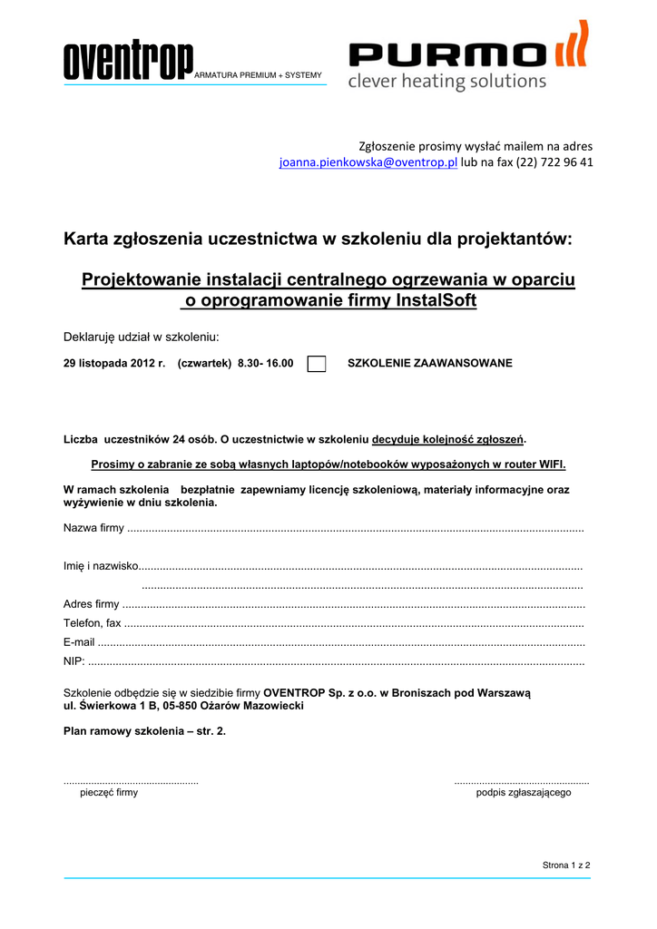 ARMATURA PREMIUM + SYSTEMY Zgłoszenie prosimy wysłać mailem na adres [email protected] lub na fax (22) 722 96 41 Karta zgłoszenia uczestnictwa w szkoleniu dla projektantów: Projektowanie instalacji centralnego ogrzewania w oparciu o oprogramowanie firmy InstalSoft Deklaruję udział w szkoleniu: 29 listopada 2012 r. (czwartek) 8.30- 16.00 SZKOLENIE ZAAWANSOWANE Liczba uczestników 24 osób. O uczestnictwie w szkoleniu decyduje kolejność zgłoszeń. Prosimy o zabranie ze sobą własnych laptopów/notebooków wyposażonych w router WIFI. W ramach szkolenia bezpłatnie zapewniamy licencję szkoleniową, materiały informacyjne oraz wyżywienie w dniu szkolenia. Nazwa firmy ..................................................................................................................................................... Imię i nazwisko................................................................................................................................................. ................................................................................................................................................ Adres firmy ....................................................................................................................................................... Telefon, fax ...................................................................................................................................................... E-mail ............................................................................................................................................................... NIP: .................................................................................................................................................................. Szkolenie odbędzie się w siedzibie firmy OVENTROP Sp. z o.o. w Broniszach pod Warszawą ul. Świerkowa 1 B, 05-850 Ożarów Mazowiecki Plan ramowy szkolenia – str. 2. ................................................. pieczęć firmy ................................................. podpis zgłaszającego Strona 1 z 2 ARMATURA PREMIUM + SYSTEMY Projektowanie instalacji centralnego ogrzewania w oparciu o oprogramowanie firmy InstalSoft dla projektantów pracujących w programach Instal Soft) w dniu 29.11.2012 8.30-8.45 8.45 przyjazd i rejestracja uczestników aktywacja oprogramowania na laptopach uczestników 9.00 rozpoczęcie szkolenia 9.00-10.30 krótkie wprowadzenie do obsługi programu i rozpoczęcia pracy nad projektem, projektowanie instalacji grzejnikowej, dobór grzejników 10.30-10.45 przerwa kawowa 10.45- 12.15 projektowanie instalacji grzejnikowej, dobór armatury grzejnikowej, podpionowej, itp. w budynku wielorodzinnym 12.15-12.45 obiad 12.45 – 14.15 ocena parametrów obliczeń, kontrola obliczeń, interpretacja wyników, wydruk/export wyników 14.15-14.30 przerwa kawowa 14.30-16.00 zaawansowane funkcje i możliwości oprogramowania Instal-therm 16.00 planowane zakończenie szkolenia Strona 2 z 2