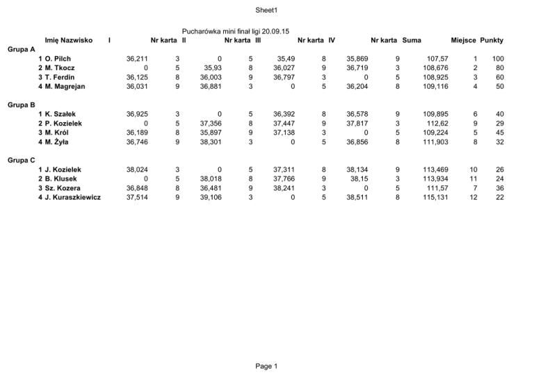 Sheet1 Imię Nazwisko Pucharówka mini finał ligi 20.09.15 Nr karta II Nr karta III I Nr karta IV Nr karta Suma Miejsce Punkty Grupa A 1 2 3 4 O. Pilch M. Tkocz T. Ferdin M. Magrejan 36,211 0 36,125 36,031 3 5 8 9 0 35,93 36,003 36,881 5 8 9 3 35,49 36,027 36,797 0 8 9 3 5 35,869 36,719 0 36,204 9 3 5 8 107,57 108,676 108,925 109,116 1 2 3 4 100 80 60 50 1 2 3 4 K. Szałek P. Kozielek M. Król M. Żyła 36,925 0 36,189 36,746 3 5 8 9 0 37,356 35,897 38,301 5 8 9 3 36,392 37,447 37,138 0 8 9 3 5 36,578 37,817 0 36,856 9 3 5 8 109,895 112,62 109,224 111,903 6 9 5 8 40 29 45 32 1 2 3 4 J. Kozielek B. Klusek Sz. Kozera J. Kuraszkiewicz 38,024 0 36,848 37,514 3 5 8 9 0 38,018 36,481 39,106 5 8 9 3 37,311 37,766 38,241 0 8 9 3 5 38,134 38,15 0 38,511 9 3 5 8 113,469 113,934 111,57 115,131 10 11 7 12 26 24 36 22 Grupa B Grupa C Page 1