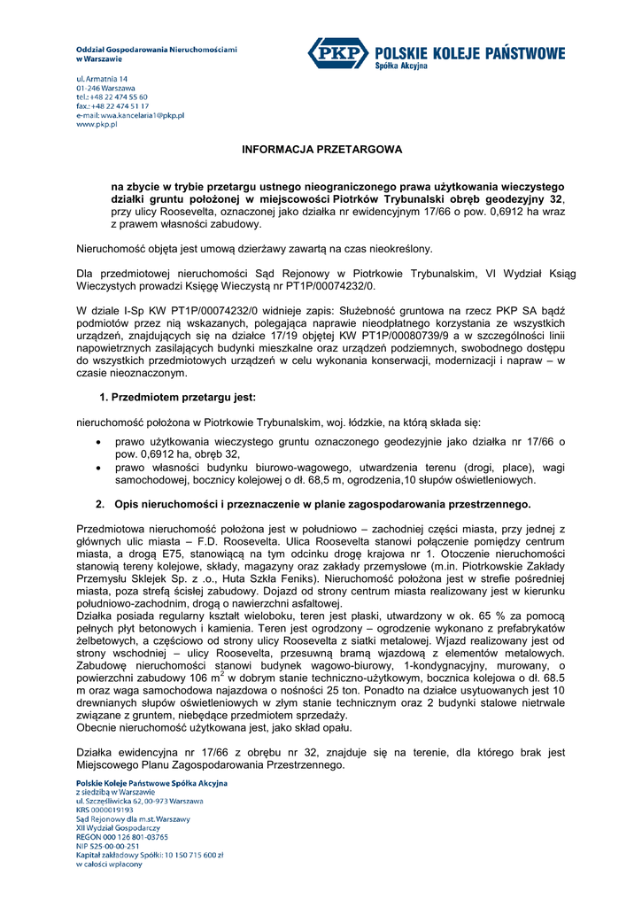 INFORMACJA PRZETARGOWA na zbycie w trybie przetargu ustnego nieograniczonego prawa użytkowania wieczystego działki gruntu położonej w miejscowości Piotrków Trybunalski obręb geodezyjny 32, przy ulicy Roosevelta, oznaczonej jako działka nr ewidencyjnym 17/66 o pow. 0,6912 ha wraz z prawem własności zabudowy. Nieruchomość objęta jest umową dzierżawy zawartą na czas nieokreślony. Dla przedmiotowej nieruchomości Sąd Rejonowy w Piotrkowie Trybunalskim, VI Wydział Ksiąg Wieczystych prowadzi Księgę Wieczystą nr PT1P/00074232/0. W dziale I-Sp KW PT1P/00074232/0 widnieje zapis: Służebność gruntowa na rzecz PKP SA bądź podmiotów przez nią wskazanych, polegająca naprawie nieodpłatnego korzystania ze wszystkich urządzeń, znajdujących się na działce 17/19 objętej KW PT1P/00080739/9 a w szczególności linii napowietrznych zasilających budynki mieszkalne oraz urządzeń podziemnych, swobodnego dostępu do wszystkich przedmiotowych urządzeń w celu wykonania konserwacji, modernizacji i napraw – w czasie nieoznaczonym. 1. Przedmiotem przetargu jest: nieruchomość położona w Piotrkowie Trybunalskim, woj. łódzkie, na którą składa się: prawo użytkowania wieczystego gruntu oznaczonego geodezyjnie jako działka nr 17/66 o pow. 0,6912 ha, obręb 32, prawo własności budynku biurowo-wagowego, utwardzenia terenu (drogi, place), wagi samochodowej, bocznicy kolejowej o dł. 68,5 m, ogrodzenia,10 słupów oświetleniowych. 2. Opis nieruchomości i przeznaczenie w planie zagospodarowania przestrzennego. Przedmiotowa nieruchomość położona jest w południowo – zachodniej części miasta, przy jednej z głównych ulic miasta – F.D. Roosevelta. Ulica Roosevelta stanowi połączenie pomiędzy centrum miasta, a drogą E75, stanowiącą na tym odcinku drogę krajowa nr 1. Otoczenie nieruchomości stanowią tereny kolejowe, składy, magazyny oraz zakłady przemysłowe (m.in. Piotrkowskie Zakłady Przemysłu Sklejek Sp. z .o., Huta Szkła Feniks). Nieruchomość położona jest w strefie pośredniej miasta, poza strefą ścisłej zabudowy. Dojazd od strony centrum miasta realizowany jest w kierunku południowo-zachodnim, drogą o nawierzchni asfaltowej. Działka posiada regularny kształt wieloboku, teren jest płaski, utwardzony w ok. 65 % za pomocą pełnych płyt betonowych i kamienia. Teren jest ogrodzony – ogrodzenie wykonano z prefabrykatów żelbetowych, a częściowo od strony ulicy Roosevelta z siatki metalowej. Wjazd realizowany jest od strony wschodniej – ulicy Roosevelta, przesuwną bramą wjazdową z elementów metalowych. Zabudowę nieruchomości stanowi budynek wagowo-biurowy, 1-kondygnacyjny, murowany, o 2 powierzchni zabudowy 106 m w dobrym stanie techniczno-użytkowym, bocznica kolejowa o dł. 68.5 m oraz waga samochodowa najazdowa o nośności 25 ton. Ponadto na działce usytuowanych jest 10 drewnianych słupów oświetleniowych w złym stanie technicznym oraz 2 budynki stalowe nietrwale związane z gruntem, niebędące przedmiotem sprzedaży. Obecnie nieruchomość użytkowana jest, jako skład opału. Działka ewidencyjna nr 17/66 z obrębu nr 32, znajduje się na terenie, dla którego brak jest Miejscowego Planu Zagospodarowania Przestrzennego. Zgodnie z ustaleniami obowiązującego Studium uwarunkowań i kierunków zagospodarowania przestrzennego miasta Piotrkowa Trybunalskiego przyjętym Uchwałą Nr XIV/297/11 z dnia 30 listopada 2011 roku działka wchodzi w skład obszaru opisanego, jako: KK: obszar terenów zamkniętych, obsługa komunikacji kolejowej. 3. Dodatkowe uwarunkowania: 1. Kupujący ma obowiązek szczegółowo zapoznać się ze stanem faktycznym oraz stanem prawnym nieruchomości a następnie, w treści umowy sprzedaży złoży oświadczenie, że szczegółowo zapoznał się ze stanem faktycznym i prawnym nieruchomości i nie zgłasza z tego tytułu żadnych zastrzeżeń w stosunku do PKP S.A. tak w chwili zawarcia umowy sprzedaży jak i w przyszłości. Kupujący zrzeknie się dochodzenia w przyszłości wszelkich roszczeń z tego tytułu. 2. PKP S.A. zastrzega, iż przyszłe zagospodarowanie działki nr 17/66 powinno być zgodne z art. 53 ustawy z dnia 28 marca 2003 r. o transporcie kolejowym (Dz. U. z 2007r. Nr 16, poz. 94 z późn. zm.) oraz z przepisami rozporządzenia Ministra Infrastruktury z dnia 7 sierpnia 2008r. w sprawie wymagań w zakresie odległości i warunków dopuszczających usytuowanie budowli i budynków, drzew i krzewów, elementów ochrony akustycznej i wykonywania robót ziemnych w sąsiedztwie linii kolejowej, a także sposobu urządzania i utrzymywania zasłon odśnieżnych oraz pasów przeciwpożarowych (Dz. U. Nr 153, poz. 955). 3. Z tytułu bliskiego sąsiedztwa zbywanej nieruchomości z obszarami kolejowymi mogą wystąpić negatywne następstwa typu: nadmierny hałas, drgania łącznie z możliwością zniszczeń, uszkodzenia obiektu na skutek drgań przenoszonych przez tabor kolejowy oraz wystąpienia katastrof kolejowych, za które PKP Polskie Linie Kolejowe S.A. oraz PKP S.A. nie ponosi odpowiedzialności. 4. PKP S.A. oraz Kupujący zgodnie oświadczają, że PKP S.A. nie będzie ponosiła odpowiedzialności za ewentualne szkody spowodowane koniecznością poniesienia ewentualnych kosztów obowiązkowego usunięcia zanieczyszczeń lub skażeń, które wystąpią lub mogą wystąpić po podpisaniu umowy sprzedaży, lub rekultywacji terenu dokonanej na mocy decyzji lub rozstrzygnięć sądowych wydanych po podpisaniu umowy sprzedaży. Kupujący zrzeka się dochodzenia w przyszłości wszelkich roszczeń z tego tytułu. 5. Część zabudowy znajdującej się na działce nr 17/66 stanowi nakład dzierżawcy. PKP S.A. nie widzi podstaw do uznania dzierżawcy prawa roszczenia do nakładów. 6. W celu zapewnienia dojazdu do drogi publicznej dla działki nr ew. 17/44 na prawie użytkowania wieczystego gruntu oznaczonego jako działka nr 17/66 obręb 32 zostanie ustanowiona nieograniczona czasowo o
