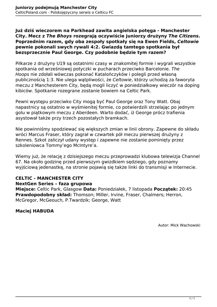 Juniorzy podejmują Manchester City CelticPoland.com - Polskojęzyczny serwis o Celticu FC Już dziś wieczorem na Parkhead zawita angielska potęga - Manchester City. Mecz z The Bhoys rozegrają oczywiście juniorzy drużyny The Citizens. Poprzednim razem, gdy oba zespoły spotkały się na Ewen Fields, Celtowie pewnie pokonali swych rywali 4:2. Gwiazdą tamtego spotkania był bezsprzecznie Paul George. Czy podobnie będzie tym razem? Piłkarze z drużyny U19 są ostatnimi czasy w znakomitej formie i wygrali wszystkie spotkania od wrześniowej potyczki w pucharach przeciwko Barcelonie. The Hoops nie zdołali wówczas pokonać Katalończyków i polegli przed własną publicznością 1:3. Nie ulega wątpliwości, że Celtowie, którzy uchodzą za faworyta meczu z Manchesterem City, będą mogli liczyć w poniedziałkowy wieczór na doping kibiców. Spotkanie rozegrane zostanie bowiem na Celtic Park. Pewni występu przeciwko City mogą być Paul George oraz Tony Watt. Obaj napastnicy są ostatnio w wyśmienitej formie, co potwierdzili strzelając po jednym golu w piątkowym meczu z Aberdeen. Warto dodać, iż George prócz trafienia asystował także przy trzech pozostałych bramkach. Nie powinniśmy spodziewać się większych zmian w linii obrony. Zapewne do składu wróci Marcus Fraser, który zagrał w czwartek pół meczu pierwszej drużyny z Rennes. Szkot zaliczył udany występ i zapewne nie zostanie pominięty przez szkoleniowca Tommy’ego McIntyre’a. Wiemy już, że relację z dzisiejszego meczu przeprowadzi klubowa telewizja Channel 67. Na około godzinę przed pierwszym gwizdkiem sędziego, gdy poznamy wyjściową jedenastkę, na stronie pojawią się także linki do transmisji w Internecie. CELTIC - MANCHESTER CITY NextGen Series – faza grupowa Miejsce: Celtic Park, Glasgow Data: Poniedziałek, 7 listopada Początek: 20:45 Prawdopodobny skład: Thomson; Miller, Irvine, Fraser, Chalmers; Herron, McGregor, McGeouch, P.Twardzik; George, Watt Maciej HABUDA Autor: Mick Wachowski 1/1 Powered by TCPDF (www.tcpdf.org)