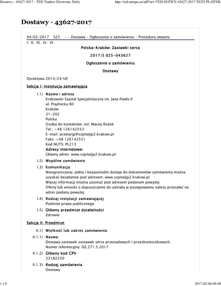 Dostawy - 43627-2017 - TED Tenders Electronic Daily 1z9 http://ted.europa.eu/udl?uri=TED:NOTICE:43627-2017:TEXT:PL:HTML Dostawy - 43627-2017 04/02/2017 S25 - - Dostawy - Ogłoszenie o zamówieniu - Procedura otwarta I. II. III. IV. VI. Polska-Kraków: Zastawki serca 2017/S 025-043627 Ogłoszenie o zamówieniu Dostawy Dyrektywa 2014/24/UE Sekcja I: Instytucja zamawiająca I.1) Nazwa i adresy Krakowski Szpital Specjalistyczny im. Jana Pawła II ul. Prądnicka 80 Kraków 31-202 Polska Osoba do kontaktów: inż. Maciej Rożek Tel.: +48 126142553 E-mail: [email protected] Faks: +48 126142551 Kod NUTS: PL213 Adresy internetowe: Główny adres: www.szpitaljp2.krakow.pl I.2) Wspólne zamówienie I.3) Komunikacja Nieograniczony, pełny i bezpośredni dostęp do dokumentów zamówienia można uzyskać bezpłatnie pod adresem: www.szpitaljp2.krakow.pl Więcej informacji można uzyskać pod adresem podanym powyżej Oferty lub wnioski o dopuszczenie do udziału w postępowaniu należy przesyłać na adres podany powyżej I.4) Rodzaj instytucji zamawiającej Podmiot prawa publicznego I.5) Główny przedmiot działalności Zdrowie Sekcja II: Przedmiot II.1) Wielkość lub zakres zamówienia II.1.1) Nazwa: Dostawa zastawek zastawek serca przezudowych i przezkoniuszkowych. Numer referencyjny: DZ.271.5.2017 II.1.2) Główny kod CPV 33182220 II.1.3) Rodzaj zamówienia Dostawy 2017-02-06 09:48 Dostawy - 43627-2017 - TED Tenders Electronic Daily 2z9 http://ted.europa.eu/udl?uri=TED:NOTICE:43627-2017:TEXT:PL:HTML II.1.4) Krótki opis: Dostawa zastawek zastawek serca przezudowych i przezkoniuszkowych. II.1.5) Szacunkowa całkowita wartość Wartość bez VAT: 5 289 250.00 PLN II.1.6) Informacje o częściach To zamówienie podzielone jest na części: tak Oferty można składać w odniesieniu do wszystkich części II.2) Opis II.2.1) Nazwa: Zastawka aortalna samorozprężalna wszczepiana przez tętnicę udową Część nr: 1 II.2.2) Dodatkowy kod lub kody CPV 33182220 II.2.3) Miejsce świadczenia usług Kod NUTS: PL213 Główne miejsce lub lokalizacja realizacji: Siedziba Zamawiającego. II.2.4) Opis zamówienia: Zastawka aortalna samorozprężalna wszczepiana przez tętnicę udową – 30 sztuk. II.2.5) Kryteria udzielenia zamówienia Kryteria określone poniżej Kryterium jakości - Nazwa: Parametry Techniczne / Waga: 40 Cena - Waga: 60 II.2.6) Szacunkowa wartość Wartość bez VAT: 1 950 000.00 PLN II.2.7) Okres obowiązywania zamówienia, umowy ramowej lub dynamicznego systemu zakupów Okres w miesiącach: 12 Niniejsze zamówienie podlega wznowieniu: nie II.2.10) Informacje o ofertach wariantowych Dopuszcza się składanie ofert wariantowych: nie II.2.11) Informacje o opcjach Opcje: nie II.2.12) Informacje na temat katalogów elektronicznych II.2.13) Informacje o funduszach Unii Europejskiej Zamówienie dotyczy projektu/programu finansowanego ze środków Unii Europejskiej: nie II.2.14) Informacje dodatkowe 1. Zamawiający zastrzega sobie prawo do tego, aby najpierw dokonać oceny ofert, a następnie zbadać, czy wykonawca, którego oferta została oceniona jako najkorzystniejsza, nie podlega wykluczeniu oraz spełnia warunki udziału w postępowaniu. 2. Wykonawca zobowiązany jest wnieść wadium w wysokości 33 200 PLN 3. Zamawiający nie przewiduje zamówienia uzupełniającego (art. 67 ust 1 pkt 6, 7 ustawy Pzp). II.2) Opis II.2.1) Nazwa: 2017-02-06 09:48 Dostawy - 43627-2017 - TED Tenders Electronic Daily 3z9 http://ted.europa.eu/udl?uri=TED:NOTICE:43627-2017:TEXT:PL:HTML Zastawka aortalna samorozprężalna z możliwością wielokrotnego repozycjonowania Część nr: 2 II.2.2) Dodatkowy kod lub kody CPV 33182220 II.2.3) Miejsce świadczenia usług Kod NUTS: PL213 Główne miejsce lub lokalizacja realizacji: Siedziba Zamawiającego. II.2.4) Opis zamówienia: Zastawka aortalna samorozprężalna z możliwością wielokrotnego repozycjonowania – 15 sztuk. II.2.5) Kryteria udzielenia zamówienia Kryteria określone poniżej Kryterium jakości - Nazwa: Parametry Techniczne / Waga: 40 Cena - Waga: 60 II.2.6) Szacunkowa wartość Wartość bez VAT: 944 250.00 PLN II.2.7) Okres obowiązywania zamówienia, umowy ramowej lub dynamicznego systemu zakupów Okres w miesiącach: 12 Niniejsze zamówienie podlega wznowieniu: nie II.2.10) Informacje o ofertach wariantowych Dopuszcza się składanie ofert wariantowych: nie II.2.11) Informacje o opcjach Opcje: nie II.2.12) Informacje na temat katalogów elektronicznych II.2.13) Informacje o funduszach Unii Europejskiej Zamówienie dotyczy projektu/programu finansowanego ze środków Unii Europejskiej: nie II.2.14) Informacje dodatkowe 1. Zamawiający zastrzega sobie prawo do tego, aby najpierw dokonać oceny ofert, a następnie zbadać, czy wykonawca, którego oferta została oceniona jako najkorzystniejsza, nie podlega wykluczeniu oraz spełnia warunki udziału w postępowaniu. 2. Wykonawca zobowiązany jest wnieść wadium w wysokości 16 000 PLN 3. Zamawiający nie przewiduje zamówienia uzupełniającego (art. 67 ust 1 pkt 6, 7 ustawy Pzp). II.2) Opis II.2.1) Nazwa: Zastawki aortalne wszczepiana za pomocą cewnika balonowego Część nr: 3 II.2.2) Dodatkowy kod lub kody CPV 33182220 II.2.3) Miejsce świadczenia usług Kod NUTS: PL213 Główne miejsce lub lokalizacja realizacji: Siedziba Zamawiającego. 2017-02-06 09:48 Dostawy - 43627-2017 - TED Tenders Electronic Daily 4z9 http://ted.europa.eu/udl?uri=TED:NOTICE:43627-2017:TEXT:PL:HTML II.2.4) Opis zamówienia: Zastawki aortalne wszczepiana za pomocą cewnika balonowego – 15 sztuk. II.2.5) Kryteria udzielenia zamówienia Kryteria określone poniżej Kryterium jakości - Nazwa: Parametry Techniczne / Waga: 40 Cena - Waga: 60 II.2.6) Szacunkowa wartość Wartość bez VAT: 1 095 000.00 PLN II.2.7) Okres obowiązywania zamówienia, umowy ramowej lub dynamicznego systemu zakupów Okres w miesiącach: 12 Niniejsze zamówienie podlega wznowieniu: nie II.2.10) Informacje o ofertach wariantowych Dopuszcza się składan