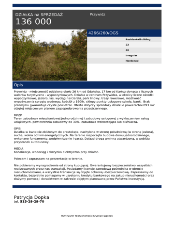 DZIAŁKA na SPRZEDAŻ Przywidz 136 000 4266/260/OGS ResidentalBuilding 22 40 Irregular Hardened Opis Przywidz - miejscowość oddalona około 26 km od Gdańska, 17 km od Kartuz słynąca z licznych walorów turystyczno - wypoczynkowych. Działka w centrum Przywidza, w okolicy liczne ośrodki wypoczynkowe, jezioro, las, wyciąg narciarski, park linowy, trasy rowerowe, możliwość wypożyczenia sprzętu wodnego, kościół z 1909r, sklepy,punkty usługowe szkoła, banki. Brak przemysłu gwarantuje czyste powietrze. Oferta dotyczy sprzedaży działki o powierzchni 893 m2 objętej miejscowym planem zagospodarowania przestrzennego. MPZP Teren zabudowy mieszkaniowej jednorodzinnej i zabudowy usługowej z wykluczeniem usług uciążliwych, powierzchnia zabudowy do 30%, zabudowa wolnostojąca lub bliźniacza. OPIS Działka w kształcie zbliżonym do prostokąta, nachylona w stronę południową (w stronę jeziora), sucha, wolna od linii energetycznych. Na terenie rozpoczęta budowa domu jednorodzinnego, wykonano fundamenty, podpiwniczenie i garaż. Dojazd drogą gminną utwardzoną, w pobliżu przystanek autobusowy. MEDIA Kanalizacja, wodociąg i skrzynka elektryczna przy działce. Polecam i zapraszam na prezentację w terenie. Nie pobieramy wynagrodzenia od strony kupującej. Gwarantujemy bezpieczeństwo wszystkich realizowanych przez nas transakcji. Posiadamy licencję zawodową pośrednika w obrocie nieruchomościami, a wszystkie transakcje są objęte ochroną ubezpieczeniową. Zapraszamy do kontaktu, bezpłatnie pomagamy w uzyskaniu kredytu bankowego na zakup nieruchomości oraz służymy pomocą i doradztwem w zakresie objętym planowaną przez Państwa inwestycją. Patrycja Dopka tel. 515-29-29-70 HORYZONT Nieruchomości Krystian Szpinek email: [email protected] HORYZONT Nieruchomości Krystian Szpinek Powered by TCPDF (www.tcpdf.org)