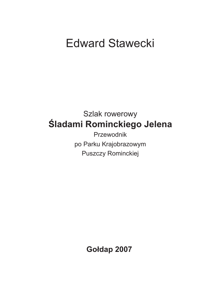 Edward Stawecki Szlak rowerowy Śladami Rominckiego Jelena Przewodnik po Parku Krajobrazowym Puszczy Rominckiej Gołdap 2007 Fotografie Edward Stawecki Opracowanie graficzne Mirosław Słapik Redaktor Mirosław Słapik Wstęp ISBN 978-83-926076-0-1 Skład i łamanie Bezpłatnie SIGNI Mirosław Słapik www.slapik.pl Wydawca Fundacja Rozwoju Regionu Gołdap pl. Zwycięstwa 16 19-500 Gołdap www.frrg.pl Puszcza Romincka to kompleks leśny niezwykle atrakcyjny dla osób łaknących wypoczynku wśród nieskażonej przyrody. Tajemnicze ostępy, unoszące się nad bagnami mgły, tęskny klangor żurawi, rozbrzmiewający nad zdziczałymi łąkami… Czegóż więcej oczekiwać może turysta - przyrodnik i esteta? Nie wolno jednak zapominać, iż natura – wbrew pozorom - jest jednak niezwykle wrażliwa i delikatna. Człowiek potrafi zbrukać jej piękno, zniszczyć bogactwo i różnorodność. 3 Szkody, które wyrządzamy przyrodzie, nie wynikają najczęściej ze złej woli. Przeważnie spowodowane są brakiem wiedzy bądź wyobraźni. Nim wyruszymy na szlak warto zapoznać się z zamieszczonymi niżej wskazówkami. Dzięki nim nie tylko łatwiej będzie nam dbać o przyrodę, ale być może uchronią nas także od przykrych niespodzianek, choćby konieczności uiszczenia mandatu karnego. Należy pamiętać, że Puszcza Romincka przecięta jest granicą państwową. Szlak poprowadzony jest tak, aby wyeliminować możliwość jej przekroczenia. Wystarczy jedynie respektować napotkane po drodze znaki. Warto też zapoznać się z przepisami regulujące ruch turystyczny w rejonie przygranicznym. Lasy należące do Skarbu Państwa są własnością ogółu - całego społeczeństwa. Wszyscy mamy prawo korzystać z ich walorów w celu wypoczynku i rekreacji. Istnieją jednak ograniczenia zawarte przede wszystkim w Ustawie o lasach, służące zachowaniu bogactw przyrody. 4 Informacje praktyczne Rezerwaty i uprawy Obszary Puszczy Rominckiej w większości są udostępnione dla uprawiania turystyki rowerowej i pieszej, a zimą - narciarskiej. Stałym zakazem wstępu objęte są jedynie rezerwaty przyrody, uprawy leśne poniżej 4 metrów, drzewostany nasienne. Granice rezerwatów oznaczone są poprzez zielone opaski umieszczone na korze drzew. W najbardziej eksponowanych punktach granicznych wszystkich chronionych obszarów stoją tablice informacyjne zawierające podstawowe informacje na ich temat a także schematyczne mapy. Granice drzewostanów nasiennych wskazują żółte opaski wymalowane na pniach drzew. Nadleśniczy ma możliwość wprowadzenia okresowego zakazu wstępu w przypadku zagrożenia pożarowego, bądź, gdy wykonywane są zabiegi gospodarcze (np. pozyskanie drewna), mogące zagrozić bezpieczeństwu osób postronnych. 5 Gdzie z namiotem? Przepisy dodatkowe W obrębie terenów puszczańskich nie ma pól namiotowych. Znajdują się one natomiast na ich obrzeżach - w Gołdapi, Pluszkiejmach, Kiepojciach, Błąkałach i Stańczykach. Możliwość biwakowania zapewniają także właściciele gospodarstw agroturystycznych. Liczne, zapisane w Ustawie o lasach i Ustawie o ochronie przyrody, zakazy są zupełnie oczywiste. Ich przestrzeganie przez turystów powinno wynikać nie tyle ze znajomości prawa, ale z przyzwoitości i kultury. Chyba nikomu nie trzeba tłumaczyć, że nagannym jest hałasowanie, śmiecenie, zanieczyszczanie wód, bezmyślne uszkadzanie roślin, niszczenie mrowisk, gniazd ptasich i wybieranie z nich jaj. Pamiętać musimy też o zakazie puszczania luzem psów. Nawet, jeśli przekonani jesteśmy, że nasz pupil nie stanowi żadnego zagrożenia dla dzikich zwierząt, powinniśmy prowadzić go na smyczy. Wędrując po Puszczy spotkać możemy pracowników Parku Krajobrazowego, leśników, funkcjonariuszy Policji i Straży Granicznej. Wszyscy chętnie służyć nam będą wszelką możliwą pomocą. Jednocześnie mają oni uprawnienia do kontroli dokumentów napotkanych osób. Nie należy się tym denerwować albowiem działania te służą zapewnieniu bezpieczeństwa. Przestrzeganie przepisów obowiązujących na terenie Puszczy Rominckiej nie popsuje nam wypoczynku. Wprost przeciwnie - sprawi, że bezpiecznie będziemy mogli napawać się pięknem otaczającej nas przyrody. Dyrekcja Parku Krajobrazowego Puszczy Rominckiej Uwaga na granicę! Puszcza Romincka położona jest w strefie nadgranicznej. Turyści muszą, więc respektować specyficzne przepisy z tym związane. Najważniejsze to: ścisły zakaz przebywania na pasie drogi granicznej; zakaz fotografowania obiektów, znaków i urządzeń granicznych oraz terenów położonych poza linią granicy państwowej; zakaz bezpośredniego komunikowania się z innymi osobami przez granicę; zakaz przerzucania lub przejmowania przez granicę jakichkolwiek przedmiotów; zakaz przebywania w porze nocnej na akwenach w odległości nie mniejszej niż 150 m od granicy. Zapobieganie pożarom Na terenach leśnych, jak też w odległości do 100 metrów od granicy lasu (poza miejscami wyznaczonymi) zabronione jest rozniecanie ognia. 6 7 Tropami Rominckich Jeleni Krótka charakterystyka Długość całkowita - 88,6 km, w tym: po drogach o nawierzchni asfaltowej - ok. 20 km; traktami bitymi - 10 km; leśnymi drogami gruntowymi - 33 km; po wiejskich drogach gruntowych, brukowanych i ścieżkach - 25,6 km. Trasa średnio trudna poprowadzona po silnie pofałdowanym terenie Parku Krajobrazowego Puszczy Rominckiej i jego otulinie. Niedogodności z tym związane rekompensuje sieć dobrze utrzymanych leśnych i wiejskich traktów oraz niewielkie natężenie ruchu na asfaltowej szosie: Gołdap - przejście graniczne w Budzisku. Gęsta sieć dróg daje możliwości jej modyfikacji, dostosowania do indywidualnych potrzeb jak i sprawności fizycznej poszczególnych uczestników wędrówki. Przy granicy z województwem podlaskim łączy się ze szlakami Suwalszczyzny. W Żytkiejmach napotyka odnogę szlaku transgranicz- 8 nego, który na drogow