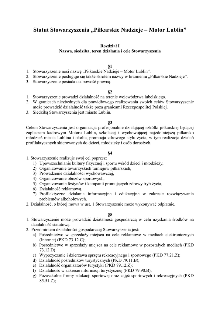Statut Stowarzyszenia „Piłkarskie Nadzieje – Motor Lublin” Rozdział I Nazwa, siedziba, teren działania i cele Stowarzyszenia §1 1. Stowarzyszenie nosi nazwę „Piłkarskie Nadzieje – Motor Lublin”. 2. Stowarzyszenie posługuje się także skrótem nazwy w brzmieniu „Piłkarskie Nadzieje”. 3. Stowarzyszenie posiada osobowość prawną. §2 1. Stowarzyszenie prowadzi działalność na terenie województwa lubelskiego. 2. W granicach niezbędnych dla prawidłowego realizowania swoich celów Stowarzyszenie może prowadzić działalność także poza granicami Rzeczpospolitej Polskiej. 3. Siedzibą Stowarzyszenia jest miasto Lublin. §3 Celem Stowarzyszenia jest organizacja profesjonalnie działającej szkółki piłkarskiej będącej zapleczem kadrowym Motoru Lublin, szkolącej i wychowującej najzdolniejszą piłkarsko młodzież miasta Lublina i okolic, promocja zdrowego stylu życia, w tym realizacja działań profilaktycznych skierowanych do dzieci, młodzieży i osób dorosłych. §4 1. Stowarzyszenie realizuje swój cel poprzez: 1) Upowszechnianie kultury fizycznej i sportu wśród dzieci i młodzieży, 2) Organizowanie towarzyskich turniejów piłkarskich, 3) Prowadzenie działalności wychowawczej, 4) Organizowanie obozów sportowych, 5) Organizowanie festynów i kampanii promujących zdrowy tryb życia, 6) Działalność reklamową. 7) Profilaktyczne działania informacyjne i edukacyjne w zakresie rozwiązywania problemów alkoholowych. 2. Działalność, o której mowa w ust. 1 Stowarzyszenie może wykonywać odpłatnie. §5 1. Stowarzyszenie może prowadzić działalność gospodarczą w celu uzyskania środków na działalność statutową. 2. Przedmiotem działalności gospodarczej Stowarzyszenia jest: a) Pośrednictwo w sprzedaży miejsca na cele reklamowe w mediach elektronicznych (Internet) (PKD 73.12.C); b) Pośrednictwo w sprzedaży miejsca na cele reklamowe w pozostałych mediach (PKD 73.12.D) c) Wypożyczanie i dzierżawa sprzętu rekreacyjnego i sportowego (PKD 77.21.Z); d) Działalność pośredników turystycznych (PKD 79.11.B); e) Działalność organizatorów turystyki (PKD 79.12.Z); f) Działalność w zakresie informacji turystycznej (PKD 79.90.B); g) Pozaszkolne formy edukacji sportowej oraz zajęć sportowych i rekreacyjnych (PKD 85.51.Z); h) Działalność obiektów sportowych (PKD 93.11.Z); i) Pozostała działalność związana ze sportem (PKD 93.19.Z); j) Działalność usługowa związana z poprawą kondycji fizycznej (PKD 96.04.Z). §5a Rok działalności Stowarzyszenia oraz rok obrotowy pokrywają się z rokiem kalendarzowym. §6 1. Działalność Stowarzyszenia opiera się na społecznej pracy jego członków i sympatyków. 2. Stowarzyszenie może zatrudniać pracowników lub powierzać określone czynności do wykonania na podstawie umów cywilnoprawnych, w celu realizacji zadań statutowych. §7 1. Działalność Stowarzyszenia cechuje się jawnością i przejrzystością. 2. Każdy z członków Stowarzyszenia ma prawo zwrócić się do Zarządu o informację co do podejmowanych przez Zarząd działań, a także kosztów tych działań. W takiej sytuacji Zarząd zobowiązany jest udzielić odpowiedzi w terminie 14 dni od dnia otrzymania zapytania. Rozdział II Członkowie Stowarzyszenia §8 Członkowie Stowarzyszenia dzielą się na: 1) zwyczajnych, 2) honorowych, 3) wspierających. §9 1. Członkami zwyczajnymi Stowarzyszenia mogą być: 1) osoby fizyczne posiadające pełną zdolność do czynności prawnych, 2) małoletni w wieku od 16 do 18 lat, którzy mają ograniczoną zdolność do czynności prawnych, 3) małoletni poniżej 16 lat, o ile zgodę na ich członkostwo w Stowarzyszeniu wyrazi przedstawiciel ustawowy. 2. Członkami Stowarzyszenia mogą być także cudzoziemcy, w tym nie mający miejsca zamieszkania na terytorium Rzeczpospolitej Polskiej. §10 1. Godność członka honorowego może zostać nadana przez Zarząd Stowarzyszenia osobom fizycznym, które wyróżniły się działalnością na rzecz Stowarzyszenia lub piłki nożnej. 2. Członkowie honorowi zwolnieni są z obowiązku opłacania składki członkowskiej. 3. Członkom honorowym przysługują poza tym wszystkie prawa członków zwyczajnych, za wyjątkiem biernego prawa wyborczego do organów Stowarzyszenia. §11 1. Członkiem wspierającym Stowarzyszenia zostać może osoba prawna, która złoży pisemną deklarację stałego lub doraźnego finansowego bądź rzeczowego wspierania Stowarzyszenia. 2 2. Członkom wspierającym przysługują wszystkie prawa członków zwyczajnych, za wyjątkiem biernego prawa wyborczego do organów Stowarzyszenia. §12 1. Członkom zwyczajnym Stowarzyszenia przysługują następujące prawa: 1) prawo wyboru organów Stowarzyszenia oraz prawo kandydowania do tych organów (czynne i bierne prawo wyborcze), 2) udziału w Walnym Zebraniu oraz głosowania przy podejmowaniu uchwał, 3) zgłaszania wniosków i postulatów do organów Stowarzyszenia, 4) korzystania z obiektów i urządzeń sportowych Stowarzyszenia, 5) udziału w imprezach sportowych organizowanych przez Stowarzyszenie, 6) czynnego współudziału w realizowaniu statutowych działań Stowarzyszenia. 2.Członkom zwyczajnym Stowarzyszenia, o których mowa w § 9 ust. 1 pkt 2 i 3 Statutu, nie przysługują prawa określone w pkt 1 ustępu poprzedzającego, a także prawo głosowania przy podejmowaniu uchwał na Walnym Zebraniu. §13 1. Członkowie Stowarzyszenia obowiązani są do: 1) przestrzegania postanowień Statutu oraz uchwał i zarządzeń organów Stowarzyszenia, a także wydawanych przez nie regulaminów, 2) terminowego opłacania składki członkowskiej. 2. Członkowie założyciele są zwolnieni z uiszczania składki członkowskiej przez pierwszy rok działalności Stowarzyszenia. 3. Obowiązek, o którym mowa w ust. 1 pkt 2 może zostać zastąpiony przez obowiązek nieodpłatnej pracy na rzecz Stowarzyszenia. Członek Stowarzyszenia, który chce świadczyć nie