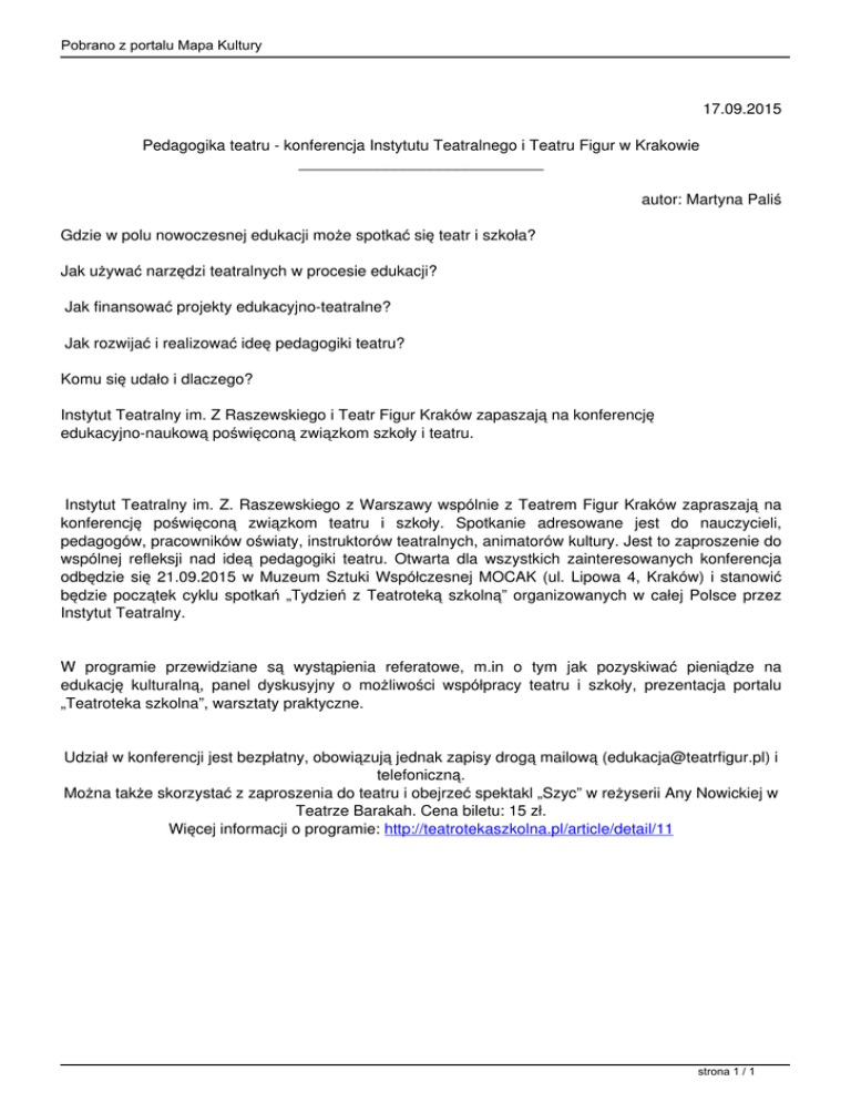 Pobrano z portalu Mapa Kultury 17.09.2015 Pedagogika teatru - konferencja Instytutu Teatralnego i Teatru Figur w Krakowie ____________________________ autor: Martyna Paliś Gdzie w polu nowoczesnej edukacji może spotkać się teatr i szkoła? Jak używać narzędzi teatralnych w procesie edukacji? Jak finansować projekty edukacyjno-teatralne? Jak rozwijać i realizować ideę pedagogiki teatru? Komu się udało i dlaczego? Instytut Teatralny im. Z Raszewskiego i Teatr Figur Kraków zapaszają na konferencję edukacyjno-naukową poświęconą związkom szkoły i teatru. Instytut Teatralny im. Z. Raszewskiego z Warszawy wspólnie z Teatrem Figur Kraków zapraszają na konferencję poświęconą związkom teatru i szkoły. Spotkanie adresowane jest do nauczycieli, pedagogów, pracowników oświaty, instruktorów teatralnych, animatorów kultury. Jest to zaproszenie do wspólnej refleksji nad ideą pedagogiki teatru. Otwarta dla wszystkich zainteresowanych konferencja odbędzie się 21.09.2015 w Muzeum Sztuki Współczesnej MOCAK (ul. Lipowa 4, Kraków) i stanowić będzie początek cyklu spotkań „Tydzień z Teatroteką szkolną” organizowanych w całej Polsce przez Instytut Teatralny. W programie przewidziane są wystąpienia referatowe, m.in o tym jak pozyskiwać pieniądze na edukację kulturalną, panel dyskusyjny o możliwości współpracy teatru i szkoły, prezentacja portalu „Teatroteka szkolna”, warsztaty praktyczne. Udział w konferencji jest bezpłatny, obowiązują jednak zapisy drogą mailową ([email protected]) i telefoniczną. Można także skorzystać z zaproszenia do teatru i obejrzeć spektakl „Szyc” w reżyserii Any Nowickiej w Teatrze Barakah. Cena biletu: 15 zł. Więcej informacji o programie: http://teatrotekaszkolna.pl/article/detail/11 strona 1 / 1