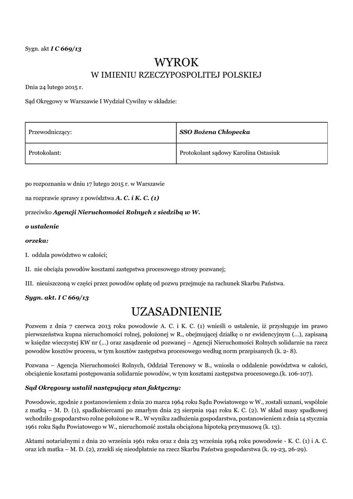 Sygn. akt I C 669/13 WYROK W IMIENIU RZECZYPOSPOLITEJ POLSKIEJ Dnia 24 lutego 2015 r. Sąd Okręgowy w Warszawie I Wydział Cywilny w składzie: Przewodniczący: SSO Bożena Chłopecka Protokolant: Protokolant sądowy Karolina Ostasiuk po rozpoznaniu w dniu 17 lutego 2015 r. w Warszawie na rozprawie sprawy z powództwa A. C. i K. C. (1) przeciwko Agencji Nieruchomości Rolnych z siedzibą w W. o ustalenie orzeka: I. oddala powództwo w całości; II. nie obciąża powodów kosztami zastępstwa procesowego strony pozwanej; III. nieuiszczoną w części przez powodów opłatę od pozwu przejmuje na rachunek Skarbu Państwa. Sygn. akt. I C 669/13 UZASADNIENIE Pozwem z dnia 7 czerwca 2013 roku powodowie A. C. i K. C. (1) wnieśli o ustalenie, iż przysługuje im prawo pierwszeństwa kupna nieruchomości rolnej, położonej w R., obejmującej działkę o nr ewidencyjnym (...), zapisaną w księdze wieczystej KW nr (...) oraz zasądzenie od pozwanej – Agencji Nieruchomości Rolnych solidarnie na rzecz powodów kosztów procesu, w tym kosztów zastępstwa procesowego według norm przepisanych (k. 2- 8). Pozwana – Agencja Nieruchomości Rolnych, Oddział Terenowy w B., wniosła o oddalenie powództwa w całości, obciążenie kosztami postępowania solidarnie powodów, w tym kosztami zastępstwa procesowego.(k. 106-107). Sąd Okręgowy ustalił następujący stan faktyczny: Powodowie, zgodnie z postanowieniem z dnia 20 marca 1964 roku Sądu Powiatowego w W., zostali uznani, wspólnie z matką – M. D. (1), spadkobiercami po zmarłym dnia 23 sierpnia 1941 roku K. C. (2). W skład masy spadkowej wchodziło gospodarstwo rolne położone w R.. W wyniku zadłużenia gospodarstwa, postanowieniem z dnia 14 stycznia 1961 roku Sądu Powiatowego w W., nieruchomość została obciążona hipoteką przymusową (k. 13). Aktami notarialnymi z dnia 20 września 1961 roku oraz z dnia 23 września 1964 roku powodowie - K. C. (1) i A. C. oraz ich matka – M. D. (2), zrzekli się nieodpłatnie na rzecz Skarbu Państwa gospodarstwa (k. 19-23, 26-29). Aktualnie nieruchomość, w wyniku podziału na działki o numerach (...) znajduje się we własności Skarbu Państwa – Agencji Nieruchomości Rolnych (działka nr (...)) oraz osoby prywatnej (działka nr (...)). W okresie luty – maj 2012 roku powodowie oraz pozwana Agencja Nieruchomości Rolnych prowadzili korespondencję w zakresie uznania prawa pierwszeństwa kupna przez powodów, jako byłych właścicieli, spornej nieruchomości. Pozwana nie uznała roszczenia powodów (k. 48-53). Sąd ustalił powyższy stan faktyczny na podstawie dokumentów przedłożonych przez strony, które w ocenie Sądu nie budziły wątpliwości co do ich autentyczności, zwłaszcza, że żadna ze stron ich nie kwestionowała. Zeznania świadków i stron nie wniosły niczego istotnego do stanu faktycznego sprawy. Sąd Okręgowy zważył, co następuje: Powództwo nie zasługuje na uwzględnienie. Podstawę roszczenia powodów stanowi przepis art. 29 ust. 1 pkt 1 ustawy z dnia 19 października 1991 roku o gospodarowaniu nieruchomościami rolnymi Skarbu Państwa (Dz. U. z 2007 r., nr 231, poz. 2128 ze zm.). W myśl powołanego przepisu pierwszeństwo zakupu nieruchomości Zasobu przysługuje byłemu właścicielowi zbywanej nieruchomości lub jej spadkobiercom, jeżeli nieruchomość została przejęta na rzecz Skarbu Państwa przed dniem 1 stycznia 1992 roku. W przedmiotowej sprawie nie stanowiły sporu okoliczności następstwa prawnego powodów i tego, że są oni spadkobiercami poprzedniego właściciela spornej nieruchomości. Nie była kwestionowana także okoliczność własności K. C. (2) – ojca powodów. Kwestią, jaka pozostała do rozstrzygnięcia, była okoliczność przejęcia nieruchomości na rzecz Skarbu Państwa. Pojęcie „przejęcie” było poddane wielokrotnej analizie przez orzecznictwo sądów powszechnych oraz Trybunał Konstytucyjny. Choć analiza ta przebiegła na gruncie przepisu art. 23 ust. 4 ustawy z dnia 29 kwietnia 1985 roku o gospodarce gruntami i wywłaszczaniu nieruchomości (Dz.U. z 1991 r. Nr 30, poz. 127 ze zm.), zachowuje ona aktualność także w stosunku do przepisu art. 29 ust. 1 pkt 1 ustawy z dnia 19 października 1991 roku o gospodarowaniu nieruchomościami rolnymi Skarby Państwa (Dz. U. z 2007 r., nr 231, poz. 2128 ze zm.), bowiem zakres obu przepisów jest podobny. Jak wypowiada się Trybunał Konstytucyjny w uzasadnieniu swej uchwały z dnia 18 czerwca 1996 roku, sygnatura akt: W.19/95 (OTK 1996, nr 3/6 poz. 25), zasada pierwszeństwa, wyrażona w art. 23 ust. 4 ustawy z dnia 29 kwietnia 1985 roku o gospodarce gruntami i wywłaszczaniu nieruchomości "służy ochronie słusznych interesów osób, które dawniej pozbawiano ich praw do nieruchomości". Jak dalej stwierdza Trybunał Konstytucyjny, w pojęciu "przejęcia na rzecz Skarbu Państwa" kryją się różne zdarzenia prawne, wszystkie jednak przykłady zawierają w sobie jeden wspólny element: przymusowe odjęcie prawa własności, nawet wówczas, gdy formalnie odbywało się to na gruncie prawa cywilnego, jak "wykonanie roszczenia o przeniesienie własności". Podsumowując, Trybunał Konstytucyjny stwierdza, że sformułowanie użyte w art. 23 ust. 4 cytowanej ustawy "obejmuje grunty, które w latach 1944- 1990 przechodziły z mocy samego prawa, na podstawie orzeczeń sądowych, aktów administracyjnych lub zdarzeń cywilnoprawnych - na własność Skarbu Państwa (...)". Nie można jednak zapominać, że mówiąc o zdarzeniach cywilnoprawnych, Trybunał ma na myśli zdarzenia zagrożone przymusem państwowym. Analizę pojęcia „przejęcie” przeprowadził także Sąd Najwyższy – wyrok z dnia 3 września 2003 roku, II CKN 417/01, w którym stwierdził, iż „element wyboru, przed którym powódka została postawiona, tzn. zawarcie umowy lub wydanie decyzji wywłaszczeniowej, nie przesądza o dokonaniu "przejęcia" nieruchomości. (…) Decydującego znaczenia nie