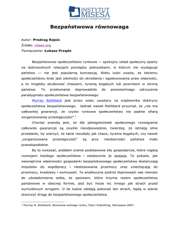 Bezpaństwowa równowaga Autor: Predrag Rajsic Źródło: mises.org Tłumaczenie: Łukasz Prządo Bezpaństwowe społeczeństwo rynkowe — spokojny układ społeczny oparty na dobrowolnych relacjach pomiędzy jednostkami, w którym nie występuje państwo — nie jest popularną koncepcją. Wielu ludzi uważa, że takiemu społeczeństwu brak jest zdolności do określania i egzekwowania praw własności, a to mogłoby skutkować chaosem, tyranią bogatych lub powrotem w stronę państwa. To przekonanie doprowadziło do powszechnego odrzucenia paradygmatu społeczeństwa bezpaństwowego. Murray Rothbard jest przez wielu uważany za orędownika doktryny społeczeństwa bezpaństwowego. Jednak nawet Rothbard przyznał, że „nie ma całkowitej gwarancji, że czysto rynkowe społeczeństwo nie padnie ofiarą zorganizowanej przestępczości” 1. Chociaż prawdą jest, że dla jakiegokolwiek społecznego rozwiązania całkowite gwarancje są zwykle nieodpowiednie, twierdzę, że istnieją silne przesłanki, by wierzyć, że takie rezultaty jak chaos, tyrania bogatych, czy nawet „zorganizowana przestępczość” są przy nieobecności państwa mało prawdopodobne. By to wykazać, poddam ocenie podstawowe siły gospodarcze, które rządzą rozwojem każdego społeczeństwa i ostatecznie je spajają. To pokaże, jak wewnętrzne właściwości gospodarki bezpaństwowego społeczeństwa dostarczają impulsów do współpracy i niestosowania przemocy oraz zniechęcają do przemocy, kradzieży i wymuszeń. Ta analityczna podróż doprowadzi nas również do uświadomienia sobie, że spoiwem, które trzyma razem społeczeństwa państwowe w obecnej formie, jest być może nic innego jak strach przed wymyślonym wrogiem. O ile ludzie zdołają pokonać ten strach, będą w stanie otworzyć drogę do bezpaństwowego społeczeństwa. 1 Murray N. Rothbard, Ekonomia wolnego rynku, Fijorr Publishing, Warszawa 2007. Ani chaos, ani tyrania Typową odpowiedzią, jaką słyszy się, kwestionując konieczność istnienia państwa jest to, że w przypadku braku państwa zwrócilibyśmy się przeciwko samym sobie i zaczęlibyśmy zabierać sobie zasoby. A skoro nie byłoby państwa, które „regulowałoby” to zabieranie, nastąpiłby chaos. Wszyscy rzekomo stali by się zabierającymi. Taki rezultat jest jednak mało prawdopodobny z przynajmniej dwóch powodów. Po pierwsze, jak każda inna działalność gospodarcza, zabieranie innym wymaga użycia ograniczonych zasobów. Mogą być one uzyskane poprzez odkrycie, produkcję, wymianę, darowiznę lub siłowe odebranie innym. Ci, którzy chcą zabierać innym, najpierw muszą zdobyć zasoby, których mogliby użyć w późniejszym procesie zabierania. To oznacza, że początkowe zasoby niezbędne do zabierania innym powinny być uzyskane dzięki metodzie innej niż zabieranie, tj. poprzez odkrycie, produkcję, wymianę lub darowiznę. Tak więc sytuacja, w której każdy zdobywa zasoby poprzez zabieranie innym, nie może być początkowym stadium żadnego społeczeństwa. Ktoś musi najpierw znaleźć lub wyprodukować dobra, zanim te dobra będą mogły być mu odebrane. Jakiekolwiek społeczeństwo oparte wyłącznie na braniu od innych jest nielogiczne. Natomiast społeczeństwo, w którym część ludzi zabiera, podczas gdy reszta produkuje, rzeczywistości. Nie byłoby jest czymś, także czego moglibyśmy wykluczone, że te się same spodziewać jednostki w mogą produkować w określonych momentach, a zabierać w innych2. Drugim powodem, dla którego wszyscy nie zamienilibyśmy się w zabierających, jest fakt, że niewyspecjalizowane jednostki są mniej produktywne niż ci, którzy specjalizują się w kilku działalnościach lub tylko w jednej. Prawo przewagi komparatywnej lub prawo asocjacji zmusza ludzi do specjalizacji w działaniach, podczas gdy większość produktów i usług uzyskują od innych wyspecjalizowanych jednostek. W ten sposób każdy może cieszyć się większą ilością dóbr i usług niż w przypadku samowystarczalności. Dlatego też w 2 Niektórzy stwierdziliby nawet, że wszyscy jesteśmy zabierającymi i producentami w tym samym czasie, ponieważ dzięki istnieniu państwa wymuszamy pieniądze od innych poprzez opodatkowanie, lecz sami również płacimy podatki. W państwowym społeczeństwie możemy faktycznie być jednocześnie producentami i zabierającymi, ponieważ zabieranie występuje pośrednio poprzez państwo, a siły państwa używane są, by zapobiec użyciu przez jednostkę własnej siły fizycznej przeciwko temu rodzaju zabierania (opodatkowaniu). bezpaństwowym społeczeństwie — jak w każdym innym — różni ludzie specjalizowaliby się w różnych czynnościach. Tylko część specjalizowałaby się w zabieraniu innym. Ów proces zabierania nie jest jednak tak atrakcyjny, jak może się to wydawać na pierwszy bezpaństwowym rzut oka. społeczeństwie Po byłoby pierwsze, raczej w trudno ubogim zostać w kapitał, efektywnym zabierającym z powodu wymogu posiadania początkowego zasobu jako czynnika niezbędnego do udanego procesu zabierania. Jeśli ktoś zacznie zabierać od innych w sytuacji, w której zdobył tylko niski poziom początkowego bogactwa (powiedzmy jaskinię i kij), ten nie będzie w stanie efektywnie się bronić przed tymi, którym zabrał zasoby. A zatem proces zabierania musi być poprzedzony procesem akumulacji kapitału. Jednak co z brakiem państwa w społeczeństwie bogatym w kapitał ― takim jak to, w którym żyjemy? Niektórzy twierdzą, że jeśli państwo zostałoby zniesione, bogaci użyliby swoich obfitych zasobów, by zmusić biednych do posłuszeństwa. To rzekomo zmieniłoby obecny system w system pracy przymusowej z minimalnym wynagrodzeniem. Właściciele firm przypuszczalnie dostarczaliby pracownikom jedynie tyle zasobów, by zapewnić wyżywienie, mieszkanie i odzienie. Jednak nie jest do końca jasne, dlaczego właściciele firm chcieliby podporządkować sob