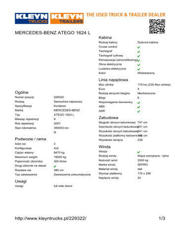 MERCEDES-BENZ ATEGO 1624 L Kabina Rodzaj kabiny Dzienna kabina Cruise control Tachograf Tachograf cyfrowy Klimatyzacja (airconditioning) Okna elektryczne Lusterka elektryczne Kolor Wielobarwny Linia napędowa Ogólne Moc silnika 175 kw (235 Moc silnika) Euro 4 Rodzaj skrzynki biegów Mechaniczna Numer pozycji 229322 Biegi 6 Rodzaj Samochód ciężarowy Wspomaganie kierownicy Specyfikacja Kontener ABS Marka MERCEDES-BENZ ASR Typ ATEGO 1624 L Miesiąc rejestracji 9 Zabudowa Rok rejestracji 2007 Długość skrzyni ładunkowej 747 cm Stan kilometrów 359353 km Szerokość skrzyni ładunkowej251 cm N Wysokość skrzyni ładunkowej241 cm Wysokość platformy ładowniczej 116 cm Podwozie / rama Wysokość skrajna 238 Ilość osi 2 Konfiguracja 4x2 Winda Ciężar własny 8470 kg Winda Maximum weight 16000 kg Rodzaj windy Klapa zamykana - tylna Pojemność zbiornika 300 litrów Nośność wind 2000 kg Marka windy ZEPRO Drugi zbiornik na diesel Rozstaw osi 480 cm Materiał windy stal Typ zawieszenia Zawieszenie pneumatyczne Wymiar platformy 170 x 256 Napięcie windy 24 Uwagi Uwagi full side doors http://www.kleyntrucks.pl/229322/ 1/3 MERCEDES-BENZ ATEGO 1624 L Ilość osi mm mm Hamulce tarczowe Rodzaj osi skrętnej Mechaniczne Typ zawieszenia Zawieszenie resorowe Wymiar opony 305/70R19,5 Oś skrętna Raport inspekcji Tachograf Kody wyświetlacza Elektryczny Kolumna kierownicу Resory mm mm Hamulce tarczowe Typ zawieszenia Zawieszenie pneumatyczne Wymiar opony 305/70R19,5 Rama Idealny/nowy Hamulce Bardzo dobry Silnik - całość Rozsądny Stan Układ chłodzenia Akceptowalny Układ paliwowy Nie spełnia wymagań Układ wydechowy Układ smarowania Skrzynka biegów Sprzęgło Napęd Obsługa Układ Opony http://www.kleyntrucks.pl/229322/ 2/3 MERCEDES-BENZ ATEGO 1624 L http://www.kleyntrucks.pl/229322/ 3/3