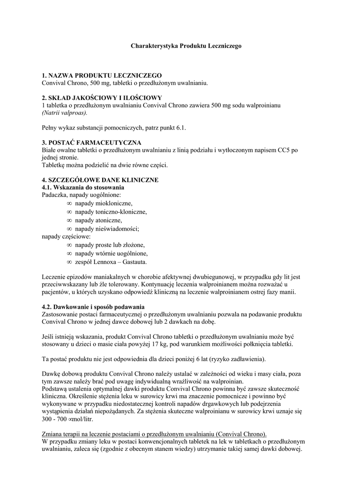 Charakterystyka Produktu Leczniczego 1. NAZWA PRODUKTU LECZNICZEGO Convival Chrono, 500 mg, tabletki o przedłużonym uwalnianiu. 2. SKŁAD JAKOŚCIOWY I ILOŚCIOWY 1 tabletka o przedłużonym uwalnianiu Convival Chrono zawiera 500 mg sodu walproinianu (Natrii valproas). Pełny wykaz substancji pomocniczych, patrz punkt 6.1. 3. POSTAĆ FARMACEUTYCZNA Białe owalne tabletki o przedłużonym uwalnianiu z linią podziału i wytłoczonym napisem CC5 po jednej stronie. Tabletkę można podzielić na dwie równe części. 4. SZCZEGÓŁOWE DANE KLINICZNE 4.1. Wskazania do stosowania Padaczka, napady uogólnione: • napady miokloniczne, • napady toniczno-kloniczne, • napady atoniczne, • napady nieświadomości; napady częściowe: • napady proste lub złożone, • napady wtórnie uogólnione, • zespół Lennoxa – Gastauta. Leczenie epizodów maniakalnych w chorobie afektywnej dwubiegunowej, w przypadku gdy lit jest przeciwwskazany lub źle tolerowany. Kontynuację leczenia walproinianem można rozważać u pacjentów, u których uzyskano odpowiedź kliniczną na leczenie walproinianem ostrej fazy manii. 4.2. Dawkowanie i sposób podawania Zastosowanie postaci farmaceutycznej o przedłużonym uwalnianiu pozwala na podawanie produktu Convival Chrono w jednej dawce dobowej lub 2 dawkach na dobę. Jeśli istnieją wskazania, produkt Convival Chrono tabletki o przedłużonym uwalnianiu może być stosowany u dzieci o masie ciała powyżej 17 kg, pod warunkiem możliwości połknięcia tabletki. Ta postać produktu nie jest odpowiednia dla dzieci poniżej 6 lat (ryzyko zadławienia). Dawkę dobową produktu Convival Chrono należy ustalać w zależności od wieku i masy ciała, poza tym zawsze należy brać pod uwagę indywidualną wrażliwość na walproinian. Podstawą ustalenia optymalnej dawki produktu Convival Chrono powinna być zawsze skuteczność kliniczna. Określenie stężenia leku w surowicy krwi ma znaczenie pomocnicze i powinno być wykonywane w przypadku niedostatecznej kontroli napadów drgawkowych lub podejrzenia wystąpienia działań niepożądanych. Za stężenia skuteczne walproinianu w surowicy krwi uznaje się 300 - 700 µmol/litr. Zmiana terapii na leczenie postaciami o przedłużonym uwalnianiu (Convival Chrono). W przypadku zmiany leku w postaci konwencjonalnych tabletek na lek w tabletkach o przedłużonym uwalnianiu, zaleca się (zgodnie z obecnym stanem wiedzy) utrzymanie takiej samej dawki dobowej. Rozpoczynanie leczenia produktem Convival Chrono w padaczce: W razie rozpoczynania leczenia produktem Convival Chrono jako jedynym lekiem przeciwpadaczkowym, dawkę należy zwiększać co 2-3 dni, tak, aby po tygodniu osiągnąć średnią zalecaną dawkę. W razie wprowadzania produktu Convival Chrono u pacjentów już leczonych innymi lekami przeciwpadaczkowymi, należy stopniowo zwiększać dawkę produktu Convival Chrono, aż do osiągnięcia średniej zalecanej dawki w ciągu 2 tygodni. Następnie należy zmniejszyć dawkę pozostałych leków w stopniu zapewniającym optymalną kontrolę napadów drgawkowych lub ewentualnie zaprzestać ich stosowania. W razie konieczności dołączenia do terapii innych leków przeciwdrgawkowych, należy wprowadzać je stopniowo (patrz punkt 4.5). Początkowa dawka dobowa wynosi zwykle 5 do 15 mg/kg masy ciała i powinna być zwiększana stopniowo co 2-3 dni po 5 mg/kg masy ciała do osiągnięcia dawki optymalnej (patrz: Rozpoczynanie leczenia produktem Convival Chrono). Zwykle dawka dobowa wynosi 20 do 30 mg/kg masy ciała podawana w jednej lub w dwóch dawkach podzielonych. W razie konieczności dawka dobowa może być nawet większa niż 50 mg/kg masy ciała pod warunkiem prowadzenia ścisłej kontroli klinicznej stanu pacjenta (patrz punkt 4.4.). Dzieci powyżej 17 kg masy ciała Przeciętna dawka to 30 mg/kg masy ciała na dobę. Dorośli Przeciętna dawka to 20 do 30 mg/kg masy ciała na dobę. Pacjenci w podeszłym wieku Farmakokinetyka leku może zmieniać się w stopniu nie mającym istotnego znaczenia klinicznego. Dawkowanie powinno być uzależnione od wyników terapii (kontrola napadów drgawkowych). Epizody maniakalne w chorobie afektywnej dwubiegunowej: Dorośli: Dawkę dobową powinien ustalić i sprawdzać indywidualnie lekarz prowadzący. Zalecana początkowa dawka dobowa wynosi 750 mg. Ponadto w badaniach klinicznych uzyskano zadowalający profil bezpieczeństwa po zastosowaniu dawki początkowej wynoszącej 20 mg walproinianu /kg masy ciała. Postacie leku o przedłużonym uwalnianiu można podawać raz lub dwa razy dziennie. Dawkę należy zwiększać tak szybko, jak to możliwe, do uzyskania najniższego stężenia terapeutycznego zapewniającego pożądany efekt kliniczny. Aby ustalić najniższą skuteczną dawkę dla konkretnego pacjenta, dawkę dobową należy dostosować do odpowiedzi klinicznej. Średnia dawka dobowa wynosi zazwyczaj od 1000 do 2000 mg walproinianu. Pacjenci otrzymujący dawki dobowe przekraczające 45 mg/kg masy ciała powinni pozostawać pod ścisłą obserwacją. Kontynuację leczenia epizodów maniakalnych w chorobie afektywnej dwubiegunowej należy dostosowywać indywidualnie, tak, aby pacjent przyjmował najniższą skuteczną dawkę. Dzieci i młodzież: Nie ustalono bezpieczeństwa stosowania i skuteczności produktu leczniczego Convival Chrono w leczeniu epizodów maniakalnych w chorobie afektywnej dwubiegunowej u pacjentów poniżej 18 lat. 4.3. Przeciwwskazania - Nadwrażliwość na walproinian sodu lub którąkolwiek substancję pomocniczą produktu - Ostre i przewlekłe zapalenie wątroby 2 - Stosowanie u pacjenta z przebytym ciężkim zapaleniem wątroby, zwłaszcza polekowym lub u pacjenta z wywiadem rodzinnym świadczącym o ciężkim zapaleniu wątroby - Porfiria - Jednoczesne stosowanie z meflochiną 4.4. Specjalne ostrzeżenia i środki ostrożności dotyczące stosowania W rzadkich przypadkach rozpoczęcie leczenia lekiem przeciwpadaczkowym może powodować u 
