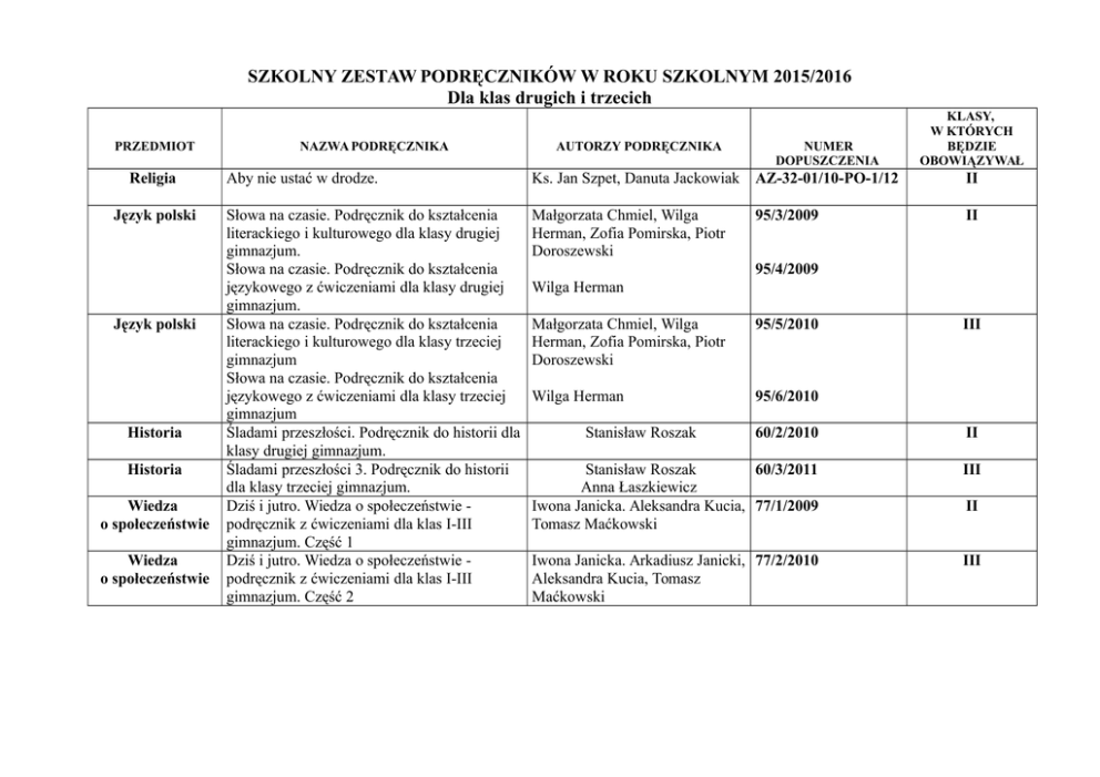 SZKOLNY ZESTAW PODRĘCZNIKÓW W ROKU SZKOLNYM 2015/2016 Dla klas drugich i trzecich PRZEDMIOT Religia Język polski Język polski Historia Historia Wiedza o społeczeństwie Wiedza o społeczeństwie NAZWA PODRĘCZNIKA AUTORZY PODRĘCZNIKA NUMER DOPUSZCZENIA KLASY, W KTÓRYCH BĘDZIE OBOWIĄZYWAŁ Aby nie ustać w drodze. Ks. Jan Szpet, Danuta Jackowiak AZ-32-01/10-PO-1/12 II Słowa na czasie. Podręcznik do kształcenia literackiego i kulturowego dla klasy drugiej gimnazjum. Słowa na czasie. Podręcznik do kształcenia językowego z ćwiczeniami dla klasy drugiej gimnazjum. Słowa na czasie. Podręcznik do kształcenia literackiego i kulturowego dla klasy trzeciej gimnazjum Słowa na czasie. Podręcznik do kształcenia językowego z ćwiczeniami dla klasy trzeciej gimnazjum Śladami przeszłości. Podręcznik do historii dla klasy drugiej gimnazjum. Śladami przeszłości 3. Podręcznik do historii dla klasy trzeciej gimnazjum. Dziś i jutro. Wiedza o społeczeństwie podręcznik z ćwiczeniami dla klas I-III gimnazjum. Część 1 Dziś i jutro. Wiedza o społeczeństwie podręcznik z ćwiczeniami dla klas I-III gimnazjum. Część 2 Małgorzata Chmiel, Wilga Herman, Zofia Pomirska, Piotr Doroszewski II 95/3/2009 95/4/2009 Wilga Herman Małgorzata Chmiel, Wilga Herman, Zofia Pomirska, Piotr Doroszewski 95/5/2010 Wilga Herman 95/6/2010 Stanisław Roszak III 60/2/2010 II Stanisław Roszak 60/3/2011 Anna Łaszkiewicz Iwona Janicka. Aleksandra Kucia, 77/1/2009 Tomasz Maćkowski III Iwona Janicka. Arkadiusz Janicki, 77/2/2010 Aleksandra Kucia, Tomasz Maćkowski III II Język angielski Język angielski Język niemiecki Voices 2. Student’s Book Catherine McBeth 313/2/2011 Voices 3. Student’s Book Catherine McBeth 313/3/2012 Voices 4. Student’s Book Voices 3. Student’s Book Catherine McBeth Catherine McBeth 313/4/2013 313/3/2012 III Kompass 2 neu. Podręcznik do języka niemieckiego dla gimnazjum Elżbieta Reymont, Agnieszka Sibiga, Małgorzata JezierskaWiejak Elżbieta Reymont, Agnieszka Sibiga, Małgorzata JezierskaWiejak Jolanta Chmielewska, Katarzyna Grabarczyk, Marzanna Szacherska Jolanta Chmielewska, Katarzyna Grabarczyk, Marzanna Szacherska Zofia Bolałek, Małgorzata Dobrowolska, Marta Jucewicz, Marcin Karpinski, Jacek Lech, Adam Mysior, Krystyna Zarzycka Zofia Bolałek, Małgorzata Dobrowolska, Marta Jucewicz, Marcin Karpinski, Jacek Lech, Adam Mysior, Krystyna Zarzycka Grażyna Francuz-Ornat, Teresa Kulawik, Maria NowotnyRóżańska 622/2/2012 II 622/3/2013 III 83/1/2009 II 83/2/2010 83/2/2010 III 168/2/2010 II 168/3/2011 III 93/2/2010 II Grażyna Francuz-Ornat, Teresa Kulawik, Maria NowotnyRóżańska 93/4/2011 Kompass 3 neu. Podręcznik do języka niemieckiego dla gimnazjum Język rosyjski Progułka. Podręcznik. Gimnazjum Język rosyjski Progułka. Gimnazjum. Klasa 2 Progułka. Gimnazjum. Klasa 2 Matematyka Matematyka Fizyka Fizyka Matematyka 2. Podręcznik dla klasy drugiej gimnazjum. Matematyka 3. Podręcznik dla klasy trzeciej gimnazjum. Spotkania z fizyką. Podręcznik dla gimnazjum. Część 2 Spotkania z fizyką. Podręcznik dla gimnazjum. Część 3 Spotkania z fizyką. Podręcznik dla gimnazjum. Część 4 II 93/3/2010 III Chemia Chemia Biologia Biologia Geografia Geografia Muzyka Edukacja dla bezpieczeństw a Informatyka Chemia Nowej Ery. Część 1. Podręcznik dla gimnazjum. Chemia Nowej Ery. Część 2. Podręcznik dla gimnazjum. Chemia Nowej Ery. Część 3. Podręcznik dla gimnazjum. Ciekawa biologia. Podręcznik dla gimnazjum. Część 2 Ciekawa biologia. Podręcznik dla gimnazjum. Część 3. Puls Ziemi. Podręcznik do geografii dla klasy drugiej gimnazjum Puls Ziemi. Podręcznik do geografii dla klasy trzeciej gimnazjum. Muzyka w gimnazjum. Podręcznik Żyję i działam bezpiecznie. Edukacja dla bezpieczeństwa. Podręcznik z ćwiczeniami dla klas 1-3 gimnazjum Informatyka. Część 1. Podręcznik dla gimnazjum Informatyka Informatyka. Część 2. Podręcznik dla gimnazjum Zajęcia techniczne Zajęcia techniczne. Podręcznik dla gimnazjum. Jan Kulawik, Teresa Kulawik, Maria Litwin 49/1/2009 II 49/2/2009 J. Kulawik, T. Kulawik, M. Litwin Ewa Kłos, Wawrzyniec Kofta, Mariola Kukier – Wyrwicka, Hanna Werblan – Jakubiec E.Kłos, W. Kofta, M. Kukier – Wyrwicka, H. Werblan – Jakubiec Bożena Dobosik, Adam Hibszer, Józef Soja Roman Malarz 49/3/2010 III 35/2/2009 II 35/3/2009 III 5/2/2010 II 5/3/2010 III Agnieszka Kreiner - Bogdańska 6/2009 II Jarosław Słoma, Grzegorz Zając 17/2009 III Marek Kołodziej 91/1/2009 II Marek Kołodziej 91/2/2010 III Urszula Białka 199/2009 III