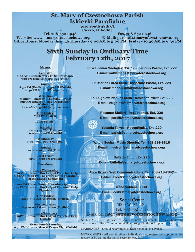 St. Mary of Czestochowa Parish Iskierki Parafialne 3010 South 48th Ct. Cicero, IL 60804 Tel. 708-652-0948 Fax. 708-652-0646 Website: www.stmaryofczestochowa.org E- Mail: [email protected] Office Hours: Monday through Thursday - 9:00 AM to 5:00 PM; Friday - 10:30 AM to 6:30 PM Sixth Sunday in Ordinary Time February 12th, 2017 Masses: Saturday 8.00 AM (English every 1st Saturday only) 5:00 PM (English), 6:30 PM (Polish) Sunday 8:30 AM (English), 10:30 AM (Polish), 12:30 PM & 4:00 PM (Spanish) Fr. Waldemar Wieladek CSsR - Superior & Pastor, Ext. 227 E-mail: [email protected] Fr. Marian Furca CSsR - Associate Pastor, Ext. 229 E-mail: [email protected] Weekdays Monday - Tuesday - Thursday - Friday 7:30 AM (English), 8:15 AM (Spanish) Wednesday 8:00 AM (English) (only one mass) Fr. Zbigniew Pienkos CSsR - Resident Priest Ext. 226 E-mail: [email protected] First Fridays 7:00 PM (Polish) Rosamar Mallari - Receptionist, Ext. 220 E-mail: [email protected] Confessions: Saturday 4:00 – 4:45 PM (Trilingual) 6:00 — 6:30PM (Polish) Wednesday 6:00 – 7:40 PM (Trilingual) Sunday 10:00 – 10:30 AM (Polish) First Friday 6:30 – 7:00 PM (Polish) Devotions: Every Wednesday 8:30AM Novena to Our Lady of Perpetual Help 8:30 AM - 7:00 PM The entire day of adoration of the Blessed Sacrament 7:00 PM Prayer Group-Adoration (Spanish) 7:45 PM Novena to Our Lady of Perpetual Help (Spanish) First Fridays 8:00-8:10 AM Adoration (English) First Saturdays 8:30-9:00 AM Adoration (English) Every Saturdays 6:30PM Novena to Our Lady of Perpetual Help (Polish) Every Fourth Saturday 6:30 PM Novena, Mass & Prayer Vigil (Polish) Yolanda Torres - Receptionist, Ext. 220 E-mail: [email protected] Witold Socha - Music Director, Tel. 708-299-8816 E-mail: [email protected] Bulletin Editor, Ext 220 E-mail: [email protected] Alice Krzak - Web Communications, Tel. 708-218-7842 E-Mail: [email protected] Irene Saldaña - CCD E-mail: [email protected] Social Center 5000 W. 31st St. Tel. 708-652-7118 E-mail: [email protected] SICK CALLS - In all cases of serious illness or accidents, a priest should be called at once. Holy Communion will be brought to the sick upon request. MARRIAGES - Should be arranged at least 6 months in advance. NEWCOMERS - All new families / individuals may register by stopping at the rectory or by calling the parish secretary ext. 220. Sunday Iskierki Parafialne 8:15 February 12, Sixth Sunday in the Ordinary Time 8:30 Homebound (St. Mary’s Choir) For Ron and Sylvia, love and health. †Ann Paida (Paida & Nowicki families) †Thomas Dutkiewicz (Hennessy Family) †Diana Madurzak (family) †Rita Barnak (Barnak family) 10:30 Za żyjących i zamarłych członków z Bractwa Różańcowego O zdrowie i Boże bł. pogodę ducha oraz opiekę Matki Bożej dla Rozalii Gutierrez W intencji Bogu wiadomej O wytrwanie w przyrzeczeniu dla Andrzeja †Henryk Kuta (Rodzina i znajomi) †Małgorzata Knieznik w 6-ta rocz. śm. (Rodzina) †Bożena Knieznik w 7-mą rocz. śm. (Rodzina †Maria Sadelska (Mąż i Dzieci) †Ignacy Papciak o radość wieczną (Rodzina) †Aniela Obrochta (Rodzina Gancarczyk) †Norbert Rachuba i Stefan Rachuba o wieczne odpoczywanie 12:30 Por la salud y bendiciones de Armando y Marbella en su 25° aniversario de boda †Petrita Domínguez, aniversario luctuoso (hijos y nietos) 4:00 †María Teresa Rivera y Jesús Vega Guzmán, eterno descanso (hijo) February 13, Monday, Weekday in Ordinary Time 7:30 †Kazimiera Klucznik 8:15 Feligreses February 14, Tuesday, Saints Cyril, Monk, and Methodius, Bishop 7:30 Blessings and health for Michael Yunker Jr on his 3rd birthday (Wojdula & Yunker family) 8:15 O zdrowie i Boże bł. dla Urszuli w dniu urodzin February 15, Wednesday, Weekday in Ordinary Time 8:00 †Jose Mendez, 1st anniversary (family) 8:30 Eucharistic Adoration until 7PM 7PM Circulo de oración 7:45 Novena a Ntra. Sra. del Perpetuo Socorro February 16, Thursday, Weekday in Ordinary Time 7:30 †Holy Souls in the Book of Remembrance 8:15 †Por las almas inscritas en el libro de la memoria February 17, The Seven Holy Founders of the Servite Order 7:30 Parishioners Feligreses February 18 Saturday, Weekday in Ordinary Time 5PM Parishioners 6:30 W intencjach próśb i podziękowań do M. B. Nieustającej Pomocy If you wish to request a mass for a deceased member or a blessing or to ask for the health of a loved one or friend, you may do so at the rectory. We are open Monday—Thursday from 9 AM to 5 PM and on Friday from 10:30 to 6:30 PM. A SMALL DONATION OF $10 PER INTENTION IS REQUIRED. Lector Schedule Saturday, February 18 5PM Sharon Wisnieski-Wente, Jean Yunker 6:30 Maria Rozanska, Felicja Jarzebowicz Sunday, February 19 8:30 John Kociolko 10:30 Alicja Krzak, Krzysztof Odbierzychleb 12:30 Los Jóvenes 4:00 Los niños Eucharistic Minister Saturday, February 18 5PM Jean Wojdula-Yunker, Frances Balla 6:30 Jan Różański Sunday, February 19 8:30 Christine Zaragoza, Ann Twomey, Ma. Carmen Castañeda 10:30 Krzysztof Odbierzychleb, Jan Radomyski, Jan Różański 12:30 Vicente Saldaña, Irene Saldaña, Nydia Cano, Ruth Trujillo 4:00 Rene Aviña, Gisela Aviña, Enrique García There is a promise of marriage between II Jose Luis Garcia & Raquel I. Salcido St. Mary of Czestochowa Sunday Collection, February 5, 2017 We ant to remind you that every Wednesday we pray the Novena to Our Lady of Perpetual Help, and during the Novena we read the petitions that have been requested. In order for you to request a petition, you will need to write down your intention, and place it in the depository box in form our the image of Our Lady of Perpetual Help. 2017 Annual Catholic Appeal “Love Your Neighbor As Yourself” Please spend some time this week reflecting on the Annual Catholic Appeal brochure that you received with your bulletin. Please remember that the Annual Catholic Appeal is much different than a one -time special collection. It is a pledge campaign where you can make a gift payable in installments. The 
