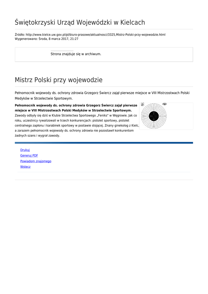 Świętokrzyski Urząd Wojewódzki w Kielcach Źródło: http://www.kielce.uw.gov.pl/pl/biuro-prasowe/aktualnosci/3325,Mistrz-Polski-przy-wojewodzie.html Wygenerowano: Środa, 8 marca 2017, 21:27 Strona znajduje się w archiwum. Mistrz Polski przy wojewodzie Pełnomocnik wojewody ds. ochrony zdrowia Grzegorz Świercz zajął pierwsze miejsce w VIII Mistrzostwach Polski Medyków w Strzelectwie Sportowym. Pełnomocnik wojewody ds. ochrony zdrowia Grzegorz Świercz zajął pierwsze miejsce w VIII Mistrzostwach Polski Medyków w Strzelectwie Sportowym. Zawody odbyły się dziś w Klubie Strzelectwa Sportowego „Feniks" w Węgrowie. Jak co roku, uczestnicy rywalizowali w trzech konkurencjach: pistolet sportowy, pistolet centralnego zapłonu i karabinek sportowy w postawie stojącej. Znany ginekolog z Kielc, a zarazem pełnomocnik wojewody ds. ochrony zdrowia nie pozostawił konkurentom żadnych szans i wygrał zawody. Drukuj Generuj PDF Powiadom znajomego Wstecz