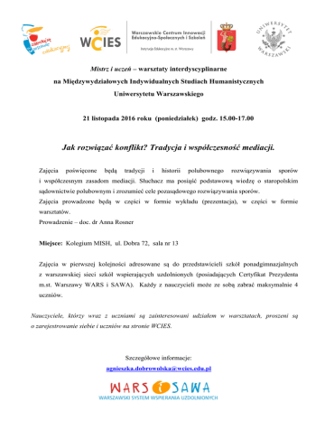 Mistrz i uczeń – warsztaty interdyscyplinarne na Międzywydziałowych Indywidualnych Studiach Humanistycznych Uniwersytetu Warszawskiego 21 listopada 2016 roku (poniedziałek) godz. 15.00-17.00 Jak rozwiązać konflikt? Tradycja i współczesność mediacji. Zajęcia poświęcone będą tradycji i historii polubownego rozwiązywania sporów i współczesnym zasadom mediacji. Słuchacz ma posiąść podstawową wiedzę o staropolskim sądownictwie polubownym i zrozumieć cele pozasądowego rozwiązywania sporów. Zajęcia prowadzone będą w części w formie wykładu (prezentacja), w części w formie warsztatów. Prowadzenie – doc. dr Anna Rosner Miejsce: Kolegium MISH, ul. Dobra 72, sala nr 13 Zajęcia w pierwszej kolejności adresowane są do przedstawicieli szkół ponadgimnazjalnych z warszawskiej sieci szkół wspierających uzdolnionych (posiadających Certyfikat Prezydenta m.st. Warszawy WARS i SAWA). Każdy z nauczycieli może ze sobą zabrać maksymalnie 4 uczniów. Nauczyciele, którzy wraz z uczniami są zainteresowani udziałem w warsztatach, proszeni są o zarejestrowanie siebie i uczniów na stronie WCIES. Szczegółowe informacje: [email protected]