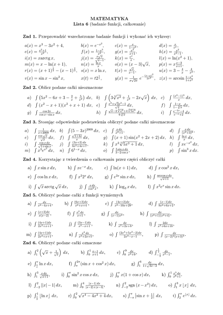 MATEMATYKA (badanie funkcji, caªkowanie) Lista 6 Przeprowadzi¢ wszechstronne badanie funkcji i wykona¢ ich wykresy: Zad 1. 2 a(x) = x3 − 3x2 + 4, 2 e(x) = x x+1 2 , i(x) = xarctg x, m(x) = x − ln(x + 1), 2 2 r(x) = (x + 1) 3 − (x − 1) 3 , b(x) = e−x , 3 f (x) = 1−x , x√2 x x j(x) = √x−1 , n(x) = lnxx , s(x) = x ln x, v(x) = sin x − sin2 x, x(t) = t2 t , x c(x) = 1−x 2, x3 g(x) = x+1 , x k(x) = ex , √ x, o(x) = (x − 3) √ x t(x) = x−1 , 1 y(x) = √1 σ 2π e− (x−µ)2 2σ 2 d(x) = exx , 2 h(x) = x2x−1 , l(x) = ln(x2 + 1), p(x) = x x−3 , x+1 4 u(x) = 3 − x − x42 , 2 , z(x) = arcsin 1−x 1+x2 Oblicz podane caªki nieoznaczone Zad 2. R √ R √ 3 1 2 a) 5x − 6x + 3 − + dx, b) 3 x + x3 − 2x x dx, c) R 2 R x3 +√3x2 −1 R √ d) (x − x + 1)(x2 + x + 1) dx, e) dx, f ) x √ 3 2 4 R cos 2x R √x−2 √ R x +4 5x3 √ g) dx, h) dx, i) 3 cos x−sin x 6 x R a) e) i) m) R R R 5 x2 1 dx, x+2009 √ cos x √ dx, x √cos x dx , 1+sin x 3 x2 x e dx, (x2 −1)3 dx, x 1−x √ dx, 1− 3 x e−2x −4 dx. e−x +2 b) R x dx , (x2 +3)6 R R ln x 2 g) (x + 1) sin(x + 2x + 2) dx, h) dx, R 2√ R x −x2 5 k) x 5x3 + 1 dx, l) xe dx, R R 5 sin x dx 3 , p) sin x dx. o) 3−2 cos x R √1+4x f) dx, x R (3x+2) dx j) 2 +4x+7 , R 3x1−x n) 6 dx, x dx , x2 +1 R (5 − 3x)2009 dx, c) R d) Korzystaj¡c z twierdzenia o caªkowaniu przez cz¦±ci obliczy¢ caªki Zad 4. b) R xe−x dx, c) R f) R x2 2x dx, R x dx g) R a) R x sin x dx, e) R cos ln x dx, i) R√ √ x arctg x dx, j) , (6x+3)dx , x2 +x+4 a) R dx , x2 −4x+4 e) R (x+2)dx , x(x−2) i) R (4x+1)dx , 2x2 +x+1 j) m) R (4x+1)dx , 2x2 +x+1 n) Zad 6. d) e2x sin x dx, R k) log3 x dx, R h) R l) R x cos2 x dx, arccos √ x dx , x+1 x2 ex sin x dx. 1 e) Re h) R3 l) R2 p) R1 1 e 1 R b) x2 dx , x+1 R f) c) g) (3x−1)dx , x2 −x+1 R R x2 dx , x2 +2x+5 R R (4x+2)dx , x2 −10x+29 d) dx , (x−1)x2 h) dx , x2 +2x+8 k) R o) R R (x−1)dx , 9x2 +6x+2 R dx , (x2 +1)(x2 +4) l) (2x4 +5x2 −2)dx , 2x3 −x−1 2dx , x2 +6x+18 R p) R dx . (x−2)2 (x+3)3 Obliczy¢ podane caªki oznaczone R 2 √ x+ √1 x dx, ln x dx, √x dx , x+1 −2 1 2 cos2 x ln(x + 1) dx, Obliczy¢ podane caªki z funkcji wymiernych Zad 5. a) Stosuj¡c odpowiednie podstawienia obliczy¢ podane caªki nieoznaczone Zad 3. R 2 x 2 f) i) ||x| − 1| dx, bln xc dx, b) Rπ 0 R 2π π R1 x−1 0 x+1 dx, c) dx , 0 x2 +9 (sin x + cos2 x) dx, sin2 x cos x dx, R4 j) |x−1| dx m) 0 |x−2|+|x−3| , R2√ r) 0 R9 x4 − 4x2 + 4 dx, g) Rπ 0 d) R 12 dx , − 12 x2 −1 R6 √dx 1 1+ 3x−2 x(1 + cos x) dx, dx, k) R2 n) −2 sgn (x − x2 ) dx, Rπ sin x + 1 dx, 2 s) −π R1 x3 dx . 0 x8 +1 R3 o) 1 x bxc dx, Rπ t) 2 ebxc dx.