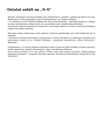 Ostatni asfalt na „N-S” Maszyny wylewające warstwę ścieralną masy bitumicznej na „eNeSce” pojawiły się dziś (4.11) rano. Rozpoczęto od nowo powstałego ronda na skrzyżowaniu z ul. Wojska Polskiego. - To umożliwi otwarcie Wojska Polskiego dla ruchu samochodwego - wyjaśniają drogowcy i dodają, że przez weekend prace będą toczyły się na pozostałej części wybudowanej obwodnicy. Na przyszły tydzień zaplanowano wylewanie czerwonego asfaltu na ścieżce rowerowej biegnącej wzdłuż trasy północ-południe. Pierwotny termin zakończenia robót upływał z końcem października, ale został wydłużony do 15 listopada. - Powodem są kolizje infrastruktury podziemnej, na które natrafiono po wykonaniu wykopów przy budowanym rondzie na ul. Wojska Polskiego - wyjaśniają inżynierowie z Biura Inwestycji i Remontów. Przypominamy, że czwarty fragment obwodnicy oprócz jezdni ma także chodniki, ścieżkę rowerową, zatoki autobusowe, przejścia dla pieszych i słupy z oświetleniem ledowym. Koszt całej inwestycji to 5,4 mln złotych. Miasto wyda tylko połowę tej kwoty. Resztę pokryją pieniądze pozyskane z „Programu Rozwoju Gminnej i Powiatowej Infrastruktury Drogowej na lata 2016-2019”.