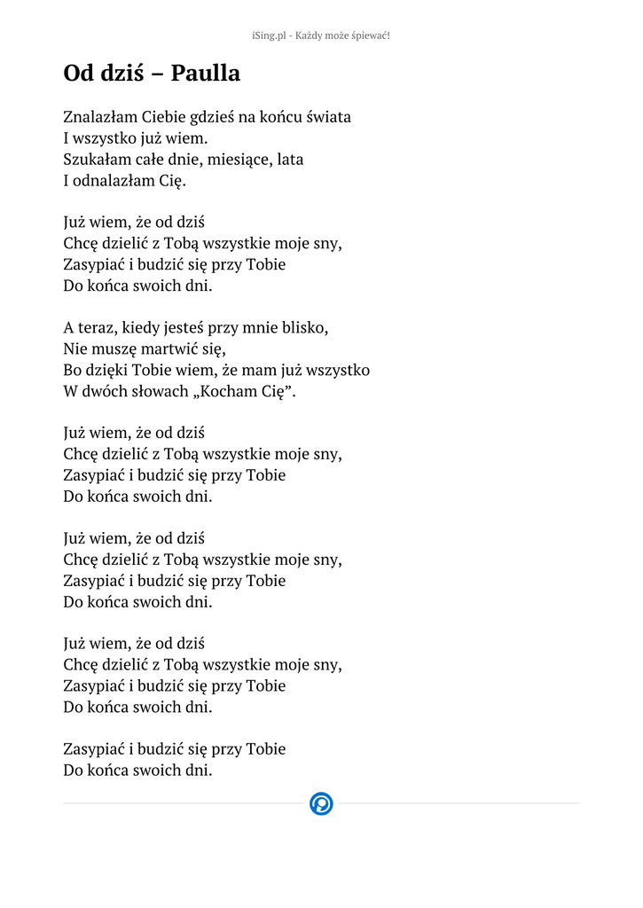 iSing.pl - Każdy może śpiewać! Od dziś – Paulla Znalazłam Ciebie gdzieś na końcu świata I wszystko już wiem. Szukałam całe dnie, miesiące, lata I odnalazłam Cię. Już wiem, że od dziś Chcę dzielić z Tobą wszystkie moje sny, Zasypiać i budzić się przy Tobie Do końca swoich dni. A teraz, kiedy jesteś przy mnie blisko, Nie muszę martwić się, Bo dzięki Tobie wiem, że mam już wszystko W dwóch słowach „Kocham Cię”. Już wiem, że od dziś Chcę dzielić z Tobą wszystkie moje sny, Zasypiać i budzić się przy Tobie Do końca swoich dni. Już wiem, że od dziś Chcę dzielić z Tobą wszystkie moje sny, Zasypiać i budzić się przy Tobie Do końca swoich dni. Już wiem, że od dziś Chcę dzielić z Tobą wszystkie moje sny, Zasypiać i budzić się przy Tobie Do końca swoich dni. Zasypiać i budzić się przy Tobie Do końca swoich dni. Słowa: Adam Konkol Muzyka: Adam Konkol Rok wydania: brak danych Płyta: brak danych
