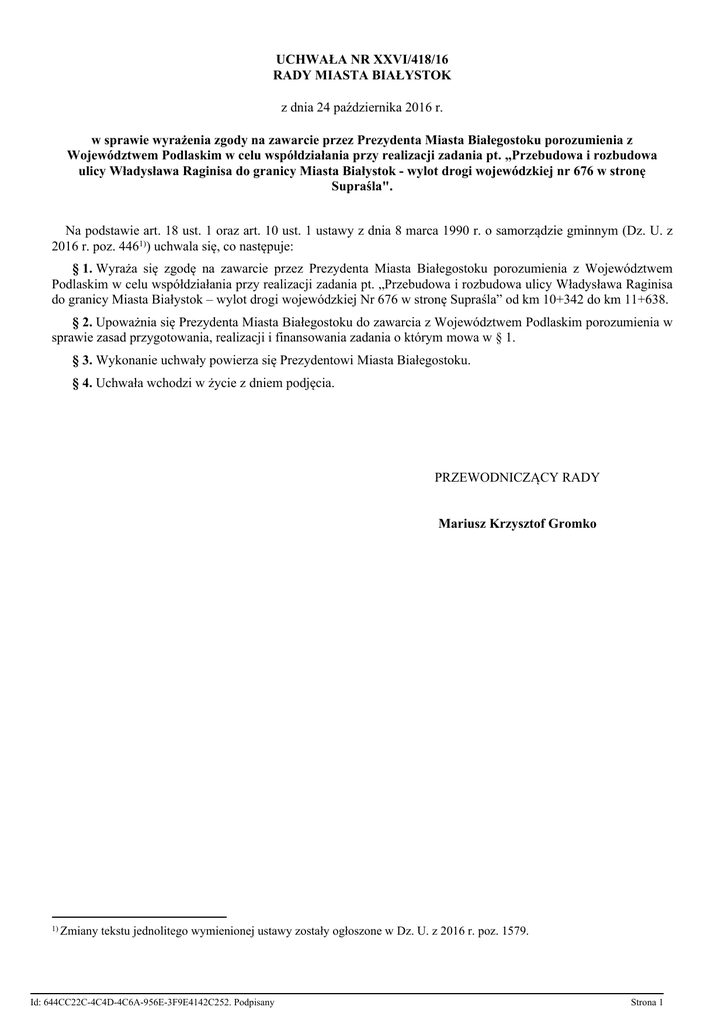 UCHWAŁA NR XXVI/418/16 RADY MIASTA BIAŁYSTOK z dnia 24 października 2016 r. w sprawie wyrażenia zgody na zawarcie przez Prezydenta Miasta Białegostoku porozumienia z Województwem Podlaskim w celu współdziałania przy realizacji zadania pt. ,,Przebudowa i rozbudowa ulicy Władysława Raginisa do granicy Miasta Białystok - wylot drogi wojewódzkiej nr 676 w stronę Supraśla". Na podstawie art. 18 ust. 1 oraz art. 10 ust. 1 ustawy z dnia 8 marca 1990 r. o samorządzie gminnym (Dz. U. z 2016 r. poz. 4461)) uchwala się, co następuje: § 1. Wyraża się zgodę na zawarcie przez Prezydenta Miasta Białegostoku porozumienia z Województwem Podlaskim w celu współdziałania przy realizacji zadania pt. „Przebudowa i rozbudowa ulicy Władysława Raginisa do granicy Miasta Białystok – wylot drogi wojewódzkiej Nr 676 w stronę Supraśla” od km 10+342 do km 11+638. § 2. Upoważnia się Prezydenta Miasta Białegostoku do zawarcia z Województwem Podlaskim porozumienia w sprawie zasad przygotowania, realizacji i finansowania zadania o którym mowa w § 1. § 3. Wykonanie uchwały powierza się Prezydentowi Miasta Białegostoku. § 4. Uchwała wchodzi w życie z dniem podjęcia. PRZEWODNICZĄCY RADY Mariusz Krzysztof Gromko 1) Zmiany tekstu jednolitego wymienionej ustawy zostały ogłoszone w Dz. U. z 2016 r. poz. 1579. Id: 644CC22C-4C4D-4C6A-956E-3F9E4142C252. Podpisany Strona 1