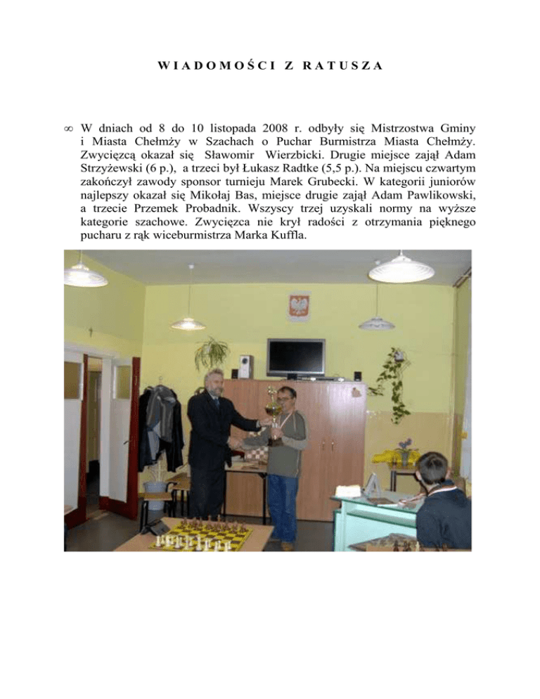 WIADOMOŚCI Z RATUSZA • W dniach od 8 do 10 listopada 2008 r. odbyły się Mistrzostwa Gminy i Miasta ChełmŜy w Szachach o Puchar Burmistrza Miasta ChełmŜy. Zwycięzcą okazał się Sławomir Wierzbicki. Drugie miejsce zajął Adam StrzyŜewski (6 p.), a trzeci był Łukasz Radtke (5,5 p.). Na miejscu czwartym zakończył zawody sponsor turnieju Marek Grubecki. W kategorii juniorów najlepszy okazał się Mikołaj Bas, miejsce drugie zajął Adam Pawlikowski, a trzecie Przemek Probadnik. Wszyscy trzej uzyskali normy na wyŜsze kategorie szachowe. Zwycięzca nie krył radości z otrzymania pięknego pucharu z rąk wiceburmistrza Marka Kuffla. • W dniu 11 listopada br. odbyły się uroczystości związane z Narodowym Świętem Niepodległości . Jak co roku o godz. 10.00 odbyła się msza św. w intencji Ojczyzny, po której nastąpił przemarsz w asyście orkiestry szlakiem miejsc pamięci narodowej. W obchodach wzięli udział przedstawiciele władz miasta, poczty sztandarowe, harcerze oraz mieszkańcy ChełmŜy. • W czwartek 13 listopada 2008 r. po ośmiu latach wznowione zostały kursy pociągów na trasie ChełmŜa – Bydgoszcz. Spółka PKP Przewozy Regionalne, która świadczy usługi na tej trasie gwarantuje 16 pociągów łączących ChełmŜę z Bydgoszczą. Rozkład jazdy pociągów wraz z cennikiem dostępny jest na stronie www.chelmza.pl i obowiązuje do końca grudnia 2008 r. • Zgodnie z rozporządzeniem Rady Ministrów z dnia 21 listopada 2000 r. (Dz. U. z 2000 r. Nr 112, poz. 1182 z późń. zm.) w sprawie wzoru dowodu osobistego oraz trybu postępowania w sprawach wydania dowodów osobistych, ich wymiany, zwrotu lub utraty, złoŜenie wniosku o wydanie dowodu osobistego wymaga osobistego stawiennictwa wnioskodawcy. Wniosek moŜna składać za pośrednictwem organu gminy właściwego ze względu na miejsce pobytu czasowego wnioskodawcy, jeŜeli jego złoŜenie we właściwym organie gminy nie jest moŜliwe. Tym samym naleŜy podkreślić, Ŝe nie ma moŜliwości zarówno przesłania wniosku pocztą, jak i złoŜenia go za pośrednictwem konsula czy teŜ pełnomocnika. Obywatele polscy przebywający poza granicami kraju nie mogą korzystać z pośrednictwa konsuli. Obowiązujący stan prawny nie przewiduje jakiegokolwiek pośrednictwa (pełnomocnictwa) – konieczne jest osobiste stawiennictwo obywatela. Polacy zamieszkujący stale poza granicami naszego kraju mają prawo, nie obowiązek, posiadania waŜnego dowodu osobistego. Osoby te powinny posiadać przede wszystkim paszport, który uprawnia do przekraczania granicy i pobytu za granicą, a zarazem poświadcza obywatelstwo polskie. Jedynie osoba będąca obywatelem polskim i zamieszkała w RP jest zobowiązana posiadać dowód osobisty. • Zgodnie z art. 14 ust. 2 ustawy z dnia 10 kwietnia 1974 r. o ewidencji ludności i dowodach osobistych /tekst jedn. Dz. U. z 2006 r. nr 139, poz. 993 z późn.zm./ zgłoszenie urodzenia dziecka dokonane we właściwym urzędzie stanu cywilnego zastępuje zameldowanie. Przepis ten dotyczy wyłącznie dzieci urodzonych na terytorium Rzeczypospolitej Polskiej. W przypadku umiejscowienia w polskich księgach stanu cywilnego aktu dziecka urodzonego poza granicami naszego kraju, zameldowanie powinno nastąpić na ogólnych zasadach tj. na podstawie wypełnionego formularza zgłoszenia miejsca pobytu, nie zaś z urzędu. • Rejestracja przedpoborowych rocznika 1990. Zgodnie z art. 31 ustawy z dnia 21 listopada 1967 r. o powszechnym obowiązku obrony Rzeczypospolitej Polskiej ( Dz. U. z 2004 r. Nr 241, poz. 2416 z późń. zm. ) w dniach 21 do 23 listopada 2008 r. w Urzędzie Miasta ChełmŜy została przeprowadzona rejestracja przedpoborowych rocznika 1990. Zgłosiło się 97 osób co stanowi 93 % wszystkich podlegających rejestracji. W przypadku pozostałych osób zostały wydane decyzje o przymusowym doprowadzeniu przez policję. • Burmistrz Miasta wszczął procedury przetargowe w trybie przetargów nieograniczonych na realizację niŜej podanych zadań : – – – „Na prowadzenie płatnego obszaru parkowania pojazdów oraz pobierania opłat w okresie od 2 stycznia 2009 roku do 31 grudnia 2010 roku”. W postępowaniu zostało wyznaczone dla oferenta wniesienie obligatoryjnie wadium w kwocie – 2000,00 zł, ofertę przetargową naleŜy złoŜyć w sekretariacie Urzędu Miasta ChełmŜy, przy ul.Gen.Hallera 2, pok. Nr 2, w terminie do dnia 2 grudnia br., do godz.12ºº. “Na remonty nawierzchni bitumicznych na drogach gminnych w granicach administracyjnych miasta ChełmŜy w latach 2009 i 2010”. Zamawiający przewiduje w postępowaniu wniesienie obowiązkowego wadium w wysokości 4.000,00 zł, ofertę przetargową naleŜy złoŜyć w sekretariacie Urzędu Miasta ChełmŜy, przy ul.Gen.Hallera 2, pok. Nr 2, w terminie do dnia 2 grudnia br., do godz.12ºº. „Na utrzymanie dróg gminnych znajdujących się w granicach administracyjnych miasta ChełmŜy w latach 2009 i 2010”. Wadium w tym postępowaniu wynosi 2400,00 zł, ofertę przetargową naleŜy złoŜyć w sekretariacie Urzędu Miasta ChełmŜy, przy ul.Gen.Hallera 2, pok. Nr 2, w terminie do dnia 2 grudnia br., do godz.12ºº. Szczegółowe informacje na temat przedmiotowych przetargów znajdują się na stronie internetowej – www.bip.chelmza.pl /zakładka przetargi/. • Ogłoszony przetarg nieograniczony na prowadzenie zimowego utrzymania dróg gminnych, placów i chodników na obszarze Miasta ChełmŜy w dwóch sezonach zimowych tj. 2008-2009 oraz 2009-2010 został uniewaŜniony z uwagi na fakt, iŜ w postępowaniu nie było Ŝadnej waŜnej oferty. • Dnia 28 października 2008 roku odbył się II przetarg ustny nieograniczony na sprzedaŜ nieruchomości gruntowych niezabudowanych, stanowiących własność Gminy Miasta ChełmŜy, połoŜonych w ChełmŜy, przy ulicy Toruńskiej, z przeznaczeniem pod wybudowanie garaŜy murowanych o jednolitej formie architektonicznej. Burmistrz Miasta przeznaczył do z