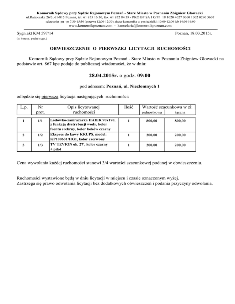 Komornik Sądowy przy Sądzie Rejonowym Poznań - Stare Miasto w Poznaniu Zbigniew Głowacki ul.Ratajczaka 26/3, 61-815 Poznań, tel. 61 855 16 30, fax. 61 852 84 39 - PKO BP SA I O/Pń 18 1020 4027 0000 1002 0290 3607 sekretariat pn - pt 7:30-15:30 (przerwa 12:00-12:30), dyżur komornika w poniedziałki: 10:00-12:00 lub 14:00-16:00 www.komornikpoznan.com - [email protected] Sygn.akt KM 597/14 Poznań, 18.03.2015r. (w koresp. podać sygn.) OBWIESZCZENIE O PIERWSZEJ LICYTACJI RUCHOMOŚCI Komornik Sądowy przy Sądzie Rejonowym Poznań - Stare Miasto w Poznaniu Zbigniew Głowacki na podstawie art. 867 kpc podaje do publicznej wiadomości, że w dniu: 28.04.2015r. o godz. 09:00 pod adresem: Poznań, ul. Niezłomnych 1 odbędzie się pierwsza licytacja następujących ruchomości: L.p. Nr prot. Opis licytowanej ruchomości Ilość 1 1/1 2 1/2 3 1/3 Lodówko-zamrażarka HAIER 90x170, z funkcją dystrybucji wody, kolor frontu srebrny, kolor boków czarny Ekspres do kawy KRUPS, model: KP100631/HG1, kolor czerwony TV TEVION ok. 27', kolor czarny + pilot Wartość szacunkowa w zł. jednostkowa łączna 1 800,00 800,00 1 200,00 200,00 1 200,00 200,00 Cena wywołania każdej ruchomości stanowi 3/4 wartości szacunkowej podanej w obwieszczeniu. Ruchomości wystawione będą w dniu licytacji w miejscu i czasie oznaczonym wyżej. Zastrzega się prawo odwołania licytacji bez dodatkowych obwieszczeń i podania przyczyny odwołania.