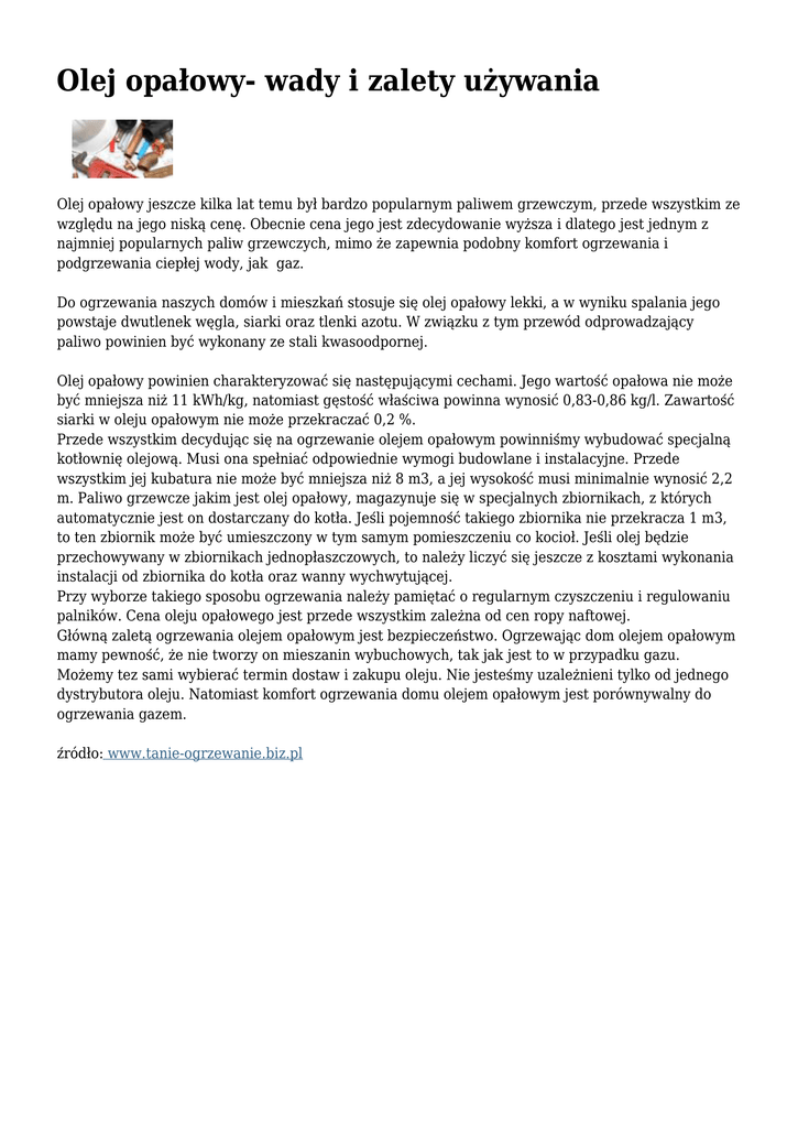 Olej opałowy- wady i zalety używania Olej opałowy jeszcze kilka lat temu był bardzo popularnym paliwem grzewczym, przede wszystkim ze względu na jego niską cenę. Obecnie cena jego jest zdecydowanie wyższa i dlatego jest jednym z najmniej popularnych paliw grzewczych, mimo że zapewnia podobny komfort ogrzewania i podgrzewania ciepłej wody, jak gaz. Do ogrzewania naszych domów i mieszkań stosuje się olej opałowy lekki, a w wyniku spalania jego powstaje dwutlenek węgla, siarki oraz tlenki azotu. W związku z tym przewód odprowadzający paliwo powinien być wykonany ze stali kwasoodpornej. Olej opałowy powinien charakteryzować się następującymi cechami. Jego wartość opałowa nie może być mniejsza niż 11 kWh/kg, natomiast gęstość właściwa powinna wynosić 0,83-0,86 kg/l. Zawartość siarki w oleju opałowym nie może przekraczać 0,2 %. Przede wszystkim decydując się na ogrzewanie olejem opałowym powinniśmy wybudować specjalną kotłownię olejową. Musi ona spełniać odpowiednie wymogi budowlane i instalacyjne. Przede wszystkim jej kubatura nie może być mniejsza niż 8 m3, a jej wysokość musi minimalnie wynosić 2,2 m. Paliwo grzewcze jakim jest olej opałowy, magazynuje się w specjalnych zbiornikach, z których automatycznie jest on dostarczany do kotła. Jeśli pojemność takiego zbiornika nie przekracza 1 m3, to ten zbiornik może być umieszczony w tym samym pomieszczeniu co kocioł. Jeśli olej będzie przechowywany w zbiornikach jednopłaszczowych, to należy liczyć się jeszcze z kosztami wykonania instalacji od zbiornika do kotła oraz wanny wychwytującej. Przy wyborze takiego sposobu ogrzewania należy pamiętać o regularnym czyszczeniu i regulowaniu palników. Cena oleju opałowego jest przede wszystkim zależna od cen ropy naftowej. Główną zaletą ogrzewania olejem opałowym jest bezpieczeństwo. Ogrzewając dom olejem opałowym mamy pewność, że nie tworzy on mieszanin wybuchowych, tak jak jest to w przypadku gazu. Możemy tez sami wybierać termin dostaw i zakupu oleju. Nie jesteśmy uzależnieni tylko od jednego dystrybutora oleju. Natomiast komfort ogrzewania domu olejem opałowym jest porównywalny do ogrzewania gazem. źródło: www.tanie-ogrzewanie.biz.pl