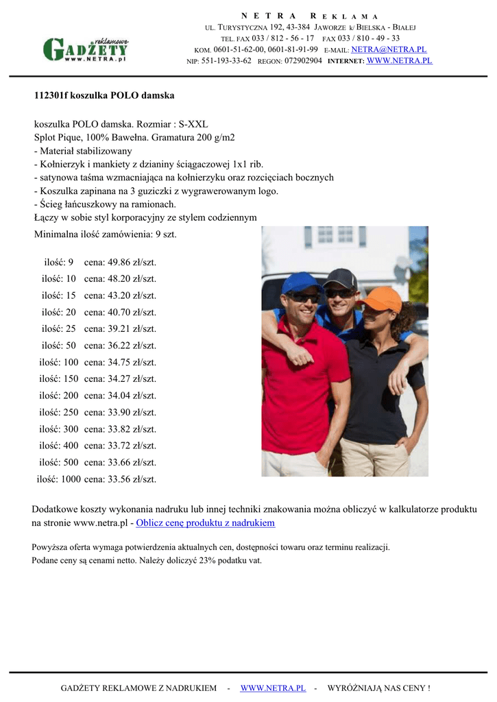 N E T R A R E K L A M A T 192, 43-384 JAWORZE k/ BIELSKA - BIAŁEJ UL. URYSTYCZNA TEL. FAX 033 / 812 - 56 - 17 FAX 033 / 810 - 49 - 33 KOM. 0601-51-62-00, 0601-81-91-99 E-MAIL: [email protected] NIP: 551-193-33-62 REGON: 072902904 INTERNET: WWW.NETRA.PL 112301f koszulka POLO damska koszulka POLO damska. Rozmiar : S-XXL Splot Pique, 100% Bawełna. Gramatura 200 g/m2 - Materiał stabilizowany - Kołnierzyk i mankiety z dzianiny ściągaczowej 1x1 rib. - satynowa taśma wzmacniająca na kołnierzyku oraz rozcięciach bocznych - Koszulka zapinana na 3 guziczki z wygrawerowanym logo. - Ścieg łańcuszkowy na ramionach. Łączy w sobie styl korporacyjny ze stylem codziennym Minimalna ilość zamówienia: 9 szt. ilość: 9 cena: 49.86 zł/szt. ilość: 10 cena: 48.20 zł/szt. ilość: 15 cena: 43.20 zł/szt. ilość: 20 cena: 40.70 zł/szt. ilość: 25 cena: 39.21 zł/szt. ilość: 50 cena: 36.22 zł/szt. ilość: 100 cena: 34.75 zł/szt. ilość: 150 cena: 34.27 zł/szt. ilość: 200 cena: 34.04 zł/szt. ilość: 250 cena: 33.90 zł/szt. ilość: 300 cena: 33.82 zł/szt. ilość: 400 cena: 33.72 zł/szt. ilość: 500 cena: 33.66 zł/szt. ilość: 1000 cena: 33.56 zł/szt. Dodatkowe koszty wykonania nadruku lub innej techniki znakowania można obliczyć w kalkulatorze produktu na stronie www.netra.pl - Oblicz cenę produktu z nadrukiem Powyższa oferta wymaga potwierdzenia aktualnych cen, dostępności towaru oraz terminu realizacji. Podane ceny są cenami netto. Należy doliczyć 23% podatku vat. GADŻETY REKLAMOWE Z NADRUKIEM - WWW.NETRA.PL - WYRÓŻNIAJĄ NAS CENY !