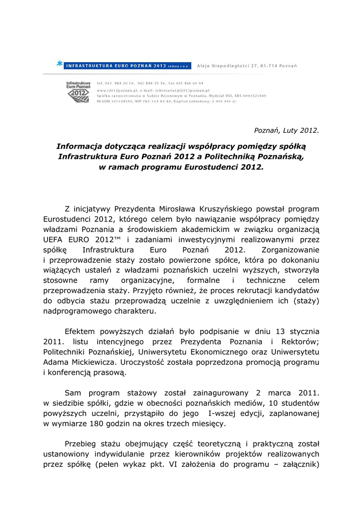 Poznań, Luty 2012. Informacja dotycząca realizacji współpracy pomiędzy spółką Infrastruktura Euro Poznań 2012 a Politechniką Poznańską, w ramach programu Eurostudenci 2012. Z inicjatywy Prezydenta Mirosława Kruszyńskiego powstał program Eurostudenci 2012, którego celem było nawiązanie współpracy pomiędzy władzami Poznania a środowiskiem akademickim w związku organizacją UEFA EURO 2012™ i zadaniami inwestycyjnymi realizowanymi przez spółkę Infrastruktura Euro Poznań 2012. Zorganizowanie i przeprowadzenie staży zostało powierzone spółce, która po dokonaniu wiążących ustaleń z władzami poznańskich uczelni wyższych, stworzyła stosowne ramy organizacyjne, formalne i techniczne celem przeprowadzenia staży. Przyjęto również, że proces rekrutacji kandydatów do odbycia stażu przeprowadzą uczelnie z uwzględnieniem ich (staży) nadprogramowego charakteru. Efektem powyższych działań było podpisanie w dniu 13 stycznia 2011. listu intencyjnego przez Prezydenta Poznania i Rektorów; Politechniki Poznańskiej, Uniwersytetu Ekonomicznego oraz Uniwersytetu Adama Mickiewicza. Uroczystość została poprzedzona promocją programu i konferencją prasową. Sam program stażowy został zainagurowany 2 marca 2011. w siedzibie spółki, gdzie w obecności poznańskich mediów, 10 studentów powyższych uczelni, przystąpiło do jego I-wszej edycji, zaplanowanej w wymiarze 180 godzin na okres trzech miesięcy. Przebieg stażu obejmujący część teoretyczną i praktyczną został ustanowiony indywidulanie przez kierowników projektów realizowanych przez spółkę (pełen wykaz pkt. VI założenia do programu – załącznik) z każdym ze studentów. Podstawowymi kryteriami układania harmonogramu praktyk były: - tempo zaawansowania realizacji konkretnej inwestycji, - kierunek studiów, wydział, specjalność (z uwagi na specyfikę inwestycji), - tryb studiów i związane z nim obostrzenia – program skierowany został do studentów IIgo stopnia (IV i V roku). Generalnym założeniem programu było przypisanie stażystów do konkretnych inwestycji, tak aby potencjalna wiedza i nabyte umiejętności, w zakresie wybranego projektu, w którym uczestniczy stażysta, były pełne. Miejscem odbywania staży były siedziba spółki, place budów (ICHOT’u, trasy tramwajowej os. Lecha – Franowo, odnowy infrastruktury Transportu publicznego w związku z organizacją EURO 2012 przebudowa ronda J.Nowaka-Jeziorańskiego i rozbudowa ul. Grunwaldzkiej, przedłużenie trasy PST do dworca zachodniego) oraz inne wynikające z bieżących potrzeb kierowników projektów i terminów ich realizacji (biura inżyniera kontraktu itp.). W ramach programu wszyscy stażyści zostali objęci niezbędnymi szkoleniami (bhp, ppoż) oraz zapoznali się z regulaminem stażu. Należy zaznaczyć, iż program stażowy był programem płatnym a udział w nim wiązał z wynagrodzeniem w kwocie 300PLN miesięcznie. Ponadto w ramach podsumowania Iwszej i IIgiej edycji każdy ze stażystów otrzymał możliwość zapoznania się ze wszystkimi realizowanymi inwestycjami, bez względu na to do której konkretnej inwestycji był przypisany. W tym celu został zorganizowanym wspólny objazd po placach budów, gdzie kierownicy poszczególnych projektów przedstawili ich bieżący stan. Uczestników każdej z edycji staży zobowiązano do przedłożenia sprawozdań z czynności jakie wykonywali w ramach uczestnictwa w programie. Zakończenie Iwszej edycji staży odbyło się zgodnie z harmonogramem 31 maja, a ich uroczyste podsumowanie z udziałem Prezydenta Ryszarda Grobelnego i jego zastępcy Mirosława Kruszyńskiego miało miejsce w dniu 21 czerwca w urzędzie miasta. Podczas spotkania studenci otrzymali zaświadczenia o odbyciu stażu, opisujące jego przebieg indywidualnie, na podstawie dostarczonych sprawozdań. W spotkaniu uczestniczyli przedstawiciele poznańskich mediów. Dnia 7 listopada 2011 została zainagurowana IIga edycja programu, która odbywała się na dotychczasowych zasadach z uwzględnieniem z tempa zaawansowania realizowanych przedsięwzięć, jej zakończenie nastąpiło 9 lutego br. Spotkanie inauguracyjne i podsumowujące swoją obecnością uświetnili z-ca Prezydenta Mirosław Kruszyński, Przewodniczący Rady Nadzorczej spółki Jędrzej Solarski, władze spółki; Prezes Andrzej Nowakowski i wiceprezes Krystyna Rakowska, przedstawiciele prasy. Każdy z uczestników stażu otrzymał zaświadczenie o jego odbyciu. Do przykładowych czynności i zadań z jakimi mieli do czynienia podczas odbywania stażu studenci PP należy zaliczyć: - udział wspólnie z kierownikiem projektu w kontrolach na placu budowy dotyczących poprawności wykonania i zgodności prowadzonych robót z dokumentacją wykonawczą, - weryfikacja dokumentacji projektowej i zasadami sporządzania projektu wykonawczego, - analiza procedury przetargowej, - udział w rozmowach wstępnych dot. przetargu na system zarządzania zajezdnią MPK Poznań Franowo, - analiza dokumentacji BHP w tym dotyczącej prac rozbiórkowych oraz planu BIOZ, - udział w pracach nad sporządzeniem studium wykonalności projektu, projektu koncepcyjnego oraz raportu oceny oddziaływania na środowisko, - ocena kompletności kosztorysów ofertowych będących podstawą wyboru firmy do wykonania robót głównych, - opiniowanie instrukcji bezpieczeństwa branży torowej, - analiza schematów zasilania sieci i działaniem podstacji energetycznych (infrastruktura szynowa; torowiska i trakcje elektryczne), - komputerowy system sterowania ruchem (elektroniczny system sterowania ruchem kolejowym firmy Thales oraz centralny system sterowania ruchem drogowym ZDM w Poznaniu) - zagadnienia związane z budową pojazdów szynowych w tym obsługą oprogramowania diagnostycznego tramwaju Combino oraz okablowaniem i przepływem sygnałów w pojazdach Combino i Tramino. Początek trzeciej edycji programu Eurostudenci 2012 planowany jest na dzi