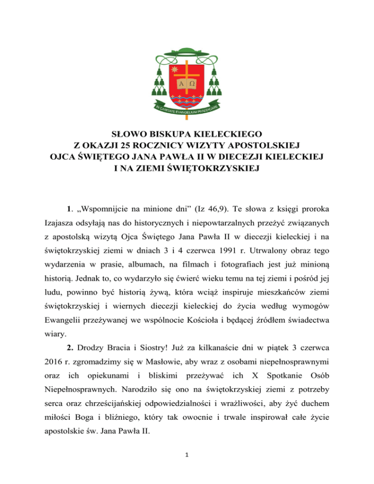 SŁOWO BISKUPA KIELECKIEGO Z OKAZJI 25 ROCZNICY WIZYTY