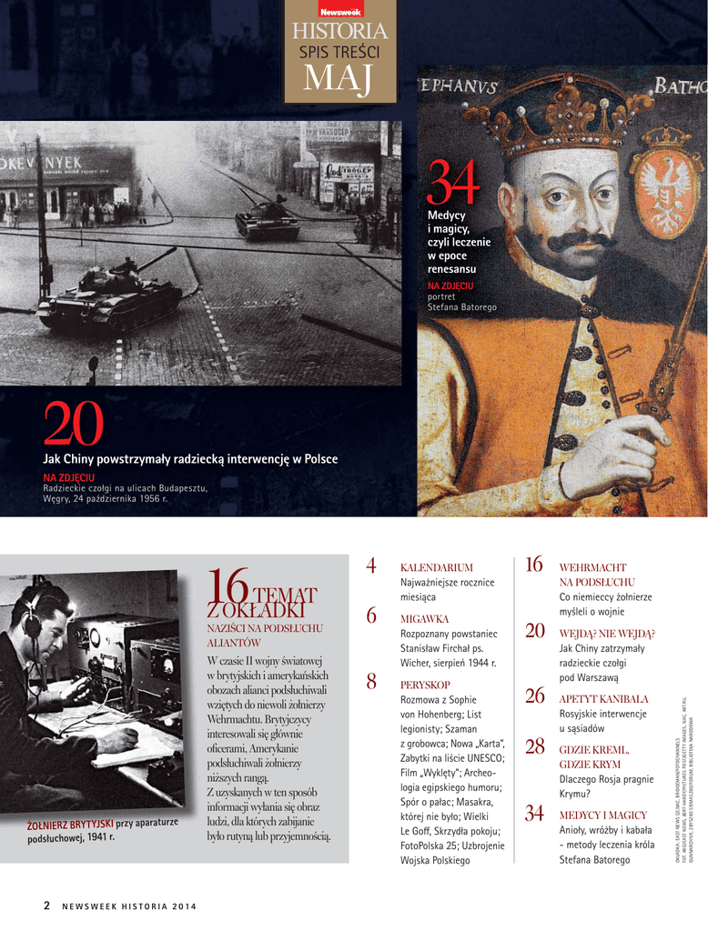 HISTORIA SPIS TREŚCI MAJ 34 Medycy i magicy, czyli leczenie w epoce renesansu NA ZDJĘCIU portret Stefana Batorego 20 Jak Chiny powstrzymały radziecką interwencję w Polsce NA ZDJĘCIU Radzieckie czołgi na ulicach Budapesztu, Węgry, 24 października 1956 r. NAZIŚCI NA PODSŁUCHU ALIANTÓW ŻOŁNIERZ BRYT YJSKI przy aparaturze podsłuchowej, 1941 r. 2 NEWSWEEK HISTORIA 2014 W czasie II wojny światowej w brytyjskich i amerykańskich obozach alianci podsłuchiwali wziętych do niewoli żołnierzy Wehrmachtu. Brytyjczycy interesowali się głównie oficerami, Amerykanie podsłuchiwali żołnierzy niższych rangą. Z uzyskanych w ten sposób informacji wyłania się obraz ludzi, dla których zabijanie było rutyną lub przyjemnością. 6 8 KALENDARIUM Najważniejsze rocznice miesiąca 16 MIGAWKA Rozpoznany powstaniec Stanisław Firchał ps. Wicher, sierpień 1944 r. 20 PERYSKOP Rozmowa z Sophie von Hohenberg; List legionisty; Szaman z grobowca; Nowa „Karta”, Zabytki na liście UNESCO; Film „Wyklęty”; Archeologia egipskiego humoru; Spór o pałac; Masakra, której nie było; Wielki Le Goff, Skrzydła pokoju; FotoPolska 25; Uzbrojenie Wojska Polskiego 26 28 34 WEHRMACHT NA PODSŁUCHU Co niemieccy żołnierze myśleli o wojnie WEJDĄ? NIE WEJDĄ? Jak Chiny zatrzymały radzieckie czołgi pod Warszawą APETYT KANIBALA Rosyjskie interwencje u sąsiadów GDZIE KREML, GDZIE KRYM Dlaczego Rosja pragnie Krymu? MEDYCY I MAGICY Anioły, wróżby i kabała - metody leczenia króla Stefana Batorego OKŁADKA: EAST NEWS (2),NAC, BRIDGEMAN/FOTOCHANNELS FOT. AKG/EAST NEWS, BERT HARDY/PICTURES POST/GETTY IMAGES, NAC, ART.RU, GUNNARCHIVE, ZBYSZKO SIEMASZKO/FORUM, BIBLIOTEKA NARODOWA 16 TEMAT Z OKŁADKI 4 54 Trup w ogrodach Belwederu – kto i dlaczego zastrzelił żandarma pod oknami Józefa Piłsudskiego? NA ZDJĘCIU Belweder, 1928 r. 28 Do kogo należy Krym? NA ZDJĘCIU Ikona z 1550-60 r., Galeria Trietiakowska, Moskwa 40 46 48 54 ŚMIERCIONOŚNE ROZRYWKI W ANGLII TUDORÓW Gra w piłkę nożną mogła skończyć się śmiercią ANALIZA OBRAZU: KSIĘGA POLOWAŃ Gaston Febus, „Jak polować na niedźwiedzie”, Biblioteka Narodowa Francji, Paryż DETEKTYWI Z DZIKIEGO ZACHODU Historia powstania agencji Allana Pinkertona BELWEDERSKI THRILLER Kto zabił żandarma pod oknami Piłsudskiego? 60 66 70 76 SURFERZY W CELI POL POTA Przypadkowe ofiary Czerwonych Khmerów SZLACHTA PRZY OKRĄGŁYM STOLE Artykuły henrykowskie – prawo, które czyniło króla pierwszym obywatelem Rzeczypospolitej 80 84 88 LEGION ZAWODOWIEC Armia władająca antycznym światem 90 REWOLUCJA GOŹDZIKÓW Jak portugalscy mienszewicy pokonali bolszewików 92 HISTORIA SZTUKI: ŚNIADANIE NA TRAWIE Swawolny piknik Maneta HISTORIA OD KUCHNI Nieposkromiony apetyt królowej Wiktorii WYDANIE CYFROWE „Newsweek Historia” dostępny również w wersji na tablety. App Store 1,79 euro Google Play 6,99 zł HISTORIA MOTORYZACJI Kultowa mazda PIEKŁO W KLASZTORZE Rozmowa z Peterem Caddickiem-Adamsem RECENZJE I ZAPOWIEDZI Polecamy programy, filmy i książki historyczne NAPISZ DO AUTORÓW [email protected] NEWSWEEK HISTORIA 2014 3