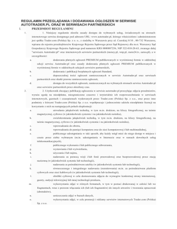 REGULAMIN PRZEGLĄDANIA I DODAWANIA OGŁOSZEŃ W SERWISIE AUTOTRADER.PL ORAZ W SERWISACH PARTNERSKICH I. PRZEDMIOT REGULAMINU 1. Niniejszy regulamin określa zasady dostępu do wybranych usług, świadczonych na stronach: 1. internetowego serwisu dostępnego pod adresem URL: www.autotrader.pl, którego właścicielem i administratorem jest spółka Trader.com (Polska) Sp. z o. o., z siedzibą w Warszawie przy ul. Czerskiej 8/10 , 00-732 Warszawa, wpisana do rejestru przedsiębiorców Krajowego Rejestru Sądowego przez Sąd Rejonowy dla m.st. Warszawy Sąd Gospodarczy Krajowego Rejestru Sądowego pod numerem KRS 0000087256, NIP 522-010-28-63, zwanego dalej "serwisem Autotrader.pl" oraz internetowych serwisów partnerskich (money.pl, wnp.pl, moto24.tv, autoa.pl), a w szczególności: dodawania płatnych ogłoszeń PREMIUM publikowanych w wyróżnionej formie w oddzielnej a. sekcji serwisu Autotrader.pl oraz zasady dodawania płatnych ogłoszeń PREMIUM publikowanych w wyróżnionej formie w oddzielnych sekcjach serwisów partnerskich, dodawania i publikacji bezpłatnych ogłoszeń Standard, b. dopuszczalnej treści ogłoszeń zamieszczanych w serwisie Autotrader.pl oraz serwisach c. partnerskich oraz skutki prawne zamieszczenia ogłoszeń, dostępu do wszystkich ogłoszeń, zamieszczonych na wybranych stronach serwisu Autotrader.pl d. oraz serwisów partnerskich przez określony czas. 2. Użytkownik zlecający publikację ogłoszenia w serwisie autotrader.pl przesyłając zdjęcia przedmiotów, 2. wyraża zgodę na nieodpłatne, nieograniczone czasowo i terytorialnie ich rozpowszechnianie w serwisach internetowych, gazetach i czasopismach wydawanych przez Trader.com (Polska) Sp. z o.o., oraz przez inne podmioty z którymi Trader.com (Polska) Sp. z o.o. współpracuje i jednocześnie udziela nieodpłatnie licencji na korzystanie z nich na następujących polach eksploatacji: utrwalania jakąkolwiek techniką, w tym m.in. drukiem, na kliszy fotograficznej, na taśmie a. magnetycznej, cyfrowo (w jakimkolwiek systemie i na jakimkolwiek nośniku), zwielokrotniania jakąkolwiek techniką, w tym m.in. drukiem, na kliszy fotograficznej, na b. taśmie magnetycznej, cyfrowo (w jakimkolwiek systemie i na jakimkolwiek nośniku), c. wprowadzanie do obrotu, d. wprowadzania do pamięci komputera oraz do sieci komputerowej i/lub multimedialnej, e. publicznego udostępniania w taki sposób, aby każdy mógł mieć do niego dostęp w miejscu i czasie przez siebie wybranym (m.in. udostępniania w Internecie oraz w ramach dowolnych usług telekomunikacyjnych), f. publicznego wykonania i/lub publicznego odtwarzania, g. wystawiania i/lub wyświetlania, h. użyczania i/lub najmu, i. nadawania za pomocą wizji i/lub fonii przewodowej oraz bezprzewodowej przez stację naziemną (w jakimkolwiek systemie lub technologii), j. nadawania za pośrednictwem satelity (w jakimkolwiek systemie lub technologii), k. równoczesnego i integralnego nadawania (reemitowania) m.in. za pośrednictwem platform cyfrowych oraz sieci kablowych (w jakimkolwiek systemie lub technologii), obróbki cyfrowej w celu dostosowania zdjęcia do wymogów konkretnej strony internetowej, l. gazety, audycji telewizyjnej lub innej technologii przekazu, wykorzystania zdjęć w różnych formatach, w tym w postaci drukowanej w całości lub we m. fragmentach, wraz z prawem włączania ich (lub ich fragmentów) do innych utworów i tworzenia opracowań (abstraktów), umieszczania zdjęć w bazach danych, n. wykorzystania zdjęć, w celu promocji i reklamy serwisów internetowych Trader.com (Polska) o. Sp. z o.o. Zezwolenie oraz licencja Użytkownika, o których mowa powyżej nie są ograniczone ani czasowo, ani terytorialnie tzn. odnoszą się zarówno do terytorium Polski, jak i do terytoriów wszystkich innych państw. Przesyłając zdjęcie Użytkownik oświadcza, że: 3. ma pełne prawo do dysponowania nimi oraz że przysługują mu do nich autorskie prawa a. majątkowe i prawa pokrewne, które nie są ograniczone na rzecz osoby trzeciej lub, że przysługują mu prawa do korzystania ze zdjęcia, obejmujące w szczególności prawo do udostępniania zdjęcia z prawem do ich rozpowszechniania zgodnego z postanowieniami niniejszego Regulaminu, informacja zawarta w zdjęciu jest prawdziwa i nie wprowadza nikogo w błąd. b. Użytkownik przesyłając Trader.com (Polska) Sp. z o.o. zdjęcie ponosi pełną odpowiedzialność za 4. zawarte w nich treści oraz za ewentualne naruszenie praw osób trzecich. Trader.com (Polska) Sp. z o.o. przysługuje prawo przeniesienia na osoby trzecie praw i obowiązków 5. wynikających z niniejszego Regulaminu, a w szczególności udzielania licencji, sublicencji oraz wyrażania stosownych zezwoleń lub zgód. Przesyłając zdjęcie Użytkownik wyraża zgodę na jego archiwizowanie przez Trader.com (Polska) Sp. z 6. o.o. przez czas nieoznaczony. Użytkownik może wyrazić zgodę na korzystanie z usługi „powiadamiacz”, polegającej na 7. powiadamianiu Użytkownika na podane adresy e-mail o nowych ogłoszeniach w serwisie autotrader.pl („powiadamiacz”). Użytkownik może w każdym czasie cofnąć zgodę z poziomu powiadamiacza e-mail. ZASADY UAKTYWNIANIA OGŁOSZEŃ DODANYCH II. Ogłoszenia PREMIUM dodane za pośrednictwem Internetu w serwisie Autotrader.pl lub serwisach 1. partnerskich stają się widoczne dla użytkowników Internetu po dokonaniu przez Użytkownika płatności za zamieszczenie ogłoszenia w sposób, o którym mowa w ust. II. pkt. 3 niniejszego regulaminu i po wpłynięciu płatności na konto Trader.com (Polska) Sp. z o. o. Dodanie ogłoszenia PREMIUM podlega opłacie w wysokości 33,00 złote brutto lub 11,07 złotych brutto. 2. Płatność za zamieszczenie ogłoszenia PREMIUM aktywnego 30 dni oraz 7 dni od dnia zamieszczenia 3. ogłoszenia może być zrealizowana przez Użytkownika przy pomocy jednego z poniższych sposobów: a. w formie zapłaty realizowanej przy użyciu karty kredytowej, b. w f