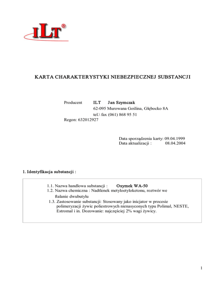 KARTA CHARAKTERYSTYKI NIEBEZPIECZNEJ SUBSTANCJ I Producent ILT J an Szymczak 62095 Murowana Goślina, Głębocko 8A tel.\ fax (061) 868 95 51 Regon: 632012927 Data sporządzenia karty: 09.04.1999 Data aktualizacji : 08.04.2004 1. Identyfikacja substancji : 1.1. Nazwa handlowa substancji : Oxymek WA50 1.2. Nazwa chemiczna : Nadtlenek metyloetyloketonu, roztwór we ftalanie dwubutylu 1.3. Zastosowanie substancji: Stosowany jako inicjator w procesie polimeryzacji żywic poliestrowych nienasyconych typu Polimal, NESTE, Estromal i in. Dozowanie: najczęściej 2% wagi żywicy. 1 2. Skład i infor macja o składnikach: 2.1. Nadtlenki metyloetyloketonu: stężenie 40%; EC No 215 66 12; CAS [1338234]; Zagrożenia: R7 Może spowodować pożar R22 Działa szkodliwie po spożyciu R34 Wywołuje oparzenia Skład: Metyloetyloketon: CAS: 78933; Nr WE: 2011590; Nr EWG: 606002003 Zagrożenia: R11 Substancja wysoce łatwopalna R36 Działa drażniąco na oczy R66 Powtarzające się narażenie może powodować wysuszenie lub pękanie skóry R67 Opary mogą wywoływać uczucie senności i zawroty głowy Ftalan dwubutylu: CAS: 84742; Nr WE: 2015574; Nr EWG: 607318004 Zagrożenia: R61 Może działać szkodliwie na dziecko w łonie matki (kat.2) R62 Możliwe ryzyko upośledzenia płodności (kat.3) R50: Działa bardzo toksycznie na organizmy wodne. Alkohol dwuacetonowy: CAS: 123422; Nr. WE: 2046267; Nr. EWG: 603016001 Zagrożenia: R36 Działa drażniąco na oczy 3. Identyfikacja zagrożeń 3.1. Ogrzanie grozi wybuchem 3.2. Działa szkodliwie w przypadku narażenia drogą oddechową, kontaktu ze skórą, i po spożyciu. 3.3. Wywołuje oparzenia 3.4. Ryzyko poważnego uszkodzenia oczu. 3.5. W zamkniętych pojemnikach występuje nadciśnienie. 3.6. Jest silnym utleniaczem, powoduje korozję. 2 4. Pierwsza pomoc: 4.1. Kontakt ze skórą zmyć dużą ilością wody z mydłem, przy większych powierzchniach wziąć natrysk, następnie miejsca podrażnione kremować kremem na bazie lanoliny. 4.2. Zatarcie oczu płukać dużym strumieniem wody przez co najmniej 15 min; zasięgnąć porady lekarza. 4.3. Połknięcie wypłukać jamę ustną wodą; podawać wodę do picia; Zasięgnąć porady lekarza. Nie wymuszać wymiotów. 4.4 Wdychanie przenieść na świeże powietrze, umożliwić odpoczynek w pozycji półleżącej. Jeśli występują trudności w oddychaniu, zastosować tlen lub sztuczne oddychanie. 5. Postępowanie w razie pożaru: 5.1. Środki gaśnicze: do gaszenia stosować wodę lub gaśnice na dwutlenek węgla, piana. 5.2. Szczególne zagrożenia: inne zbiorniki z nadtlenkiem oddalić od ognia lub schładzać, gdyż podgrzane mogą wybuchnąć. 5.3. Środki ochrony indywidualnej: stosować ochronę oczu, aparat do oddychania, kombinezon ochronny. 6. Postępowanie w przypadku niezamier zonego uwolnienia do śr odowiska: 6.1 Wylany nadtlenek ograniczyć piaskiem lub ziemią, zasypać wermikulitem, wapnem, sodą lub piaskiem, zebrać do naczynia, skażone miejsce polać dużą ilością wody w celu zapobieżenia ponownemu zapłonowi. Zebrany odpad przekazać do utylizacji. 3 7. Postępowanie z substancją i jej magazynowanie: 7.1. Nie rozważać w pomieszczeniu magazynowym. 7.2. Nie jeść, nie pić, nie palić podczas stosowania. 7.3. Stosować w dobrze wentylowanych, zacienionych pomieszczeniach. 7.4. Magazynować preparat i puste opakowania z dala od źródeł ognia, z dala od żywności, nie przechowywać ze środkami redukującymi, kwasami, zasadami i związkami metali ciężkich. 7.5. Przechowywać w temperaturze do 25 o C. 7.6. Ubranie robocze trzymać oddzielnie, nie zabierać do domu. 8. Kontrola narażenia i środki ochrony indywidualnej: 8.1. Unikać bezpośredniego kontaktu ze skórą. 8.2. Stosować okulary, rękawice z neoprenu lub gumy syntetycznej i obuwie ochronne 8.3. Zabrudzoną odzież ochronną wyprać przed ponownym użyciem. 8.4. W przypadku niedostatecznej wentylacji nosić odpowiednie aparaty oddechowe ( respirator z filtrem AX ) 4 9. Właściwości fizykochemiczne: 9.1. Ciecz o słomkowej barwie i charakterystycznym słabym zapachu 9.2. Temperatura wrzenia brak danych 9.3. Temperatura topnienia 35°C 9.4. Prężność par: 80 hPa 9.5. Nie rozpuszcza się w wodzie; rozpuszcza się we ftalanie butylu, metylu, w metyloetyloketonie 9.6. Gęstość: 1,05 g/cm³ 9.7. Temperatura zapłonu: powyżej TSR; TSR: 60°C SADT 60 °C 9.8. Wybuchowo reaguje po połączeniu z przyspieszaczem kobaltawym! 9.9. Temperatura samozapłonu: powyżej 200°C 9.10. Kwasowość odczyn lekko kwaśny 9.11. Zawartość tlenu aktywnego 9,6%9,8% 9.12. Rozpuszcza się we ftalanach. 10. Stabilność i r eaktywność: 10.1. Stabilność. SADT (temperatura samoprzyspieszającego rozkładu) jest to najniższa temperatura, w której może wystąpić samoprzyspieszający rozkład substancji w opakowaniu użytym w transporcie. Niebezpieczna, samoprzyspieszająca reakcja rozkładu, w określonych okolicznościach, eksplozja lub pożar mogą być spowodowane przez rozkład cieplny w następującej albo wyższej temperaturze: 60°C. Kontakt z substancjami niekompatybilnymi może powodować rozkład w temperaturze równej lub niższej od SADT. 10.2. Reaktywność: gwałtownie reaguje ze środkami redukującymi np. aminy, kwasy, alkalia, związki metali ciężkich (przyspieszacze, sykatywy, mydła metaliczne). Unikać kontaktu z rdzą, żelazem i miedzią. Kontakt z niemieszalnymi materiałami, takimi jak kwasy, zasady, metale ciężkie i środki redukujące spowoduje w efekcie niebezpieczny rozkład. Nie mieszać z przyspieszaczami nadtlenkowymi. Używać tylko Stal nierdzewną 316, PCW, polietylen lub urządzenia pokryte szkłem. 10.3. Właściwości korozyjne: silny utleniacz. 10.4. Produkty rozkładu: kwas octowy, kwas mrówkowy (metanowy), kwas propionowy (propanowy), metyloetyloketon 10.5. Unikać następujących warunków: Unikać temperatur powyżej 25°C. Unikać wstrząsów i tarć. Należy unikać zamknięcia. 10.6. Inne 