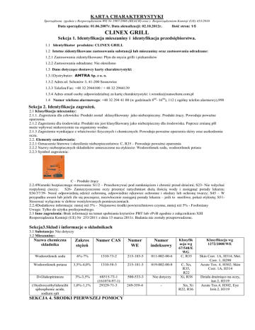 KARTA CHARAKTERYSTYKI Sporządzona zgodnie z Rozporządzeniem WE Nr 1907/2006 (REACH) oraz z Rozporządzeniem Komisji (UE) 453/2010 Data sporządzenia: 01.06.2007r. Data aktualizacji: 02.10.2012r. Ilość stron: 1/5 CLINEX GRILL Sekcja 1. Identyfikacja mieszaniny i identyfikacja przedsiębiorstwa. 1.1 Identyfikator produktu: CLINEX GRILL 1.2 Istotne zidentyfikowane zastosowania substancji lub mieszaniny oraz zastosowania odradzane: 1.2.1 Zastosowania zidentyfikowane: Płyn do mycia grilli i piekarników 1.2.2 Zastosowania odradzane: Nie określono 1.3 Dane dotyczące dostawcy karty charakterystyki: 1.3.1Dystrybutor: AMTRA Sp. z o. o. 1.3.2 Adres:ul. Schonów 3, 41-200 Sosnowiec 1.3.3 Telefon/Fax: +48 32 2944100 / + 48 32 2944139 1.3.4 Adres email osoby odpowiedzialnej za kartę charakterystyki: [email protected] 1.4 Numer telefonu alarmowego: +48 32 294 41 00 (w godzinach 800- 1600), 112 ( ogólny telefon alarmowy),998 Sekcja 2. Identyfikacja zagrożeń. 2.1 Klasyfikacja mieszaniny: 2.1.1. Zagrożenia dla człowieka: Produkt został sklasyfikowany jako niebezpieczny. Produkt żrący. Powoduje poważne oparzenia. 2.1.2 Zagrożenie dla środowiska: Produkt nie jest klasyfikowany jako niebezpieczny dla środowiska. Poprzez zmianę pH może wpływać niekorzystnie na organizmy wodne. 2.1.3 Zagrożenia wynikające z właściwości fizycznych i chemicznych: Powoduje poważne oparzenia skóry oraz uszkodzenia oczu. 2.2. Elementy oznakowania: 2.2.1 Oznaczenie literowe i określenie niebezpieczeństwa: C, R35 – Powoduje poważne oparzenia 2.2.2 Nazwy niebezpiecznych składników umieszczone na etykiecie: Wodorotlenek sodu, wodorotlenek potasu 2.2.3 Symbol zagrożenia: C – Produkt żrący 2.2.4Warunki bezpiecznego stosowania: S1/2 – Przechowywać pod zamknięciem i chronić przed dziećmi; S23- Nie wdychać rozpylonej cieczy; S26- Zanieczyszczone oczy przemyć natychmiast dużą ilością wody i zasięgnąć porady lekarza; S36/37/39- Nosić odpowiednią odzież ochronną, odpowiednie rękawice ochronne i okulary lub ochronę twarzy; S45 – W przypadku awarii lub jeżeli źle się poczujesz, niezwłocznie zasięgnij porady lekarza – jeśli to możliwe, pokaż etykietę; S51Stosować wyłącznie w dobrze wentylowanych pomieszczeniach. 2.2.4Dodatkowe informacje: mniej niż 5% - Niejonowe środki powierzchniowo czynne, mniej niż 5% - Fosfoniany Uwaga: Tylko do użytku profesjonalnego. 2.3 Inne zagrożenia: Brak informacji na temat spełniania kryteriów PBT lub vPvB zgodnie z załącznikiem XIII Rozporządzenia Komisji (UE) Nr 253/2011 z dnia 15 marca 2011r. Badania nie zostały przeprowadzone. Sekcja3.Skład i informacje o składnikach 3.1 Substancje: Nie dotyczy 3.2 Mieszaniny: Nazwa chemiczna składnika Zakres stężeń Numer CAS Numer WE Numer indeksowy Wodorotlenek sodu 6%-7% 1310-73-2 215-185-5 011-002-00-6 Wodorotlenek potasu 3,5%-4,0% 1310-58-3 215-181-3 019-002-00-8 D-Glukopiranoza 3%-3,5% 500-533-3 Nie dotyczy (1hydroxyethylidene)bi sphosphonic acide, sodium salt 1,0%-1,1% 68515-73-1 (161074-97-1) 29329-71-3 249-559-4 - SEKCJA 4. ŚRODKI PIERWSZEJ POMOCY Klasyfik acja wg 67/548/E WG C, R35 C, Xn, R35, R22 Xi, R38 Xn, Xi R22, R36 Klasyfikacja wg 1272/2008/WE Skin Corr. 1A, H314; Met. Corr. 1, H290 Acute Tox. 4, H302; Skin Corr. 1A, H314 Działa drażniąco na oczy, kat.2, H319 Acute Tox.4, H302, Eye Irrit.2, H319 KARTA CHARAKTERYSTYKI Sporządzona zgodnie z Rozporządzeniem WE Nr 1907/2006 (REACH) oraz z Rozporządzeniem Komisji (UE) 453/2010 Data sporządzenia: 01.06.2007r. Data aktualizacji: 02.10.2012r. Ilość stron: 2/5 CLINEX GRILL 4.1 Opis środków pierwszej pomocy: 4.1.1 Połknięcie: W razie połknięcia przepłukać jamę ustną, wyjąć protezy dentystyczne jeśli są. Przetransportować do najbliższej placówki medycznej celem podjęcia leczenia. Pokazać opakowanie lub etykietę. Jeśli wystąpią spontanicznie wymioty, trzymać głowę poniżej bioder. Nie podawać niczego doustnie osobie nieprzytomnej. 4.1.2. Zatrucie inhalacyjne: Wynieść poszkodowanego z miejsca narażenia i zapewnić dostęp świeżego powietrza oraz spokój i odpoczynek. W przypadku dolegliwości (kaszel, wymioty, zawroty głowy, świszczący oddech) zapewnić pomoc lekarską. Nieprzytomnego ułożyć w pozycji bocznej. 4.1.3. Skażenie skóry: Zdjąć skażoną odzież. Skórę zmyć dużą ilością wody. Jeśli wystąpią rany założyć opatrunek jałowy. Skontaktować się z lekarzem. 4.1.4.Skażenie oczu: Jeżeli poszkodowany nosi szkła kontaktowe niezwłocznie je wyjąć. Dokładnie przemyć oczy dużą ilością wody, wywijając powieki. Unikać silnego strumienia , ze względu na niebezpieczeństwo uszkodzenia rogówki. Zapewnić natychmiastową pomoc okulisty. Uwaga: osoby narażone na skażenie oczu powinny być pouczone o konieczności i sposobie natychmiastowego płukania oczu 4.2 Najważniejsze ostre i opóźnione objawy oraz skutki narażenia: 4.2.1 Skażenie oczu: Może wystąpić uszkodzenie oczu, zaczerwienienie oraz łzawienie. 4.2.2 Połknięcie: Mogą pojawić się mdłości, wymioty oraz ból brzucha. Podrażnienie krtani orz gardła. 4.2.3 Kontakt ze skórą: Może powodować oparzenia skóry. 4.3 Wskazania dotyczące wszelkiej natychmiastowej pomocy lekarskiej i szczególnego postępowania z poszkodowanym: Jeżeli poszkodowany jest nieprzytomny, upewnić się czy drogi oddechowe są drożne i ułożyć go w pozycji bocznej ustalonej. Zapewnić pomoc lekarską. Decyzję o sposobie postępowania podejmuje lekarz po ocenie stanu poszkodowanego. SEKCJA 5. POSTĘPOWANIE W PRZYPADKU POŻARU 5.1 Środki gaśnicze: 5.1.1 Odpowiednie środki gaśnicze: Stosować powszechne środki gaśnicze; w zależności od otoczenia. 5.1.2 Niewłaściwe środki gaśnicze: Nie są znane. 5.2 Szczególne zagrożenia związane z mieszaniną: Ze względu na zawartość w mieszaninie wodorotlenku sodu , zagrożenie może stwarzać wodór wydzielający się w kontakcie z metalami lekkimi. 5.3 Info