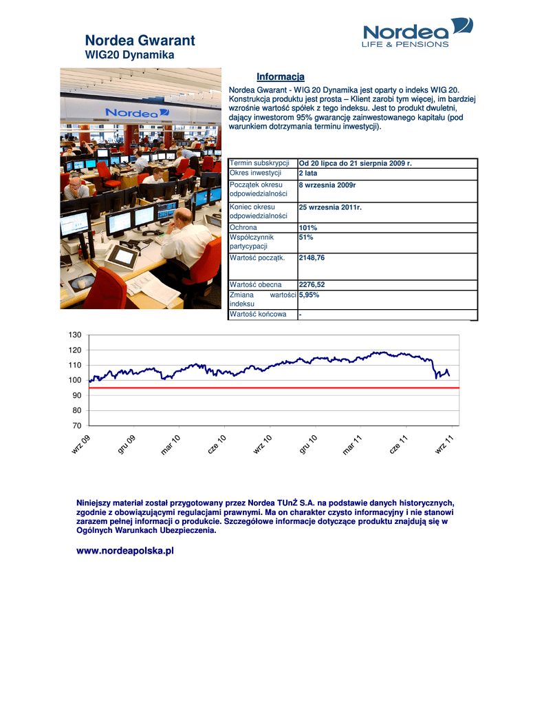 Nordea Gwarant WIG20 Dynamika Informacja Nordea Gwarant - WIG 20 Dynamika jest oparty o indeks WIG 20. Konstrukcja produktu jest prosta – Klient zarobi tym więcej, im bardziej wzrośnie wartość spółek z tego indeksu. Jest to produkt dwuletni, dający inwestorom 95% gwarancję zainwestowanego kapitału (pod warunkiem dotrzymania terminu inwestycji). Termin subskrypcji Okres inwestycji Od 20 lipca do 21 sierpnia 2009 r. 2 lata Początek okresu odpowiedzialności 8 wrzesnia 2009r Koniec okresu odpowiedzialności 25 wrzesnia 2011r. Ochrona Współczynnik partycypacji 101% 51% Wartość początk. 2148,76 Wartość obecna 2276,52 Zmiana wartości 5,95% indeksu Wartość końcowa - 130 120 110 100 90 80 70 Niniejszy materiał został przygotowany przez Nordea TUnŻ S.A. na podstawie danych historycznych, zgodnie z obowiązującymi regulacjami prawnymi. Ma on charakter czysto informacyjny i nie stanowi zarazem pełnej informacji o produkcie. Szczegółowe informacje dotyczące produktu znajdują się w Ogólnych Warunkach Ubezpieczenia. www.nordeapolska.pl