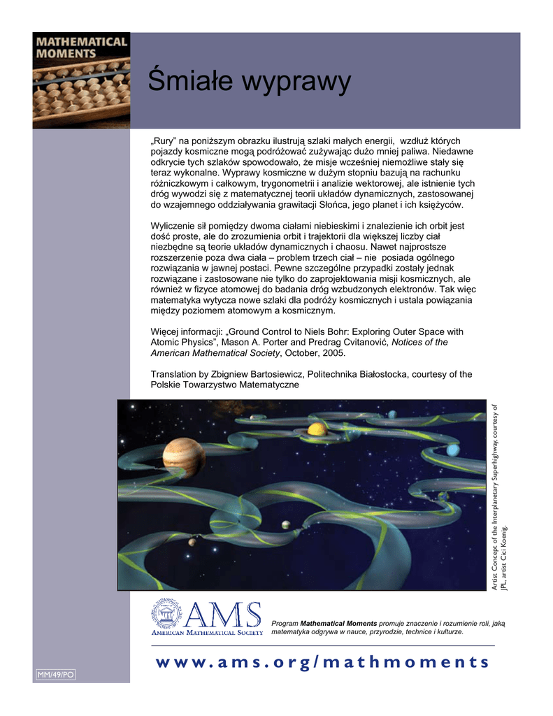 ĝmiaáe wyprawy ĝmiaáe wyprawy „Rury” naponiĪszym poniĪszym obrazku ilustrują szlaki maáych wzdáuĪ których „Rury” na obrazku ilustrują szlaki maáych energii, wzdáuĪ energii, których pojazdy kosmiczne podróĪowaü zuĪywając duĪo mniej paliwa. Niedaw pojazdy kosmiczne mogąmogą podróĪowaü zuĪywając duĪo mniej paliwa. Niedawne odkrycie tych szlaków spowodowaáo, Īe misje wczeĞniej niemoĪliwe staáy odkrycie tych szlaków spowodowaáo, Īe misje wczeĞniej siĊ niemoĪliwe staáy siĊ teraz wykonalne. Wyprawy kosmiczne w duĪym stopniu bazują na rachunku teraz wykonalne. Wyprawy kosmiczne w duĪym ale stopniu bazują róĪniczkowym i caákowym, trygonometrii i analizie wektorowej, istnienie tych na rachunku róĪniczkowym caákowym, trygonometrii i analizie wektorowej, dróg wywodzi siĊ zi matematycznej teorii ukáadów dynamicznych, zastosowanej ale istnienie t do wzajemnego oddziaáywania grawitacji SáoĔca, jego planet i ich ksiĊĪyców. dróg wywodzi siĊ z matematycznej teorii ukáadów dynamicznych, zastosowa do wzajemnego oddziaáywania grawitacji SáoĔca, jego planet i ich ksiĊĪyców Wyliczenie siá pomiĊdzy dwoma ciaáami niebieskimi i znalezienie ich orbit jest doĞü proste, ale do zrozumienia orbit i trajektorii dla wiĊkszej liczby ciaá niezbĊdne są teorie ukáadów dynamicznych i chaosu. Nawet najprostsze Wyliczenie siá pomiĊdzy dwoma ciaáami niebieskimi i znalezienie ich orbit jes rozszerzenie poza dwa ciaáa – problem trzech ciaá – nie posiada ogólnego doĞü proste, ale do zrozumienia orbit i trajektorii dla wiĊkszej liczby ciaá rozwiązania w jawnej postaci. Pewne szczególne przypadki zostaáy jednak niezbĊdne są teorie ukáadów i chaosu. Nawet rozwiązane i zastosowane nie tylko dodynamicznych zaprojektowania misji kosmicznych, ale najprostsze równieĪ w fizyce atomowej do badania dróg wzbudzonych elektronów. Tak wiĊc rozszerzenie poza dwa ciaáa – problem trzech ciaá – nie posiada ogólnego matematyka wytycza nowe szlaki dla podróĪy kosmicznych i ustala powiązania rozwiązania w jawnej postaci. Pewne szczególne przypadki zostaáy jednak miĊdzy poziomem atomowym a kosmicznym. rozwiązane i zastosowane nie tylko do zaprojektowania misji kosmicznych, a WiĊcej informacji: „Ground Control do to Niels Bohr: Exploring Outer Space withelektronów. Tak w równieĪ w fizyce atomowej badania dróg wzbudzonych Atomic Physics”, Mason A. Porter and Predrag Cvitanoviü, Notices of the matematyka wytycza nowe szlaki dla podróĪy kosmicznych i ustala powiąza American Mathematical Society, October, 2005. Skáadanie papieru – przyjemne i miĊdzy poziomem atomowym a kosmicznym. poĪyteczne Translation by Zbigniew Bartosiewicz, Politechnika Biaáostocka, courtesy of the Polskie Towarzystwo WiĊcej informacji:Matematyczne „Ground Control to Niels Bohr: Exploring Outer Artist Concept of the Interplanetary Superhighway, courtesy of JPL, artist Cici Koenig. Space with Atomic Physics”, MasonOrigami A. Porter and Predrag Cvitanoviü, Notices of the [PICTURE] – sztuka skáadania papieru – moĪe nie wydawaü siĊ tematem odpowiednim do badaĔ naukowych lub Ĩródáem zaawansowanych zastosowaĔ, American MathematicalaleSociety, October, 2005. kaĪdy, kto próbowaá záoĪyü mapĊ lub zapakowaü prezent, wie, Īe origami nie jest sprawą prostą. Matematycy, informatycy i inĪynierowie odkryli ostatnio, Īe ta Program Mathematical Moments znaczenie i rozumienie roli, jakąwielu sztuka promuje o wielowiekowej tradycji moĪe uáatwiü rozwiązywanie Translation by Zbigniew Bartosiewicz, Politechnika Biaáostocka, courtesy wspóáczesnych problemów. Metody origami są teraz uĪywane do efektywnego matematyka odgrywa w nauce, przyrodzie, technice i kulturze. Polskie Towarzystwo Matematyczne skáadania róĪnych obiektów, takich jak poduszki powietrzne w samochodach i olbrzymie teleskopy kosmiczne, oraz mogą byü związane z tym, jak zwijająją siĊ czĊsteczki biaáka. [PICTURE] Producenci czĊsto chcą wykonaü produkt z jednego kawaáka materiaáu. Problem wytwarzania wiąĪe siĊ wtedy z problemem rozstrzygania czy dany ksztaát daje siĊ skáadaü. A jeĞli tak, to czy moĪna efektywnie znaleĨü dobrą metodĊ skáadania? Zatem wiele problemów obecnych w origami wiąĪe siĊ ze záoĪonoĞcią algorytmów i teorią optymalizacji. ĝwiadectwem bogactwa origami, jak równieĪ potĊgi matematyki, jest moĪliwoĞü jego stosowania do problemów na poziomie molekularnym, problemów pojawiających siĊ w produkcji i w badaniu przestrzeni kosmicznej. of Program Mathematical Moments promuje znaczenie i rozumienie roli, jaką matematyka odgrywa w nauce, przyrodzie, technice i kulturze. WiĊcej informacji: http://db.uwaterloo.ca/~eddemain/papers/MapFolding/ Translation by Zbigniew Bartosiewicz, Politechnika Biaáostocka, courtesy of the Polskie Towarzystwo Matematyczne. [PICTURE] Program Mathematical Moments promuje znaczenie i rozumienie roli, jaką matematyka odgrywa w nauce, przyrodzie, technice i kulturze. MM/22/PO MM/49/PO w w w. a m s . o r g / m a t h m o m e n t s