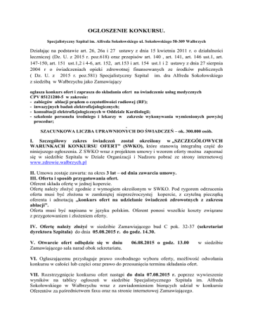 OGŁOSZENIE KONKURSU. Specjalistyczny Szpital im. Alfreda Sokołowskiego ul. Sokołowskiego 58-309 Wałbrzych Działając na podstawie art. 26, 26a i 27 ustawy z dnia 15 kwietnia 2011 r. o działalności leczniczej (Dz. U. z 2015 r. poz.618) oraz przepisów art. 140 , art. 141, art. 146 ust.1, art. 147-150, art. 151 ust.1,2 i 4-6, art. 152, art.153 i art. 154 ust.1 i 2 ustawy z dnia 27 sierpnia 2004 r o świadczeniach opieki zdrowotnej finansowanych ze środków publicznych ( Dz. U. z 2015 r. poz.581) Specjalistyczny Szpital im. dra Alfreda Sokołowskiego z siedzibą w Wałbrzychu jako Zamawiający ogłasza konkurs ofert i zaprasza do składania ofert na świadczenie usług medycznych CPV 85121200-5 w zakresie: - zabiegów ablacji prądem o częstotliwości radiowej (RF); - inwazyjnych badań elektrofizjologicznych; - konsultacji elektrofizjologicznych w Oddziale Kardiologii; - szkolenie personelu średniego i lekarzy w zakresie wykonywania wymienionych powyżej procedur; . SZACUNKOWA LICZBA UPRAWNIONYCH DO ŚWIADCZEŃ – ok. 300.000 osób. I. Szczegółowy zakres świadczeń został określony w „SZCZEGÓŁOWYCH WARUNKACH KONKURSU OFERT” (SWKO), które stanowią integralną część do niniejszego ogłoszenia. Z SWKO wraz z projektem umowy i wzorem oferty można zapoznać się w siedzibie Szpitala w Dziale Organizacji i Nadzoru pobrać ze strony internetowej www.zdrowie.walbrzych.pl II. Umowa zostaje zawarta: na okres 3 lat – od dnia zawarcia umowy. III. Oferta i sposób przygotowania ofert. Oferent składa ofertę w jednej kopercie. Ofertę należy złożyć zgodnie z wymogiem określonym w SWKO. Pod rygorem odrzucenia oferta musi być złożona w zamkniętej nieprzeźroczystej kopercie, z czytelną pieczątką oferenta i adnotacją ,,konkurs ofert na udzielanie świadczeń zdrowotnych z zakresu ablacji”. Oferta musi być napisana w języku polskim. Oferent ponosi wszelkie koszty związane z przygotowaniem i złożeniem oferty. IV. Ofertę należy złożyć w siedzibie Zamawiającego bud C pok. 32-37 (sekretariat dyrektora Szpitala) do dnia 05.08.2015 r. do godz. 14.30. V. Otwarcie ofert odbędzie się w dniu Zamawiającego sala narad obok sekretariatu. 06.08.2015 o godz. 13.00 w siedzibie VI. Ogłaszającemu przysługuje prawo swobodnego wyboru oferty, możliwość odwołania konkursu w całości lub części oraz prawo do przesunięcia terminu składania ofert. VII. Rozstrzygnięcie konkursu ofert nastąpi do dnia 07.08.2015 r. poprzez wywieszenie wyników na tablicy ogłoszeń w siedzibie Specjalistycznego Szpitala im. Alfreda Sokołowskiego w Wałbrzychu wraz z zawiadomieniem biorących udział w konkursie Oferentów za pośrednictwem faxu oraz na stronie internetowej Zamawiającego. VIII. Termin związania ofertą wynosi 30 dni od dnia upływu terminu składania ofert. IX. Oferent ma prawo do składania protestu i skargi dotyczącej konkursu ofert. X. Ogłaszający ma prawo do odwołania konkursu i do przesunięcia terminu składania ofert. XI. Ze szczegółowymi warunkami konkursu, materiałami informacyjnymi, projektem umowy zapoznać się można w Dziale Organizacji i Nadzoru – Grażyna Mizera tel. 074/6489888 oraz na stronie internetowej szpitala – www.zdrowie.walbrzych.pl. Dyrektor Szpitala. Mariola Dudziak.