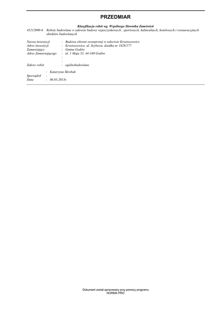 PRZEDMIAR 45212000-6 Klasyfikacja robót wg. Wspólnego Słownika Zamówień Roboty budowlane w zakresie budowy wypoczynkowych , sportowych, kulturalnych, hotelowych i restauracyjnych obiektów budowlanych Nazwa inwestycji Adres inwestycji Zamawiający Adres Zamawiającego Zakres robót Sporządził Data : : : : : : : Budowa siłowni zewnętrznej w sołectwie Krostoszowice Krostoszowice, ul. Szybowa, działka nr 1828/177 Gmina Godów ul. 1 Maja 53, 44-340 Godów ogólnobudowlane : Katarzyna Skrobak : : 06.03.2013r. Dokument został opracowany przy pomocy programu NORMA PRO siłownia zewnętrzna PRZEDMIAR Lp. Podstawa Opis i wyliczenia Siłownia zewnętrzna 1 45220000-5 NAWIERZCHNIA POLIURETANOWA POD SIŁOWNIĘ ZEWNĘTRZNĄ 1 KNNR 6 Koryta wykonywane mechanicznie gł. 30 cm w gruncie kat. II-VI na całej szerod.1 0101-03 kości jezdni i chodników analogia 62.4 2 KNR 2-31 d.1 0101-04 3 KNNR 1 d.1 0205-04 4 KNNR 1 d.1 0208-02 5 KNNR 6 d.1 0103-03 6 KNNR 6 d.1 0106-04 7 KNNR 2 d.1 0604-01 analogia 8 KNNR 6 d.1 0104-04 9 KNR 2-02 d.1 1101-01 j.m. m2 m3 Profilowanie i zagęszczanie podłoża wykonywane mechanicznie w gruncie kat. II-IV pod warstwy konstrukcyjne nawierzchni do Is=0,97 62.4 m2 Warstwy podsypki piaskowej zagęszczane mechanicznie o grubości 5 cm m2 62.4 m2 geowłóknina m2 62.4 m2 Warstwy odsączające wykonane i zagęszczane mechanicznie o gr.20 cm (15 cm) Krotność = 0.75 62.4 m2 m2 m2 Analogia- płyta betonowa zbrojona zbrojeniem rozproszonym z betonu B-20 W2 m3 jamistego 62.4*0.15 m3 10 kalkulacja in- Nawierzchnia syntetyczna poliuretanowa gr.13 mm Nawierzchnia składa sie z m2 d.1 dywidualna dwóch warstw: elastycznej (nośnej) i użytkowej. Warstwa nośna to mieszanina granulatu gumowego i lepiszcza poliuretanowego.Układana jest mechanicznie, bezspoinowo, przy pomocy rozkładarki mas poliuretanowych (np. Planomatic). Tak wykonana warstwe należy pokryć warstwą użytkowa, która stanowi system poliuretanowy zmieszany z granulatem EPDM. Czynność tą wykonuje sie poprzez natrysk mechaniczny (przy użyciu specjalnej natryskarki np. Strukturmatic). Grubość warstwy użytkowej 2-3mm.Po całkowitym zwiazaniu komponentów na nawierzchni sa malowane linie farbami poliuretanowymi metodą natrysku. kolorystyka nawierzchni oraz lini zgodnie z dokumentacją. 62.4 m2 -2- Norma PRO Wersja 4.40 Nr seryjny: 8098 Użytkownik: Katarzyna Skrobak 62.40 RAZEM 62.40 62.40 RAZEM 62.40 22.46 RAZEM 22.46 62.40 RAZEM 62.40 62.40 RAZEM 62.40 62.40 RAZEM 62.40 62.40 RAZEM 62.40 62.40 RAZEM 62.40 9.36 RAZEM 9.36 62.40 RAZEM 62.40 1.00 RAZEM 1.00 m3 Dodatek za każdy rozp. 1 km transportu ziemi samochodami samowyładowczymi m3 po drogach o nawierzchni utwardzonej(kat.gr. I-IV) Krotność = 5 62.4 m3 11 Dostawa i montaż urządzeń: d.1 kalk. własna 1. WIOŚLARZ, TRENAŻER NÓG I RĄK, NARTY BIEGÓWKI - 1 szt 2.KOŁA DO ĆWICZEŃ RAMION I KOŁA TAI CHI - 1 szt 3. TWISTER I STEPPER- 1 szt 4. WYCISKAJĄC SIEDZĄC , WYCIĄG GÓRNY - 1 szt 5. SERFER-WAHADŁO, PRASA NOŻNA 6. ORBITEK ELIPTYCZNY, BIEGACZ, PIECHUR - 1 SZT 7.TABLICA REGULAMIN - 1 szt UWAGA: STANOWISKA NIESYMETRYCZNE 1 Razem m2 Mechaniczne wykonanie koryta na całej szerokości jezdni i chodników w gruncie m2 kat.V-VI - za każde dalsze 5 cm głębok. Krotność = 1.2 62.4 m2 Roboty ziemne wykonywane koparkami przedsiębiernymi o poj.łyżki 0.60 m3 w gr.kat. I-III w ziemi uprzednio zmag.w hałdach z transp.urobku na odl. 1 km sam.samowyład. - wywóz ziemi 62.4*0.36 Poszcz kpl kpl OGÓLNA CHARAKTERYSTYKA OBIEKTU Zadanie obejmuje realizację siłowni zewnętrznej stanowiącej I etap inwestycji zagospodarowania terenów rekreacyjnych w Gminie Godów – teren Orlika w Krostoszowicach. Siłownię zewnętrzną zlokalizowano w północnej części terenu opracowania, przy planowanym placu zabaw i boisku sportowym, w pobliżu istniejących drzew. Projektuje się budowę siłowni zewnętrznej składającej się z sześciu stanowisk do ćwiczeń i tablicy informacyjnej. Wykaz urządzeń: 1. WIOŚLARZ TRENAŻER NÓG I RĄK, NARTY BIEGÓWKI 2. KOŁA DO ĆWICZEŃ RAMION I KOŁA TAI CHI 3. TWISTER I STEPPER 4. WYCISKAJĄC SIEDZĄC WYCIĄG GÓRNY 5. SERFER-WAHADŁO PRASA NOŻNA 6. ORBITEK ELIPTYCZNY BIEGACZ, PIECHUR 7. TABLICA REGULAMIN Stanowiska zaprojektowo jako niesymetryczne. -3- Norma PRO Wersja 4.40 Nr seryjny: 8098 Użytkownik: Katarzyna Skrobak