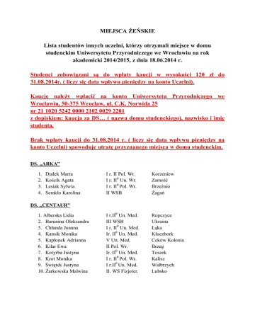 MIEJSCA ŻEŃSKIE Lista studentów innych uczelni, którzy otrzymali miejsce w domu studenckim Uniwersytetu Przyrodniczego we Wrocławiu na rok akademicki 2014/2015, z dnia 18.06.2014 r. Studenci zobowiązani są do wpłaty kaucji w wysokości 120 zł do 31.08.2014r. ( liczy się data wpływu pieniędzy na konto Uczelni). Kaucję należy wpłacić na konto Uniwersytetu Przyrodniczego we Wrocławiu, 50-375 Wrocław, ul. C.K. Norwida 25 nr 21 1020 5242 0000 2102 0029 2201 z dopiskiem: kaucja za DS… ( nazwa domu studenckiego), nazwisko i imię studenta. Brak wpłaty kaucji do 31.08.2014 r. ( liczy się data wpływu pieniędzy na konto Uczelni) spowoduje utratę przyznanego miejsca w domu studenckim. DS. „ARKA” 1. 2. 3. 4. Dudek Marta Kościk Agata Lesiak Sylwia Semkło Karolina I r. II Pol. Wr. I r. II0 Un. Wr. I r. II0 Pol. Wr. II WSB Korzeniew Zamość Brzeźnio Żagań I r.II0 Un. Med. III WSB I r. II0 Un. Med. Ir. II0 Un. Med. V Un. Med. II Pol. Wr. Ir. II0 Un. Med. I r. II0 Pol. Wr. I r.II0 Un. Med. II. WS Fizjoter. Ropczyce Ukraina Łąka Kluczbork Ceków Kolonia Brzeg Toszek Kalisz Wałbrzych Lubsko DS. „CENTAUR” 1. Alberska Lidia 2. Barunina Oleksandra 3. Chłanda Joanna 4. Kansik Monika 5. Kapłonek Adrianna 6. Kilar Ewa 7. Kotyrba Justyna 8. Krot Monika 9. Świątek Justyna 10. Żarkowska Malwina DS. „LABIRYNT” 1. Augustyn Karolina 2. Cichosz Alicja 3. Cywińska Natalia 4. Frydlewska Paulina 5. Kowalczyk Roksana 6. Kudaś Katarzyna 7. Siedlarz Marta 8. Temel Anna 9. Walczak Roksana 10. Wiercińska Anna IV Pol. Wr. III Pol. Wr. I r. II0 Pol.Wr. III Pol. Wr. I r. II0 Pol.Wr. IV Un. Med. IV Pol.Wr. IV Pol.Wr. IV Pol. Wr. II Un.Med. Biała Łubnice Częstochowa Niwnica Myszków Jastrzębniki Ząbkowice Śl. Świnna Bolesławiec Nysa II Pol. Wr. I r. II0 Pol. Wr. I r. II0 Pol. Wr. III Pol. Wr. IV Un. Ekon. I r. II0 Pol. Wr. III Pol. Wr. I r. II0 Pol. Wr. II Pol. Wr. II Un. Med. II Pol. Wr. I r. II0 Un.Med. Kielce Galewice Dziadowa Kłoda Legnica Sieroszewice Brąszewice Niemodlin Zelów Ziębice Łaziska Górne Kramsk Kępno warunkowo I r. II0 Pol. Wr. IV Pol. Wr. II Un. Wr. II Un. Wr. II Pol. Wr. IV Pol. Wr. Borów Borów Pluchy Dzielnica Rudniki Sieradz 1. Chmielowicz Anna 2. Kabata Anita 3. Nowak Nicole II Un. Med. I r. II0 Pol. Wr. I r. II0 Un. Wr. Gryfice Jaworzno Bankowe Kalisz 4. Nöfer Patricia II SWPS Kolonia/Niemcy DS. „TALIZMAN” 1. Cyrnek Karolina 2. Fras Monika 3. Gajda Monika 4. Gdula Karolina 5. Krawczyk Paulina 6. Kurzaj Agnieszka 7. Makles Paulina 8. Matys Ewa 9. Prusko Paulina 10. Sziling Patrycja 11. Robak Natalia 12. Zimoch Paulina DS. „ZODIAK” 1. 2. 3. 4. 5. 6. Bundz Elżbieta Bundz Ewa Gnacy Ewelina Niwka Klaudia Siekacz Anna Sikorska Wioleta DS. „RAJ”