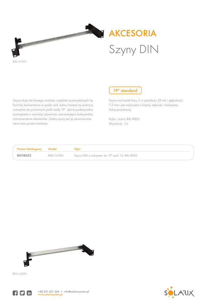 akcesoria Szyny DIN RAIL-1U-DIN 19" standard Szyna służy do łatwego montażu urządzeń przemysłowych np. Switchy, konwerterów w szafie rack. Łatwy montaż za pomocą uchwytów do pionowych profili szafy 19". Jest to profesjonalne rozwiązanie o wysokiej sztywności umożiwiające funkcjonalne rozmieszczenie elementów. Zaletą szyny jest jej ekonomiczna cena oraz prosta instalacja. Szyna ma kształt litery U o szerokości 35 mm i głębokości 7,5 mm i jest wykonana z blachy stalowej i malowana farbą proszkową. Kolor: czarny RAL 9005 Wysokość: 1U Numer katalogowy Model Opis 80138323 RAIL-1U-DIN Szyna DIN z uchwytem do 19" szaf, 1U, RAL 9005 RAIL-1U-DIN +48 221 021 560 • [email protected] www.solarixsystem.pl