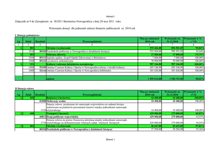 Arkusz1 Załącznik nr 9 do Zarządzenie nr 38/2011 Burmistrza Nowogrodźca z dnia 28 arca 2011 roku Wykonanie dotacji dla jednostek sektora finansów publicznych za 2010 rok I. Dotacje podmiotowe l.p 1 1. 2. 3. Dział Rozdział Wyszczególnienie 2 3 4 801 Oświata i wychowanie 2510 80104 Przedszkole publiczne w Nowogrodźcu ( działalność bieżąca) 851 Ochrona zdrowia 2560 85111 Szpitale ogólne- Zespół Opieki Zdrowotnej w Bolesławcu 2560 85121 Lecznictwo ambulatoryjne 921 Kultura i ochrona dziedzictwa narodowego 2480 92109 Gminne Centrum Kultury i Sportu w Nowogrodźcu (domy i ośrodki kultury) 2480 92116 Gminne Centrum Kultury i Sportu w Nowogrodźcu (biblioteki) ogółem Plan po zmianach 2010 rok 5 935 466,00 935 466,00 37 000,00 7 000,00 30 000,00 987 166,00 685 346,00 301 820,00 1 959 632,00 Wykonanie na Wykonanie w % 31.12.2010 ( 7:5) 7 8 896 581,05 95,84% 896 581,05 95,84% 100,00% 37 000,00 7 000,00 100,00% 30 000,00 100,00% 987 166,00 100,00% 685 346,00 100,00% 301 820,00 100,00% 1 920 747,05 98,02% II Dotacje celowe l.p 1. 2. 3. Dział Rozdział Wyszczególnienie 010 Rolnictwo i łowiectwo 01008 Melioracje wodne Dotacje celowe przekazane do samorządu województwa na zadania bieżące realizowane na podstawie porozumień (umów) między jednostkami samorządu 2330 terytorialnego 600 Transport i łączność 60013 Drogi publiczne wojewódzkie Dotacja celowa na pomoc finansową udzielaną między jednostkami samorządu 2710 terytorialnego na dofinansowanie własnych zadań własnych bieżących 801 Oświata i wychowanie 80104 Przedszkole publiczne w Nowogrodźcu ( działalność bieżąca) Strona 1 Plan po zmianach 2010 rok 10 400,00 10 400,00 Wykonanie na Wykonanie w % 31.12.2010 (7:5) 10 400,00 100,00% 100,00% 10 400,00 10 400,00 429 000,00 429 000,00 10 400,00 279 000,00 279 000,00 100,00% 65,03% 65,03% 429 000,00 46 647,00 37 288,00 279 000,00 45 625,80 36 266,80 65,03% 97,81% 97,26% Arkusz1 Dotacje celowe przekazane gminie za zadania bieżące realizowane na podstawie 2310 porozumień (umów) między jednostkami samorządu terytorialnego 80146 Dokształcanie i doskonalenie nauczycieli Dotacje celowe przekazane dla powiatu na zadania bieżące realizowane na podstawie 2320 porozumień (umów) między jednostkami samorządu ogółem 37 288,00 36 266,80 97,26% 9 359,00 9 359,00 100,00% 9 359,00 9 359,00 100,00% 486 047,00 335 025,80 68,93% III. Dotacje celowe - inwestycyjne lp Dział Rozdział 1 600 2. 851 Plan po zmianach 2010 rok Wyszczególnienie Transport i łączność 60014 Drogi publiczne powiatowe Dotacja celowa na pomoc finansową udzielaną między jednostkami samorządu terytorialnego na dofinansowanie własnych zadań inwestycyjnych i zakupów 6300 inwestycyjnych Ochrona zdrowia 85117 Zakłady opiekuńczo -lecznicze i pilęgnacyjno -opiekuńcze Dotacja celowa z budżetu na finansowanie lub dofinansowanie kosztów realizacji 6220 inwestycji i zakupów inwestycyjnych jednostek sektora finansów publicznych ogółem Strona 2 Wykonanie na 31.12.2010 Wykonanie w % 7:5) ( 516 254,82 516 254,82 511 876,05 511 876,05 99,15% 99,15% 516 254,82 180 000,00 180 000,00 511 876,05 180 000,00 180 000,00 99,15% 100,00% 100,00% 180 000,00 180 000,00 100,00% 696 254,82 691 876,05 99,37%
