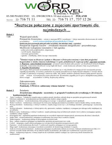 05-500 PIASECZNO TEL/FAX 22- 716 71 K. Orłowski, V. Wojeńska UL. DWORCOWA 18 lokal użytkowy 4 POLAND 11 TEL 22- 716 71 17 , 737 12 26 *Roztocze połączone z zajęciami sportowymi dla najmłodszych ... Dzień 1 7.00 Wyjazd spod szkoły. Przejazd do Zwierzyńca – wizyta w muzeum RPN ( zwiedzanie + lekcje muzealne dostosowane do wieku uczestników) www.roztoczanskipn.pl/przedszkole/c3.html konieczna jest rezerwacja min poł roku wcześniej (na miesiące maj – czerwiec) Przejazd do Zagrody Guciów – zwiedzanie muzeum etnograficzno - przyrodniczego. Możliwość wykupienia warsztatów i/ lub ogniska: - pokaz pieczenia podpłomyków, degustacja; - wyrób masła, degustacja; - warsztaty garncarskie; - ognisko z kiełbaską, chleb, keczup i musztarda; *Zamiast wizyty na Roztoczu i pobytu w Muzeum w Zwierzyńcu możemy w tym dniu przyjechać bezpośrednio w okolice Janowa Lubelskiego i w godz. południowych rozpocząć pobyt zajęciami survivalu 1. Wyprawa samochodami terenowymi - przejazd samochodami jako pasażer po bezdrożach leśnych (bagna, mokradła, wzniesienia (możliwość wersji light lub hard – wtedy konieczne ubranie i buty na przebranie!) 2. Zagadka Kryminalna: Jest to gra, która pozwala uczestnikom na wcielenie się w rolę detektywów mających do rozwiązania pewną zagadkę kryminalną. Uczestnicy podzieleni na zespoły poszukiwawcze będą musieli odnaleźć w terenie ukryte szczątki 25 informacji związanej z śmiercią wilka. Aby zdobyć niektóre elementy historii będą musieli stawiać czoła różnym wyzwaniom fizycznym umysłowym. Kryminalna zagadka jest to gra o skomplikowanej fabule, która wciąga uczestników w dobrą, bezpieczną zabawę. Zakwaterowanie. Kolacja na ciepło. Podchody. UWAGA: zabieramy własne latarki! Nocleg. Dzień 2 • • • • • • • • • • • • • • • Śniadanie. Zwariowana olimpiada - uczestnicy w grupach 5-osobowych rywalizują w 20 różnych konkurencjach np.: Narty 5-osobowe – członkowie zespołu mają za zadanie przejść określony odcinek drogi na specjalnie przygotowanych nartach. Głównym zadaniem w tej konkurencji jest skoordynowanie ruchów całego zespołu. Spodnie 5-osobowe - wesoła konkurencja, która polega na wyścigu w specjalnych, gigantycznych spodniach. Worki 5-osobowe – konkurencja z dziecięcych lat, która przy dopingu pozostałych uczestników stanowi bardzo dobrą, wesołą zabawę. Wyścig chomików – konkurencja, w której 5-osobowe zespoły mogą wczuć się w „los biednego chomika”, pokonującego wyznaczoną trasę. Wyścig rydwanów – konkurencja, w której oprócz siły, sprawności, zaufania, współpracy, wymagana jest odwaga osoby znajdującej się na rydwanie. Bolkowe narty - konkurencja, w której 5-osobowe zespoły pokonują trasę na bolkowych nartach. Jest to zabawa wymagająca zgrania, współpracy całego zespołu. Przeciąganie liny - najbardziej popularna konkurencja na wszystkich imprezach integracyjnych, przeznaczona dla dzieci i dorosłych. Siatka Tekli - wesoła konkurencja polegająca na pokonaniu sieci przez dwa 6 osobowe zespoły. Walka kogutów – konkurencja polega na przeciąganiu się dwóch osób. Rura - zadanie zespołowe polegające na napełnieniu specjalnie przygotowanej rury wodą. Cyrkiel – integrująca zespół zabawa polegająca na wyścigu dwóch specjalnie przygotowanych cyrkli. Gąsienica - wesoła konkurencja dla trzech 5 osobowych zespołów, polegająca na wyścigu gąsienic. Mega supeł - konkurencja zmuszająca wszystkich uczestników do kreatywnego działania w zespole. Jazda na rowerze przeciwskrętnym – konkurencja polegająca na pokonaniu slalomu na rowerze. Jedynym utrudnieniem jest fakt, iż w rowerze wszystko działa odwrotnie. W tej zabawie można się przekonać, jak trudno jest wyeliminować wyuczone nawyki. Obręcz – konkurencja logiczna, w której zespół ma do wykonania zadanie wydające się w pierwszej chwili niemożliwe do zrealizowania! LUB Marsz na orientację - pozwala uczestnikom na wykazanie się pomysłowością, umiejętnością czytania map, posługiwania się kompasem, orientacji w terenie oraz współdziałania w grupie. Program zajęć: - przeszkolenie z czytania mapy, topografii i orientacji w terenie; - podział na grupy do 15 osób – na każdą grupę przypada 1 instruktor; - instruktaż jak postępować w przypadku zgubienia się w terenie. 18.30-19.30 Długości tras dostosowane są do wieku uczestników. Obiad w hotelu. Wyjazd z ośrodka. Powrót pod szkołę. KOLEJNOŚĆ ZWIEDZANIA MOŻE ULEC ZMIANIE Świadczenia: - transport lux autokarem marki, np. Mercedes, Volvo, Scania, MAN, Neoplan z WC, DVD, barkiem, uchylnymi siedzeniami - zakwaterowanie w hotelu, pensjonacie, ośrodku wypoczynkowym, pokoje z łazienkami lub studio - wyżywienie zgodnie z programem - realizacja programu turystycznego - opieka pilota - ubezpieczenie NW 5000 zł - VAT - grupy 30 os. - 2 miejsca gratis dla nauczycieli, od 30 do 45 os. – 3 miejsca gratis dla nauczycieli Cena: 200 zł/min. 40 os. - max. 45 os. płacących Cena: 220 zł/min. 35 os. - max. 39 os. płacących Cena: 240 zł/min. 30 os. - max. 34 os. płacących +dodatkowo bilety wstępu/zajęcia survivalu od 40 do 60 zł/os. (kwota ta jest uzależniona od konkretnych punktów programu, którymi jesteście Państwo zainteresowani) Standardowy rozmiar naszych autokarów to 49 miejsc (do dyspozycji grupy wraz z opiekunami). Na Państwa życzenie możemy zarezerwować autokary 57-70 miejsc (w tym przypadku prosimy o kontakt z biurem w celu sprawdzenia kalkulacji na ponadstandardowy pojazd i jego dostępności w wybranym przez Państwa terminie). ZAJĘCIA SPORTOWE - W cenę wliczono przygotowanie i realizację wybranego pakietu, profesjonalną obsługę (wykwalifikowaną kadrę, atestowany sprzęt), niezbędne materiały do przeprowadzenia zajęć i bezpieczeństwa podczas ich organizacji, dojazd instruktorów. Firma organizująca zajęcia rekreacyjno-sp