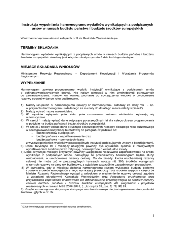 Instrukcja wypełniania harmonogramu wydatków wynikających z podpisanych umów w ramach budżetu państwa i budżetu środków europejskich Wzór harmonogramu stanowi załącznik nr 9 do Kontraktu Wojewódzkiego. TERMINY SKŁADANIA Harmonogram wydatków wynikających z podpisanych umów w ramach budżetu państwa i budżetu środków europejskich składany jest w trybie miesięcznym do 5 dnia każdego miesiąca. MIEJSCE SKŁADANIA WNIOSKÓW Ministerstwo Rozwoju Regionalnych. Regionalnego – Departament Koordynacji i Wdrażania Programów WYPEŁNIANIE 1 Harmonogram zawiera prognozowane wydatki Instytucji wynikające z podpisanych umów o dofinansowanie/wydanych decyzji. Nie należy ujmować w nim umów/decyzji planowanych do zawarcia/wydania. Stanowi on również podstawę do sporządzenia wniosku o uruchomienie rezerwy celowej w danym roku budżetowym. 1) Należy uzupełnić nr harmonogramu (kolejny nr harmonogramu składany za dany rok - np. w przypadku harmonogramu składanego za m-c luty do dnia 5-go marca należy wpisać 2). 2) Należy wpisać nazwę województwa. 3) IZ wypełnia wyłącznie pola białe, pola zaznaczone kolorem niebieskim wyliczają się automatycznie. 4) W części 1 należy wpisać dane dotyczące poszczególnych lat dla całego okresu programowania w podziale na budżet państwa i budżet środków europejskich. 5) W części 2 należy wpisać dane dotyczące poszczególnych miesięcy bieżącego roku budżetowego w szczegółowości klasyfikacji budżetowej do paragrafu w podziale na: budżet środków europejskich, budżet państwa - współfinansowanie oraz budżet państwa – pomoc techniczną z wyszczególnieniem wydatków poszczególnych Instytucji podpisujących umowy z beneficjentami. 6) Dane dotyczące lat i miesięcy ubiegłych powinny być wykazane zgodnie z rzeczywistym wydatkowaniem środków przez Instytucję, pomniejszone o ewentualne zwroty. 7) Dane dotyczące miesięcy przyszłych powinny uwzględniać rzeczywiste zapotrzebowanie na środki wynikające z podpisanych umów, pamiętając że przedmiotowy harmonogram będzie służył wnioskowaniu o uruchomienie rezerwy celowej. Co do zasady, kwota uruchamianej rezerwy celowej nie może być w poszczególnych transzach wyższa niż 30% środków dostępnych w ramach rezerwy na dany rok budżetowy, z wyjątkiem szczególnie uzasadnionych przypadków. 8) W przypadku, gdy w miesiącu złożenia harmonogramu poziom wykonania budżetu państwa i budżetu środków europejskich z niego wynikający przekroczy 70% środków ujętych w części 34 Minister Rozwoju Regionalnego wystąpi z wnioskiem o uruchomienie rezerwy celowej zgodnie z zasadami określonymi Kontrakcie Wojewódzkim oraz Procedurze uruchamiania oraz przyznawania zapewnienia finansowania lub dofinansowania przedsięwzięcia ze środków rezerwy celowej budżetu państwa i budżetu środków europejskich dla programów i projektów realizowanych w ramach NSS 2007-2013, (…) z części 83, poz. 8, 19, 98, 99. 9) Część harmonogramu dotycząca bieżącego roku budżetowego nie jest ograniczona do wysokości środków ujętych w cz. 34. 1 IZ lub inne Instytucje dokonujące płatności na rzecz beneficjentów. 1 Uwagi: 1. W wyjątkowych przypadkach, gdy z analizy dotychczasowego wydatkowania oraz stanu środków pozostających w dyspozycji instytucji wynika, iż zapotrzebowanie Instytucji na środki rezerwy celowej zostało znacząco przeszacowane MRR może przekazać środki w wysokości niższej niż wnioskowana. 2. Po uruchomieniu środków z rezerwy celowej następna rezerwa celowa może być uruchomiona w przypadku wykorzystania 70% środków z części 34 łącznie z uruchomionymi już rezerwami. 3. W odniesieniu do lat 2007-2009, gdy nie funkcjonował budżet środków europejskich należy wpisywać środki zgodnie z klasyfikacją budżetową: „8” w budżecie środków europejskich; „9” w budżecie państwa. 4. W przypadku harmonogramu składanego do dnia 5 stycznia każdego roku należy złożyć jego dwie wersje. Pierwsza wersja powinna ujmować zaktualizowane dane dotyczące roku ubiegłego na dzień 31 grudnia (jest składana w celach sprawozdawczych), natomiast druga wersja powinna dotyczyć roku bieżącego i zawierać prognozę finansową dotyczącą wydatków w tym roku (jest składana w celu wypełnienia obowiązku wynikającego z przepisów ustawy o finansach publicznych). 2